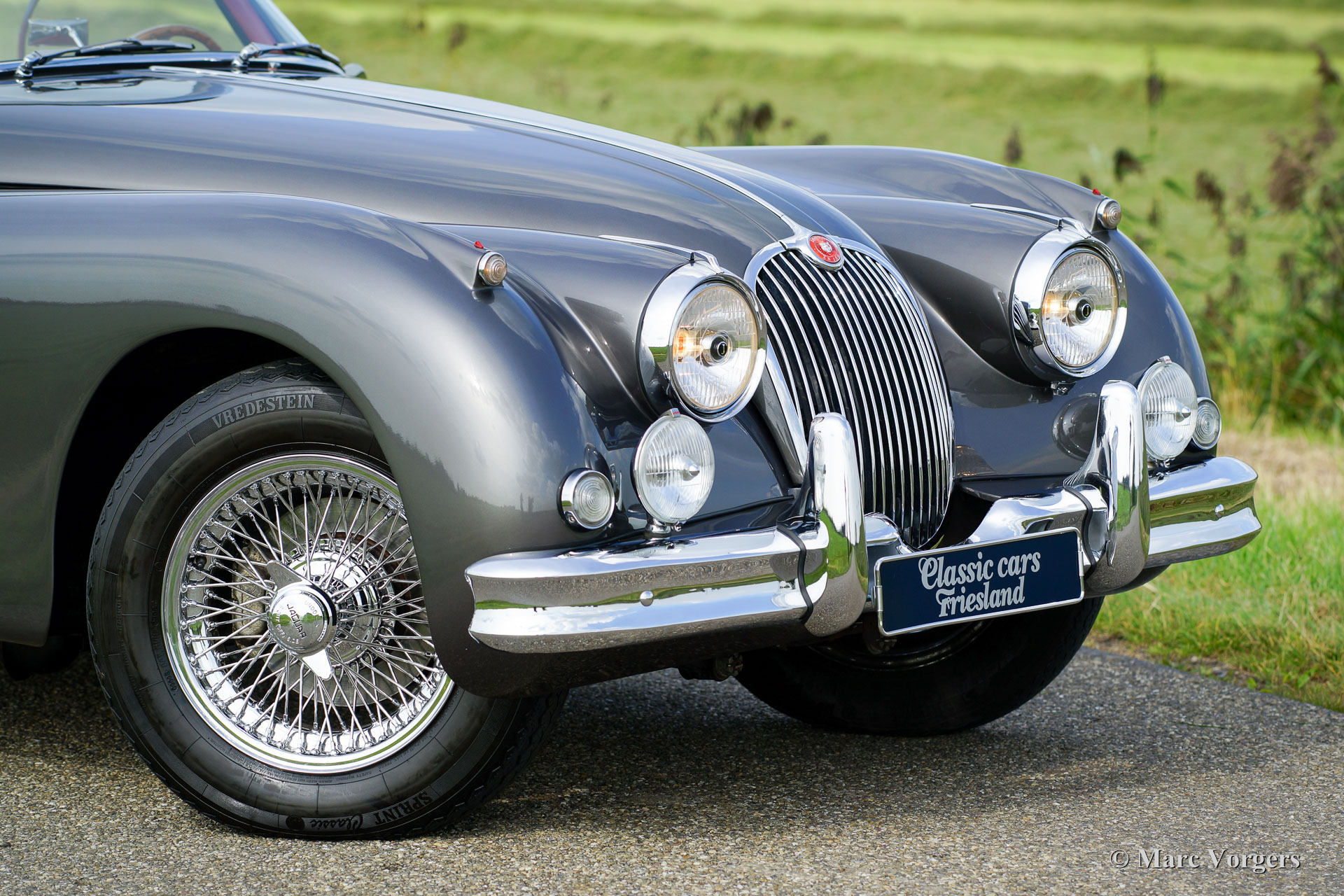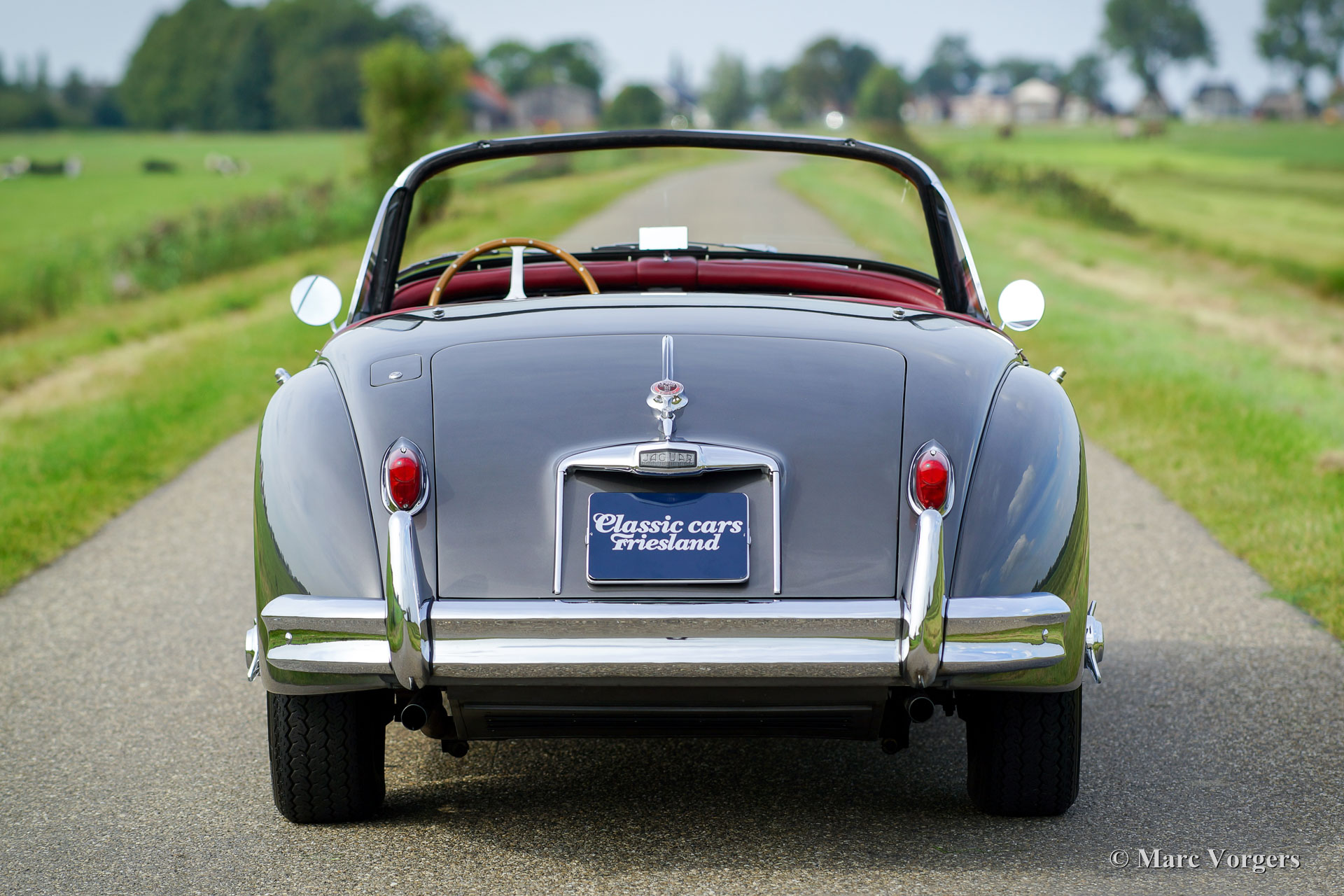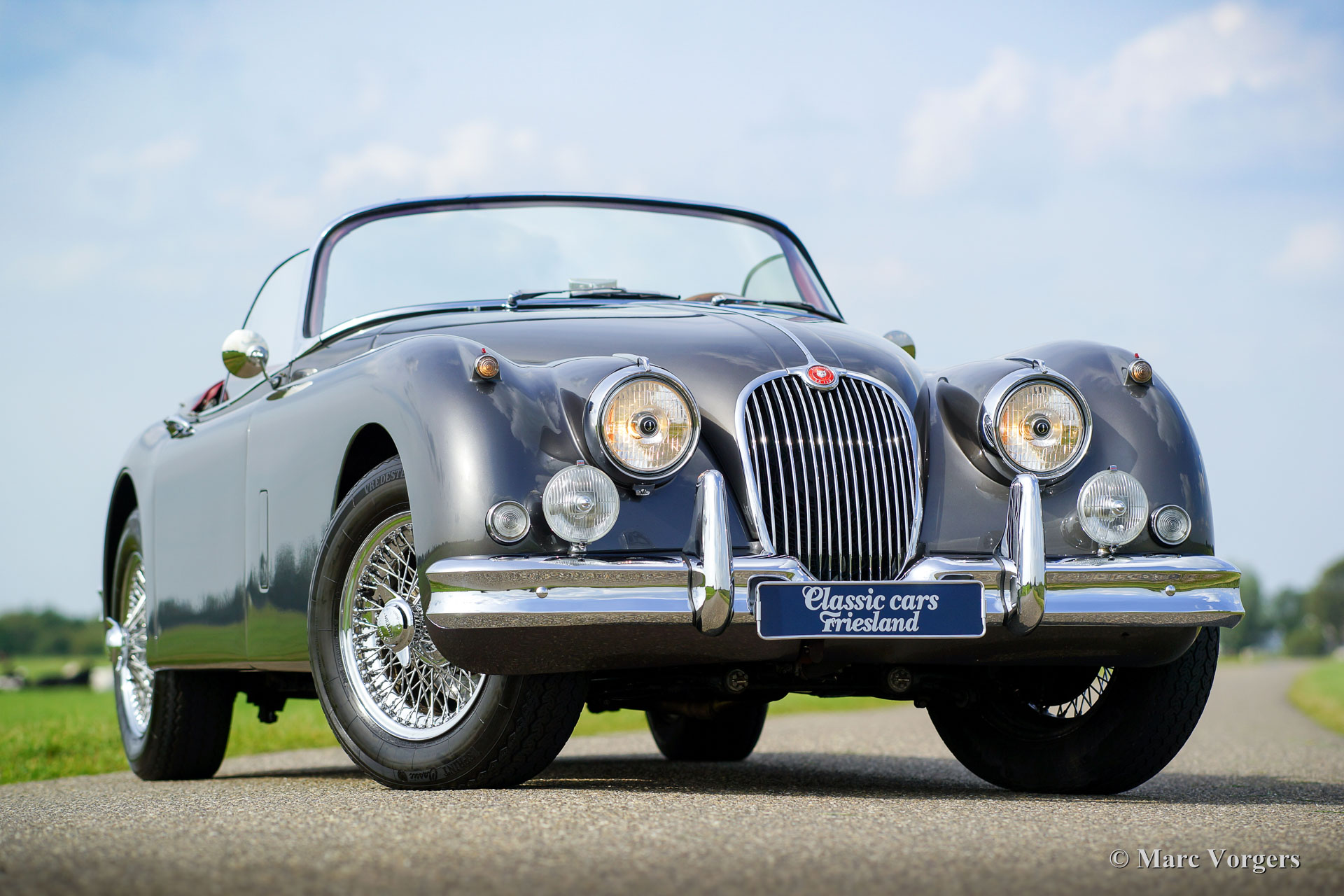 Jaguar XK 150 3.4 Litre OTS, jaar 1958. Kleur donkergrijs metallic (Gunmetal Grey) met een donkerrood vol-lederen interieur en een prachtig dashboard van wortelnotenhout. Rood tapijt, zwarte mohair soft-top en tonneaucover. Deze oogstrelend fraaie Jaguar XK 150 OTS (Open Two Seater – ook wel Roadster genoemd) werd in het verleden volledig en ‘body-off’ gerestaureerd door specialist Brooklands Classic Cars in Veenendaal. Een complete fotoreportage van de restauratie is aanwezig evenals een dossier met daarin alle onderhoudsfacturen en het onderhoudsschema. Ook is het originele instructieboekje present. Deze Jaguar is professioneel gerestaureerd naar een zeer hoge kwaliteitsstandaard; de auto verkeert nog altijd in sublieme conditie. Deze XK 150 is uitgerust met overdrive, een rvs uitlaat, een aluminium radiator, elektronische ontsteking, chroom spaakwielen met Vredestein Classic banden, rembekrachtiging, stuurbekrachtiging, originele Lucas mistlampen, een MotoLita stuur met houten rand, massa schakelaar en boordgereedschap. Dit is een perfect gerestaureerde XK 150 in sublieme staat en in een fantastische kleurcombinatie!