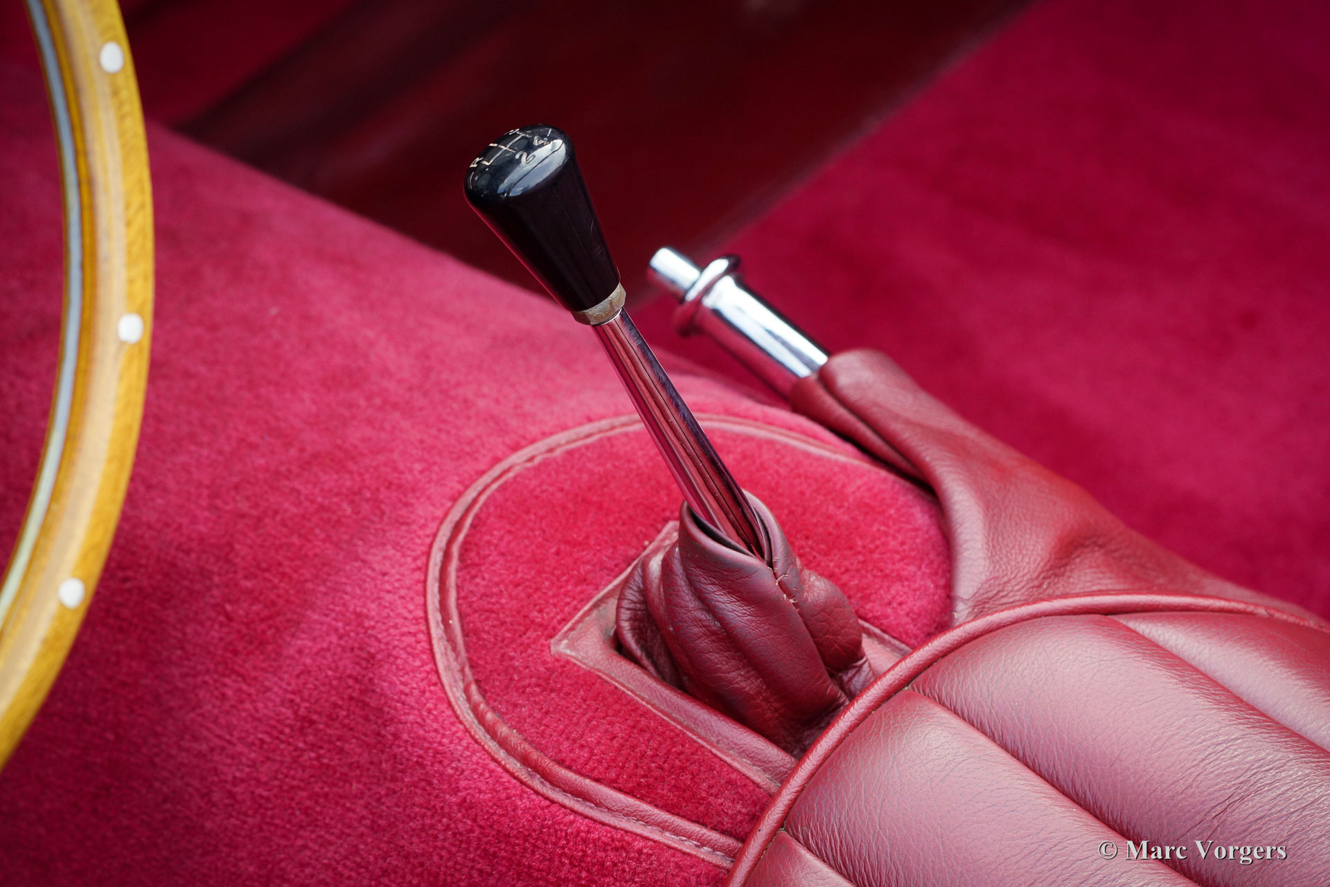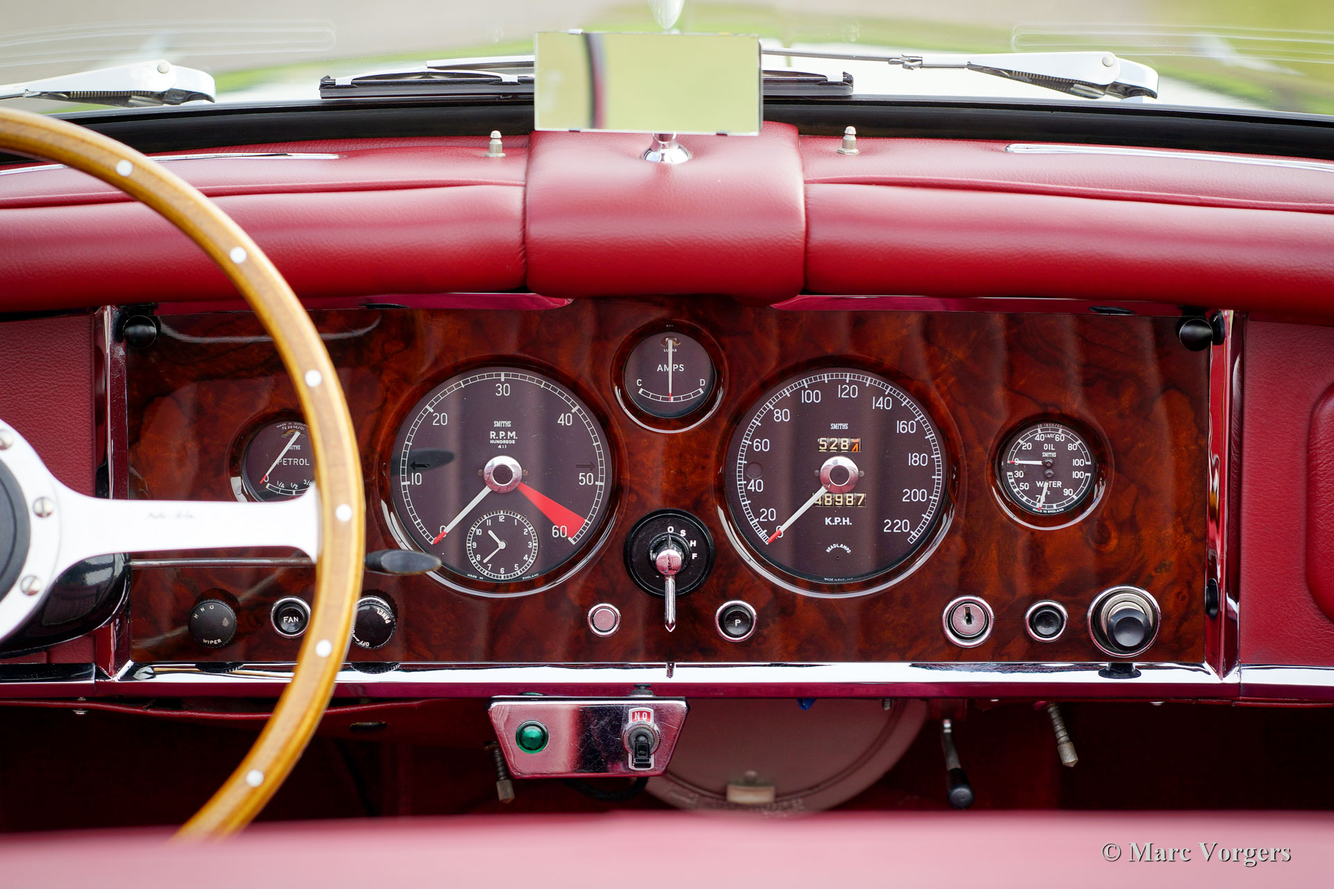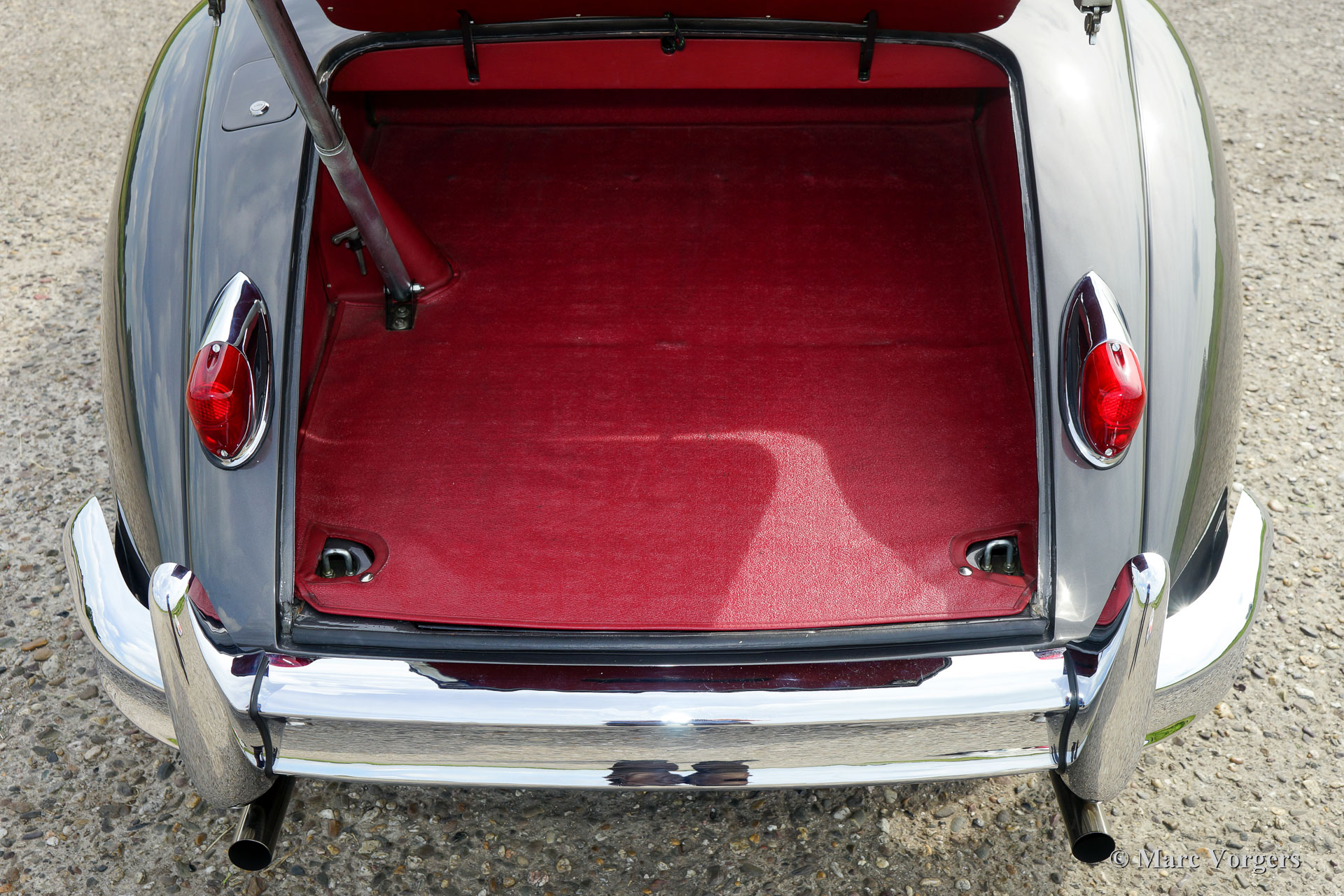 Jaguar XK 150 3.4 Litre OTS, jaar 1958. Kleur donkergrijs metallic (Gunmetal Grey) met een donkerrood vol-lederen interieur en een prachtig dashboard van wortelnotenhout. Rood tapijt, zwarte mohair soft-top en tonneaucover. Deze oogstrelend fraaie Jaguar XK 150 OTS (Open Two Seater – ook wel Roadster genoemd) werd in het verleden volledig en ‘body-off’ gerestaureerd door specialist Brooklands Classic Cars in Veenendaal. Een complete fotoreportage van de restauratie is aanwezig evenals een dossier met daarin alle onderhoudsfacturen en het onderhoudsschema. Ook is het originele instructieboekje present. Deze Jaguar is professioneel gerestaureerd naar een zeer hoge kwaliteitsstandaard; de auto verkeert nog altijd in sublieme conditie. Deze XK 150 is uitgerust met overdrive, een rvs uitlaat, een aluminium radiator, elektronische ontsteking, chroom spaakwielen met Vredestein Classic banden, rembekrachtiging, stuurbekrachtiging, originele Lucas mistlampen, een MotoLita stuur met houten rand, massa schakelaar en boordgereedschap. Dit is een perfect gerestaureerde XK 150 in sublieme staat en in een fantastische kleurcombinatie!