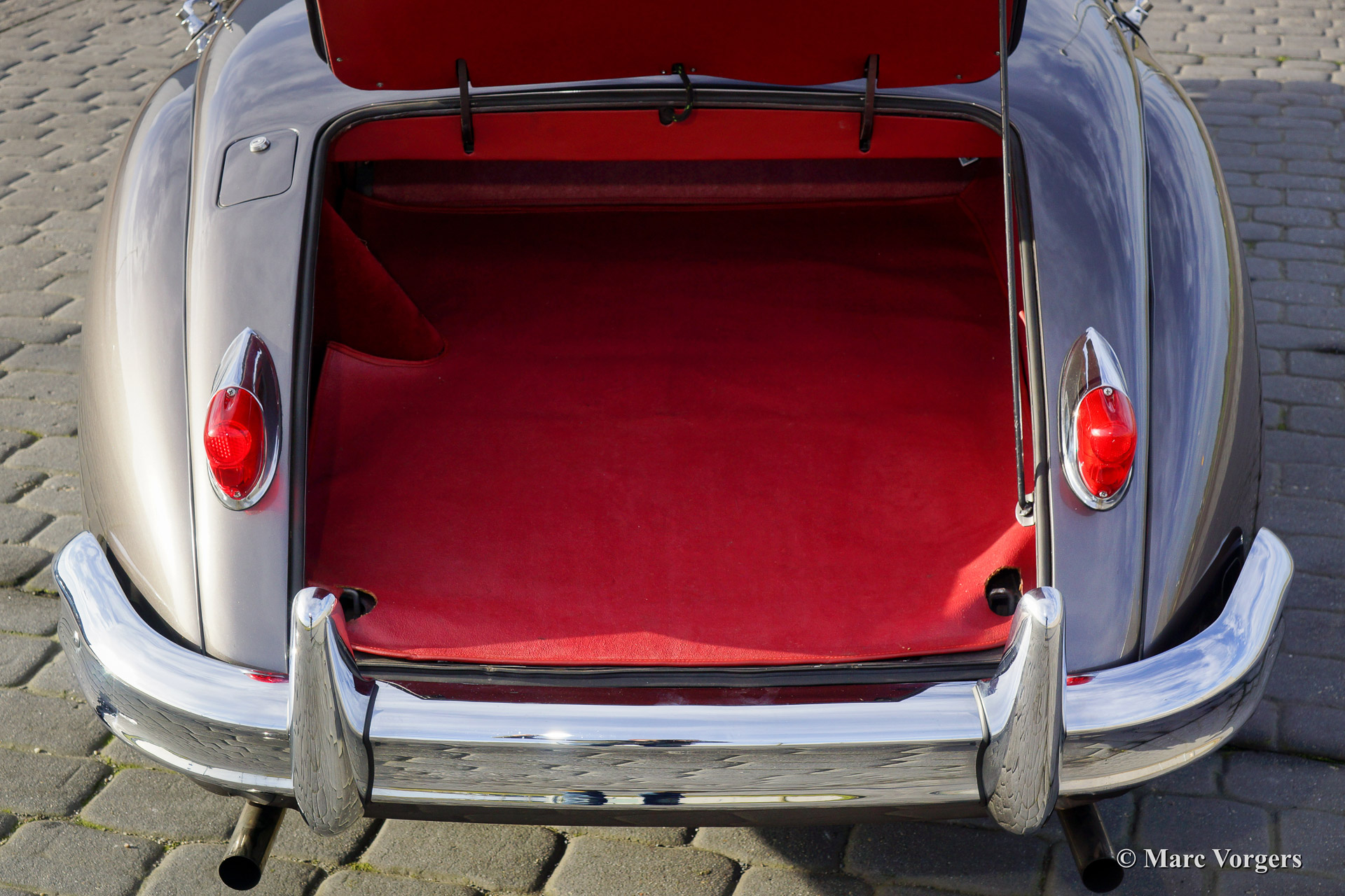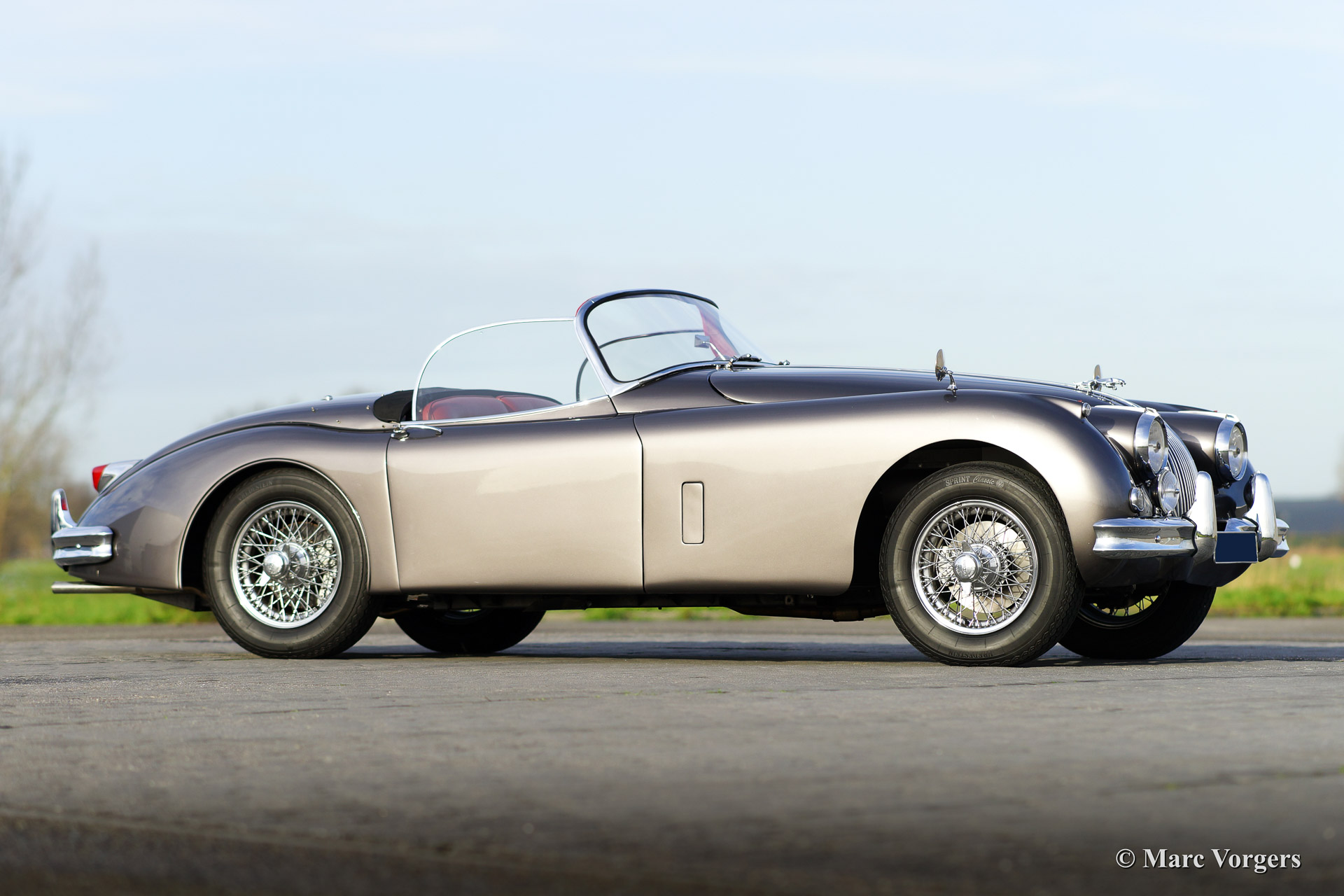 Jaguar XK 150 3.4 Litre S OTS (Open Two Seater), year 1958. Chassis number S831655. Matching numbers and an original S (Special Equipment) model. Colour 'Gun Metal' grey with a red leather interior and red carpet. Black mohair hood. This fantastic Jaguar XK 150 S OTS was extensively restored in the past. The automobile is in excellent condition. This fine Jaguar features a manual gearbox with overdrive and chrome 16" wire wheels. This XK 150 S roadster is clad in the most desirable colours one can wish for. A very desirable and rare original XK 150 S roadster.