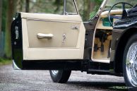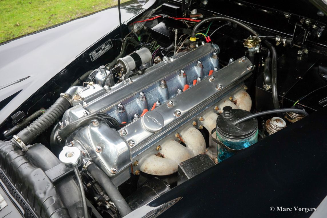 Jaguar XK 150 3.8 Litre DHC, bouwjaar 1960. Kleur zwart met een lichtbeige lederen interieur. Zwarte soft-top. Deze prachtige Jaguar XK 150 Drop Head Coupe (DHC) werd aan het eind van de jaren 1990 ‘body off’ gerestaureerd in Duitsland. Deze Jaguar verkeert in zeer goede tot excellente staat. De auto werd in 2015 in Nederland geïmporteerd. Aansluitend werd de auto grotendeels gedemonteerd, carrosserie kaal gemaakt tot op het metaal en vervolgens van een perfect nieuw laksysteem voorzien. De spiegelgladde zwarte lak combineert prachtig met het sublieme chroom. De 3.8 Liter XK-motor is ‘period correct’ en levert een geweldig koppel. De auto is voorzien van een Getrag 5-versnellingsabak (de originele versnellingsbak wordt meegeleverd). Een prachtige XK 150 DHC 3.8 Litre in een fraaie kleurcombinatie.