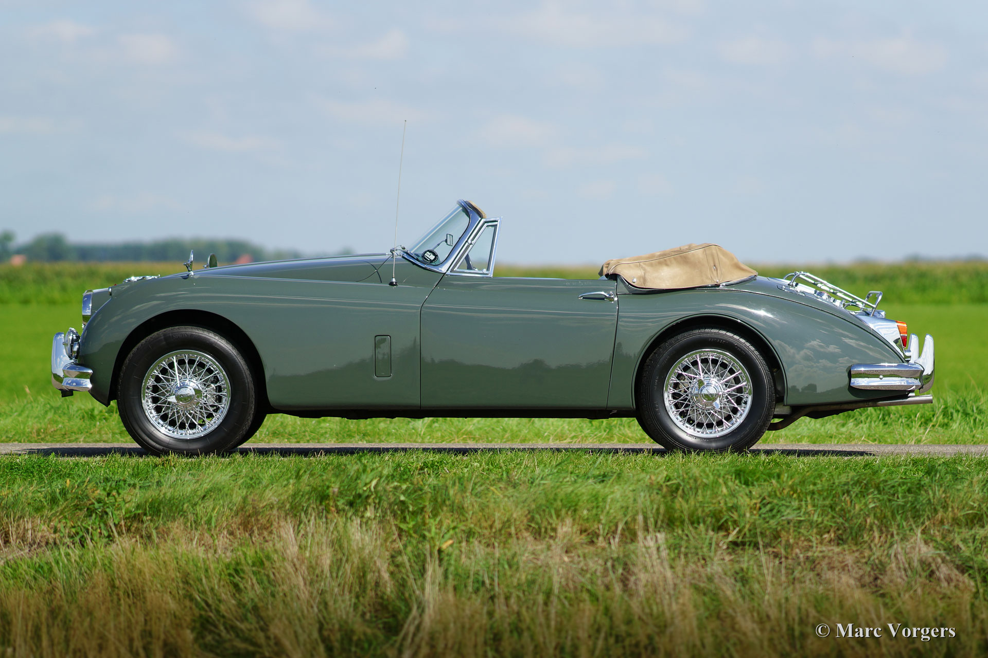 Jaguar XK 150 3.8 Litre Drophead Coupe (DHC), jaar 1960. Kleur ‘Sherwood Green’ met een groen leren interieur en bijpassend tapijt. Deze XK is voorzien van een beige mohair cabrioletkap en ‘hood cover’. Deze geweldige Jaguar XK 150 3.8 Litre DHC is zeer origineel en heeft ‘matching numbers’. Deze super originele Jaguar heeft slechts 73.000 mijl gereden, de auto verkeert in zeer goede tot excellente staat, zeer bijzonder! De perfecte carrosserie werd in het verleden voorzien van nieuwe lak. Het interieur en al het andere is origineel, zelfs het originele boordgereedschap is aanwezig. Deze Jaguar XK 150 is een schaarse 3.8 Liter uitvoering. De auto gaat vergezeld van veel historie, facturen en foto’s die net als de auto zijn gekoesterd. De laatste Nederlandse eigenaar heeft de auto ruim twintig jaar in zijn bezit gehad. De auto is uitgerust met EZ elektrische stuurbekrachtiging, chroom spaakwielen en AVON banden. Dit is een weinig voorkomende kans om in het bezit te komen van een zeer originele, schaarse en subliem rijdende Jaguar XK 150 3.8 Litre DHC!