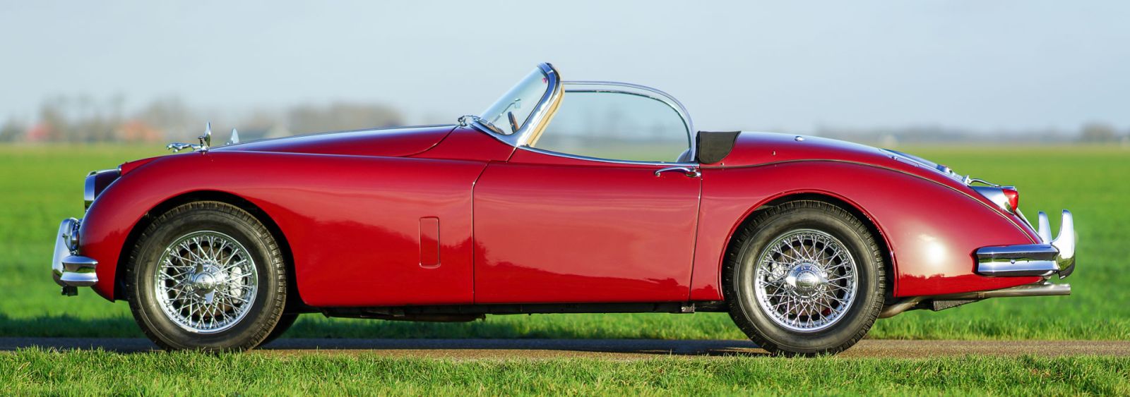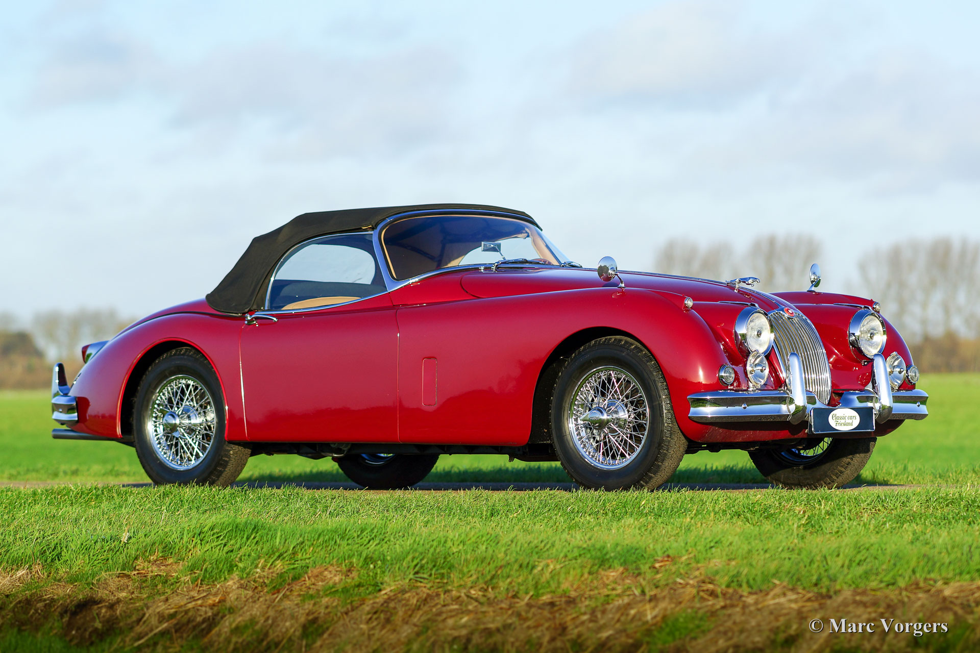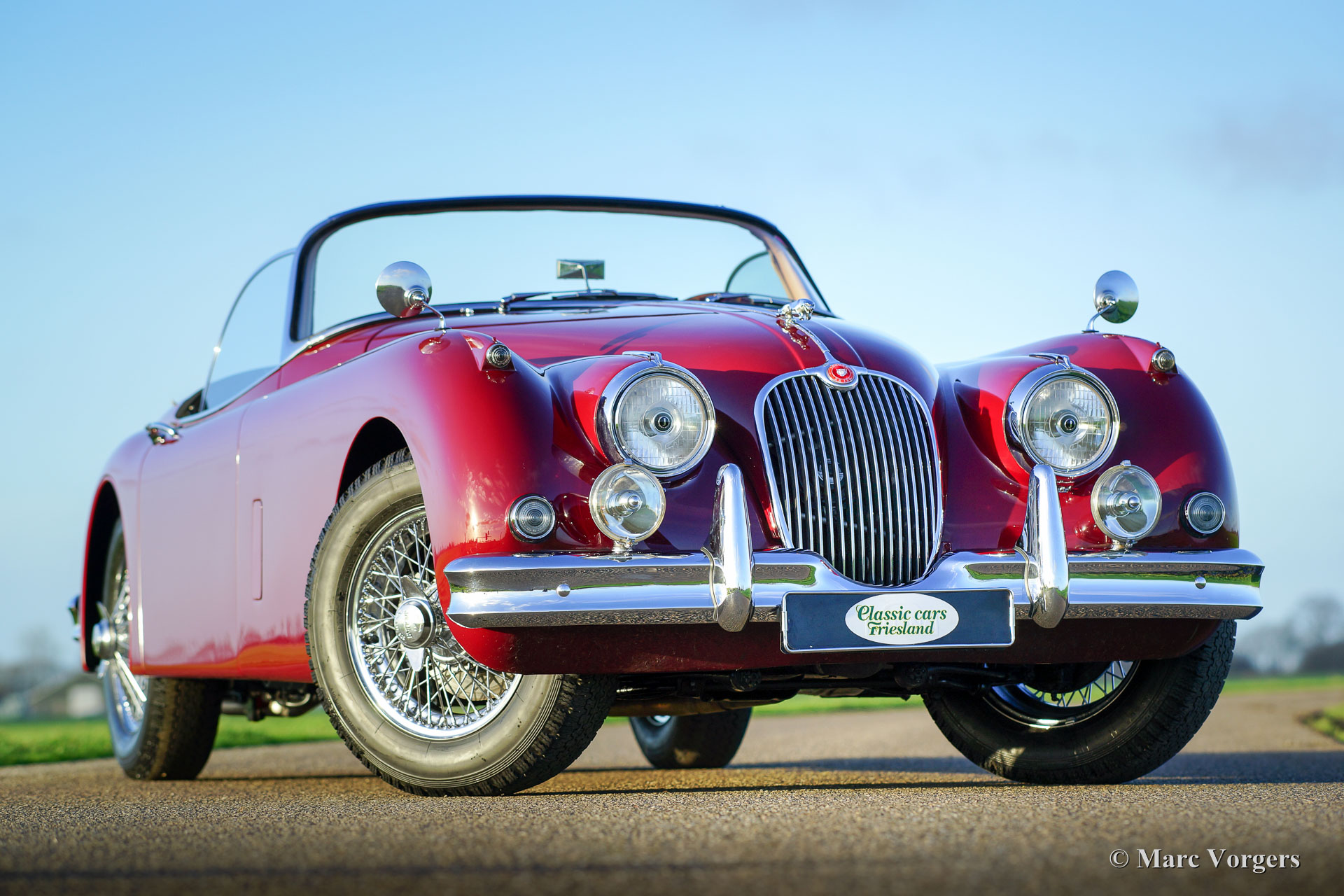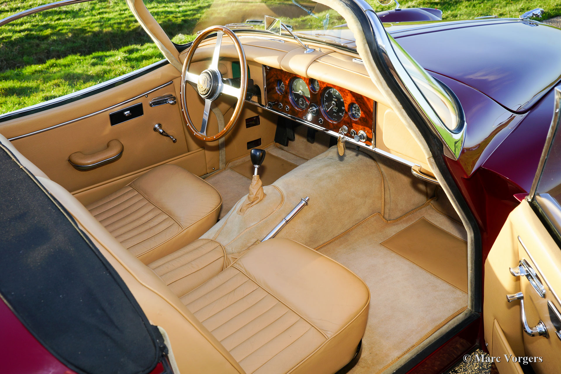Jaguar XK 150 SE OTS, bouwjaar 1958. Kleur ‘Imperial Maroon red’ met een beige lederen interieur en beige tapijt. Zwarte mohair soft-top en een zwarte mohair hood-cover. Deze geweldige en schaarse Jaguar XK 150 SE OTS (Open Two Seater, ook wel roadster genoemd) werd in het verleden uitvoerig en perfect gerestaureerd, de auto verkeert in sublieme topstaat! Een fotoreportage en facturen van de restauratie zijn aanwezig. Het betreft een origineel SE (Special Equipment) model dat af fabriek voorzien is van speciale accessoires en Lucas mistlampen. De auto is voorzien van een vier-versnellingsbak met overdrive (!), een notenhouten dashboard, RVS uitlaat systeem en chroom spaakwielen. Aan de carrosserie werd nooit gelast, het originele en schadevrije plaatwerk toont prachtige passingen en lijnen. De auto is compleet met het originele Instructieboekje, onderdelenboek, XK 150 serviceboek en zelfs de originele gereedschap set.