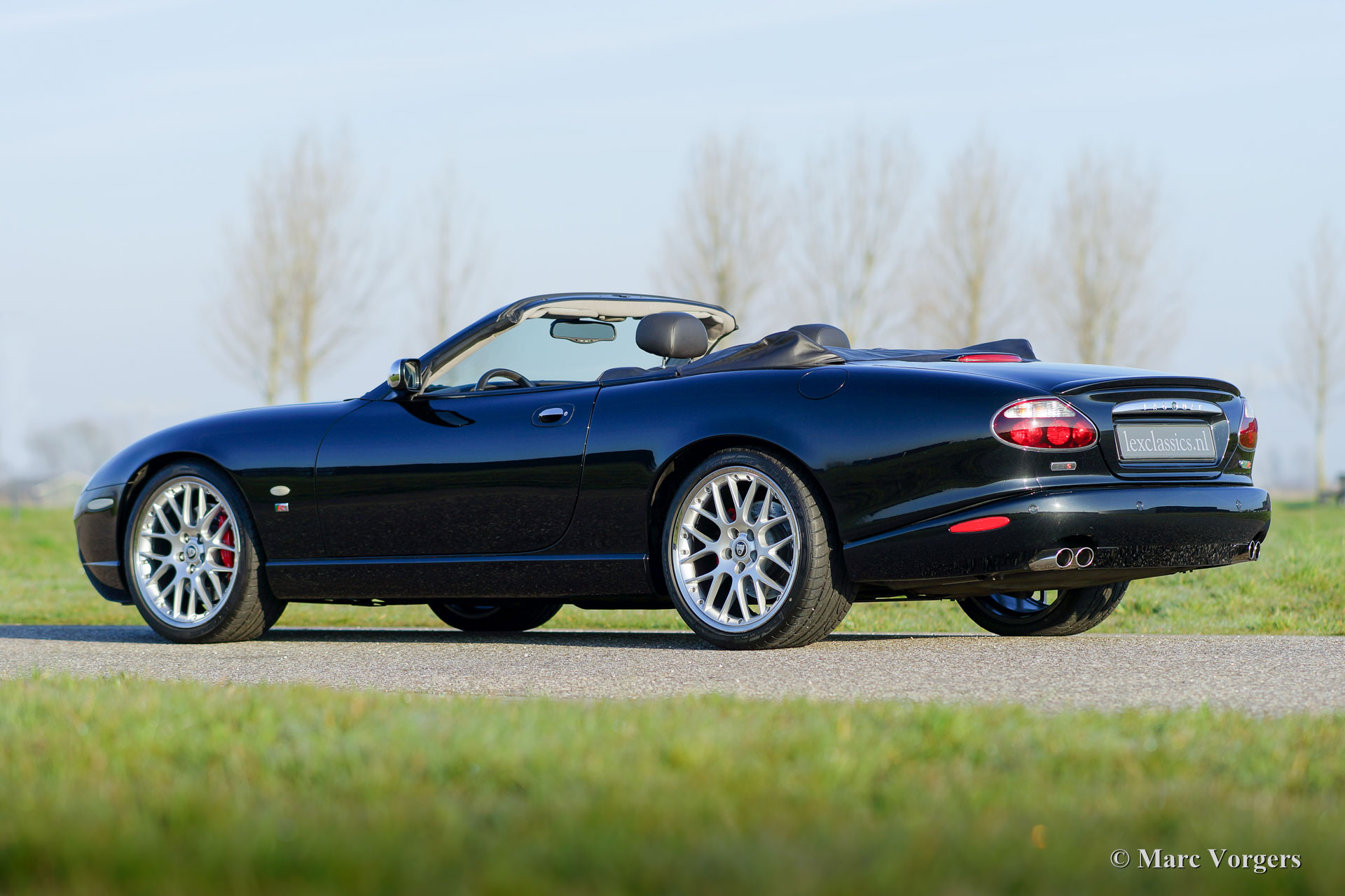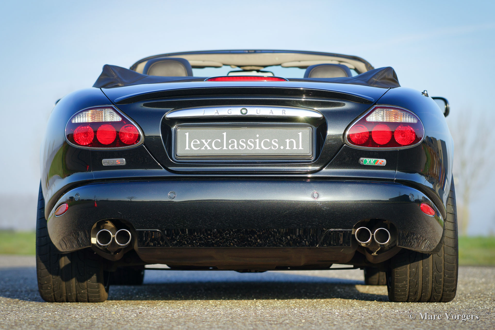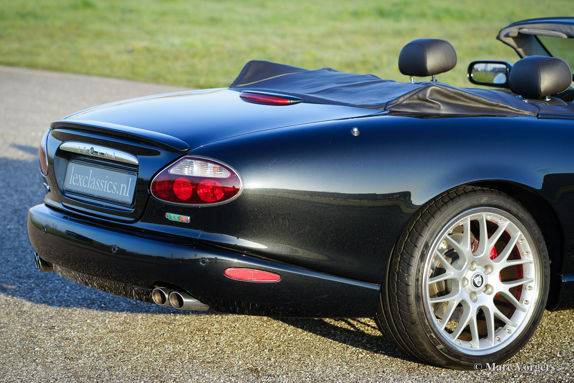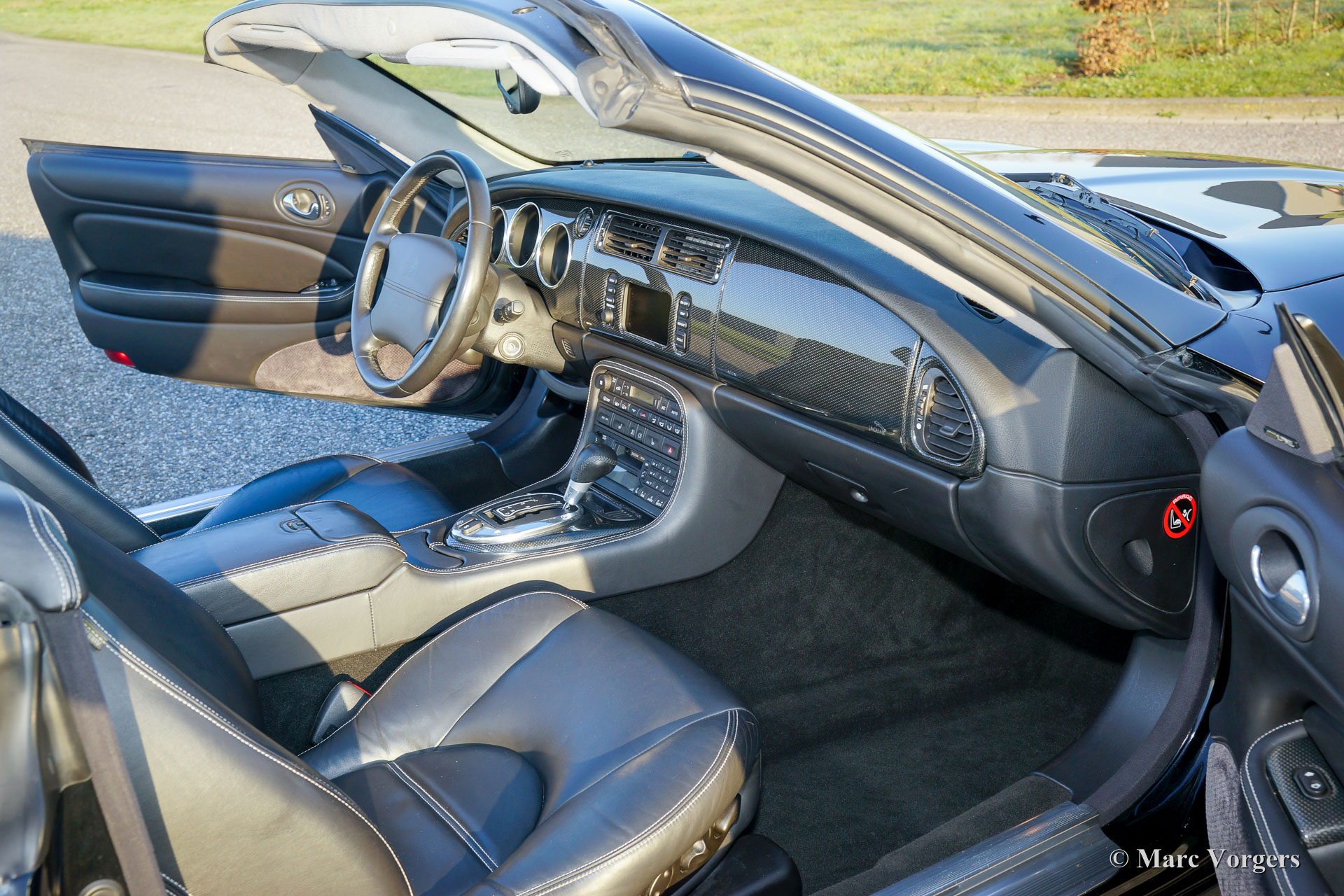 Jaguar XKR 4.2 S convertible (X100), jaar 2005. Kleur zwart metallic met een zwartlederen interieur en donkergrijs tapijt en een zwarte cabrioletkap. Deze zeer indrukwekkende Jaguar XKR 4.2 S werd nieuw verkocht in Italië, de auto is sinds 2011 geregistreerd in Nederland. De auto heeft vanaf nieuw 72.500 kilometer gereden, alle originele boorddocumentatie en het serviceboekje zijn bij de auto aanwezig. Deze fantastische Jaguar XK-R verkeert in sublieme originele staat, nagenoeg als nieuw! Deze XKR 4.2 S komt uit de laatst gebouwde serie; het is het absolute topmodel met een zeer complete optielijst. De auto is onder andere uitgerust met: Xenon-verlichting, 20-inch lichtmetalen Atlas velgen, Navigatie, parkeersensoren achter, cruise control, zelf dimmende binnenspiegel en Brembo remmen. De Jaguar XKR 4.2 S is uitgerust met een krachtige V8 motor voorzien van een ‘supercharger’ waardoor de motor een zeer gezonde 396 pk levert. Het vermogen is te allen tijde paraat voor pijlsnelle acceleratie- en inhaal acties maar de heerlijke V8 overtuigt ook perfect tijdens rustig ‘cruisen’. Een voortreffelijke en indrukwekkende machine in topstaat!