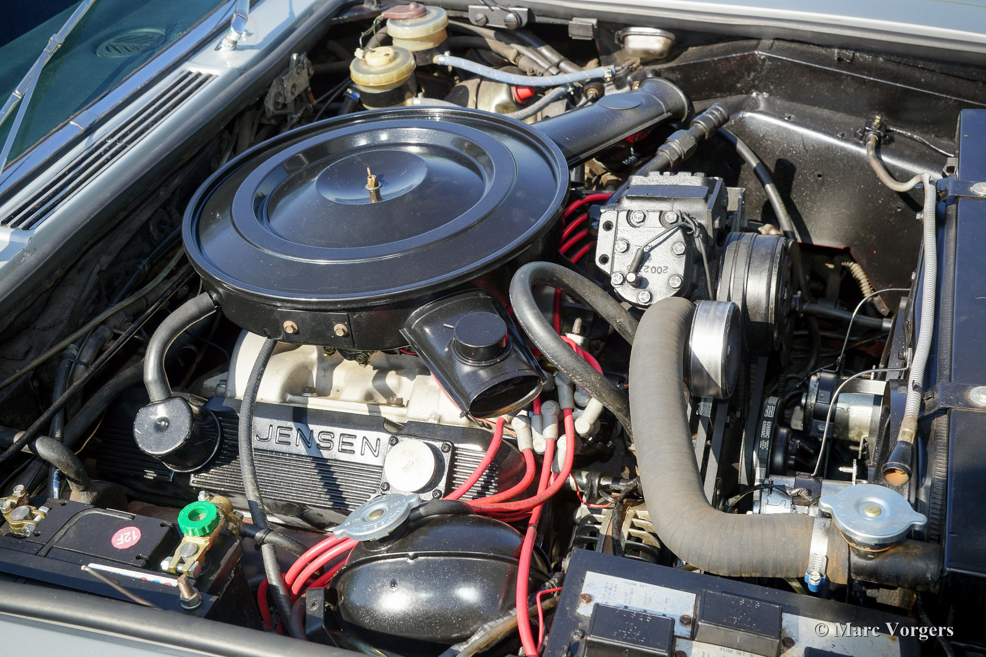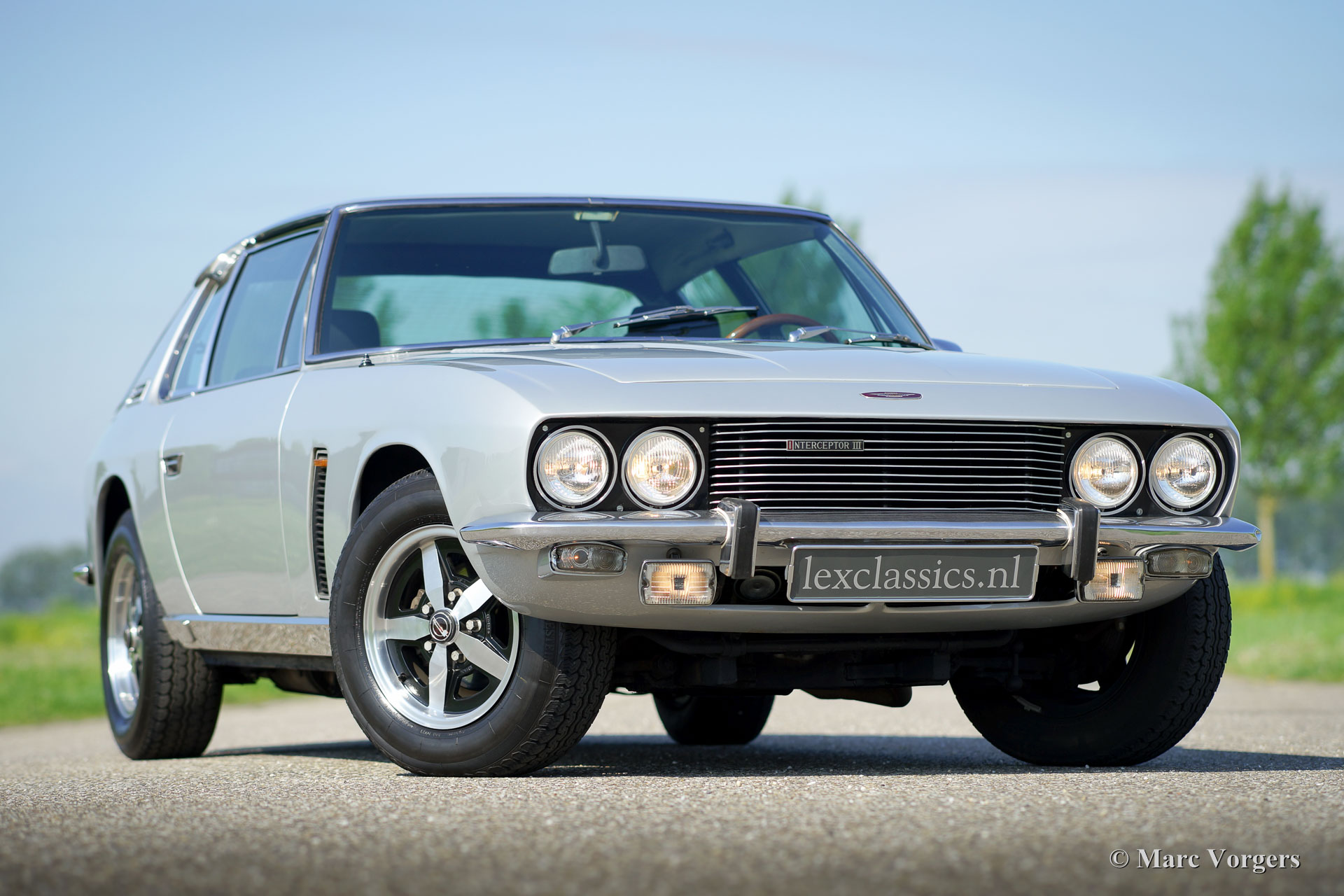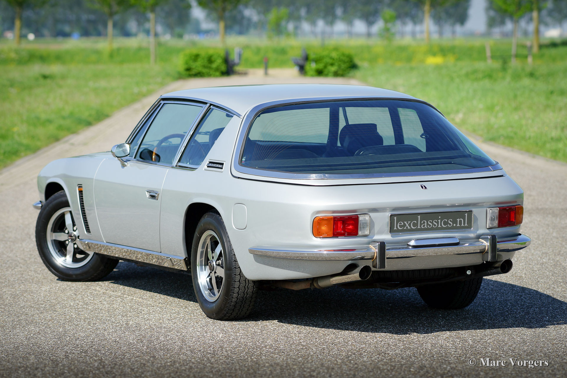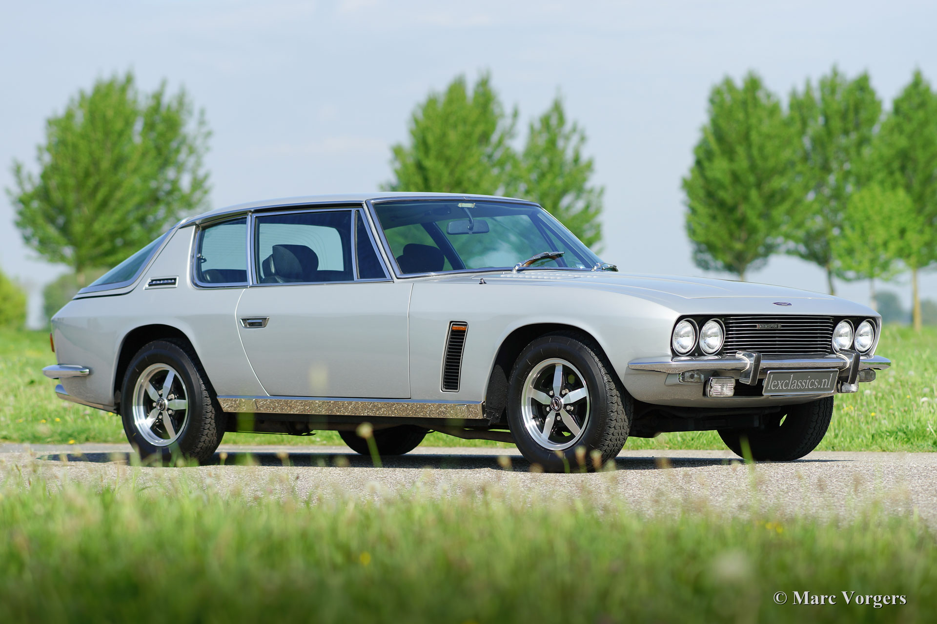 Jensen Interceptor S3 coupe, jaar 1974. Kleur zilvergrijs metallic met een zwartleren interieur en zwart tapijt. Deze machtige Jensen Interceptor verkeert in zeer goede tot excellente staat en de auto heeft ‘matching numbers’. De Jensen werd nieuw verkocht in Nederland en de auto is uitgerust met de begeerlijke (Chrysler) 7.2 liter V8 motor. De auto werd recent technisch geoptimaliseerd en verwend met een grote onderhoudsbeurt, facturen van de werkzaamheden zijn aanwezig. Deze Jensen Interceptor is uitgerust met 17 inch lichtmetalen velgen, airconditioning, automatische versnellingsbak, elektrische bediende zijruiten en getint glas. Tussen 1966 en 1976 werden er in totaal 6.408 Jensen Interceptors gebouwd waarvan 3.419 van het serie 3 type. Een van de begeerlijkste Engelse auto’s met een Amerikaans hart; een rasechte GT om in stijl mee door Europa te reizen.