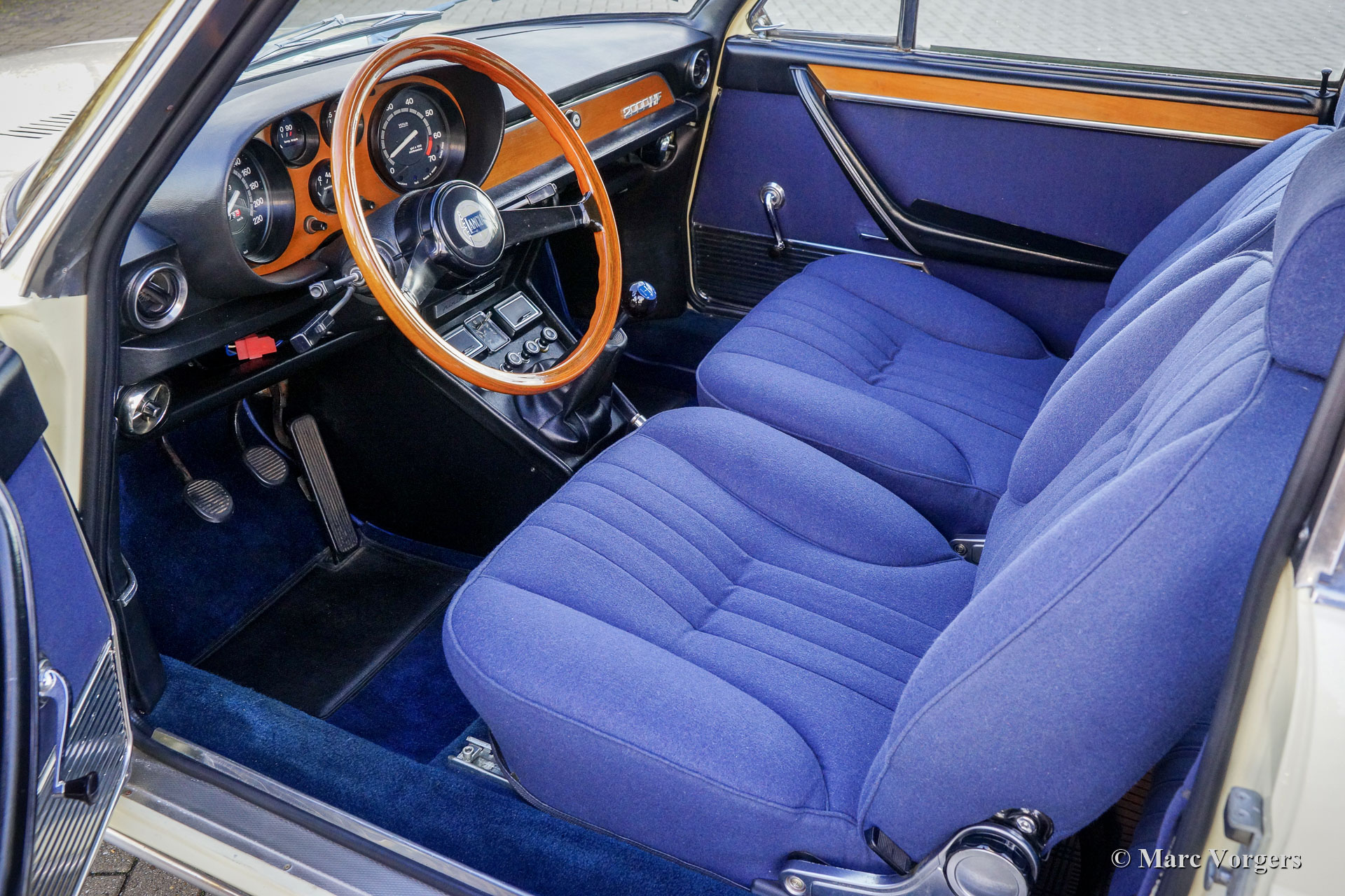 Lancia 2000 HF Coupé, jaar 1973. Kleur crème wit gecombineerd met een blauw stoffen interieur. Deze prachtige Lancia 2000 HF Coupé is nieuw verkocht in Italië. De eerste eigenaar was de heer Luciano Cassulo die in Turijn woonachtig was. De auto is geleverd door Concessionaria S.P.A. SVAT in Turijn. Deze schoonheid hebben wij recentelijk geïmporteerd uit Italië, de auto heeft nog een Italiaans kenteken. De kilometerteller geeft 00074 km aan. De automobiel verkeert in een zeer goede tot excellente conditie; deze 2000 HF toont alle originele details. De Lancia 2000 HF Coupé is een zeldzame auto, er zijn slechts 1229 exemplaren van gebouwd. De 2000 Coupé is een gerestylede Flavia Coupé. De auto is ontworpen en gerestyled door PininFarina. De 2000 HF Coupé is het topmodel met Bosch benzine-injectie en vanaf 1971 een vijfversnellingsbak. De 125 pk sterke viercilinder boxermotor is een prachtig ontwerp en het motorgeluid is heel bijzonder. Deze zeldzame en bijzondere auto wordt compleet geleverd met het originele dealermapje met daarin het instructieboek, het originele 'geboorte' boekje en een ASI-certificaat.