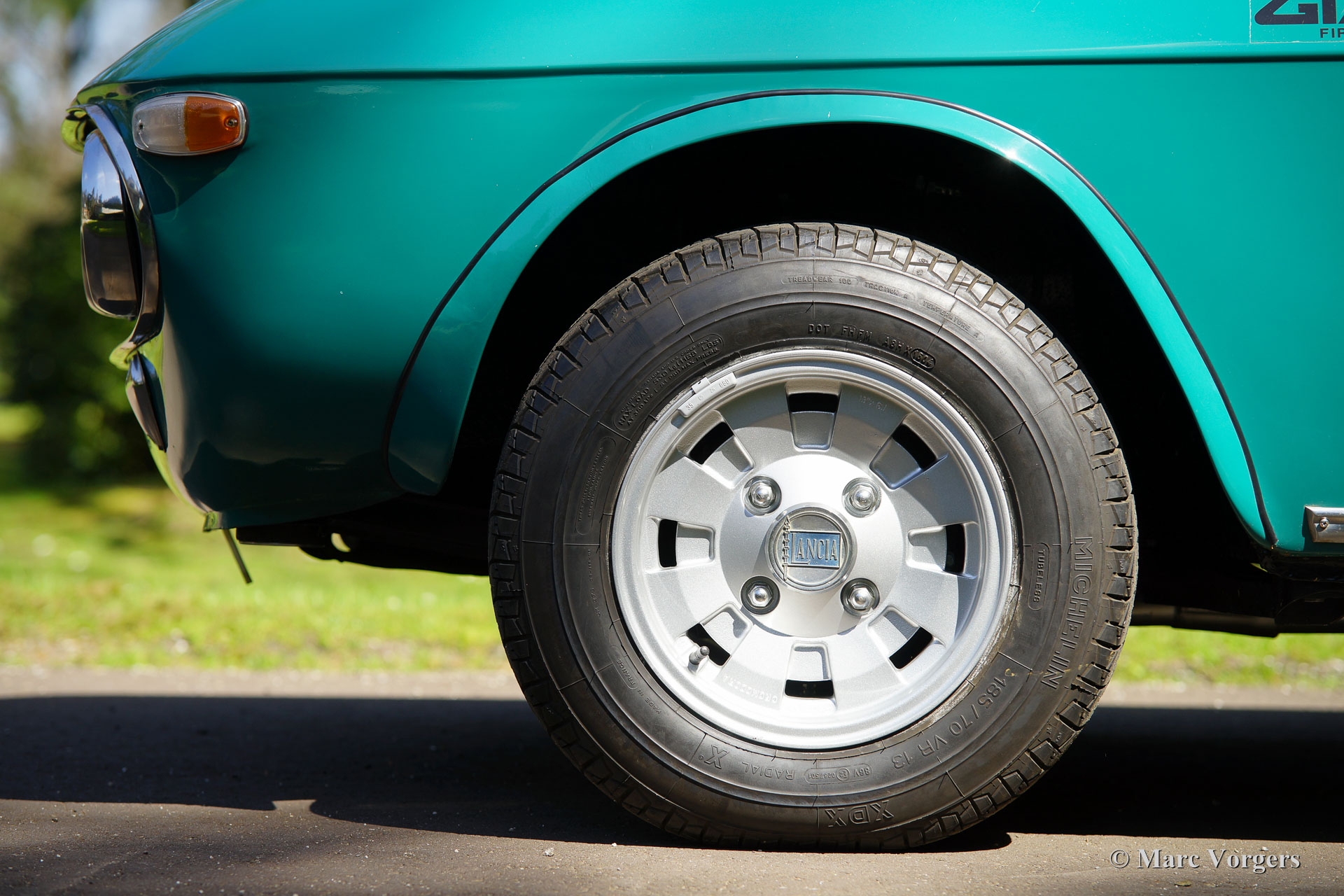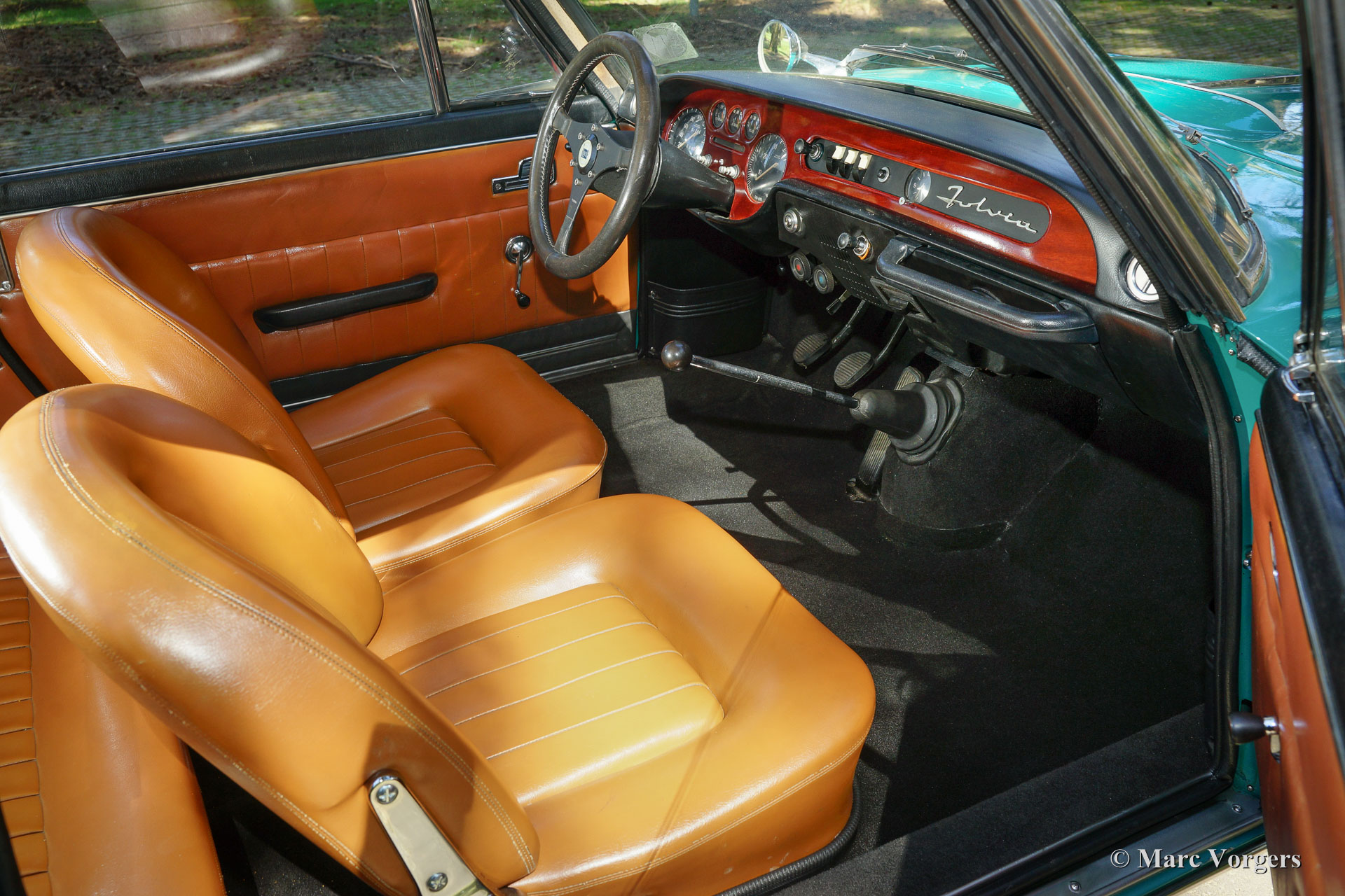 Lancia Fulvia 1.3S Rallye coupe, jaar 1969, Kleur blauw/groen (Azzuro Verde) met een cognac kleurig (Turchese Merevled) kunstlederen Interieur. Deze fantastische, zeer originele, en ‘matching numbers’ Lancia Fulvia 1.3 S Rallye uit de eerste serie werd in het jaar 2014 geïmporteerd vanuit Italië. Deze geweldige en zeldzame Fulvia verkeert in sublieme staat! In het jaar 2008 werd de auto daar gedemonteerd en vervolgens weer naar originele topconditie opgebouwd. Daarbij werd de carrosserie waar nodig voorzien van nieuwe lak. De motorkap, deuren en het kofferdeksel zijn af-fabriek vervaardigd van aluminium. De motor werd gereviseerd door Giani Co in Firenze en de carburateurs werden gereviseerd. Tijdens de werkzaamheden werden onder andere de volgende delen vernieuwd: koplampen, oliekoeler, rembekrachtiger, radiateur, gehele remsysteem (nu in RVS uitgevoerd), wiellagers, uitlaatsysteem, homokinetische koppelingen van de voorwielaandrijving, deurgrepen, benzinetank, koppeling, banden (Michelin) en de schokdempers (nu Koni classic). Dit is een perfecte Fulvia 1.3S Rallye en de auto rijdt en klinkt geweldig!