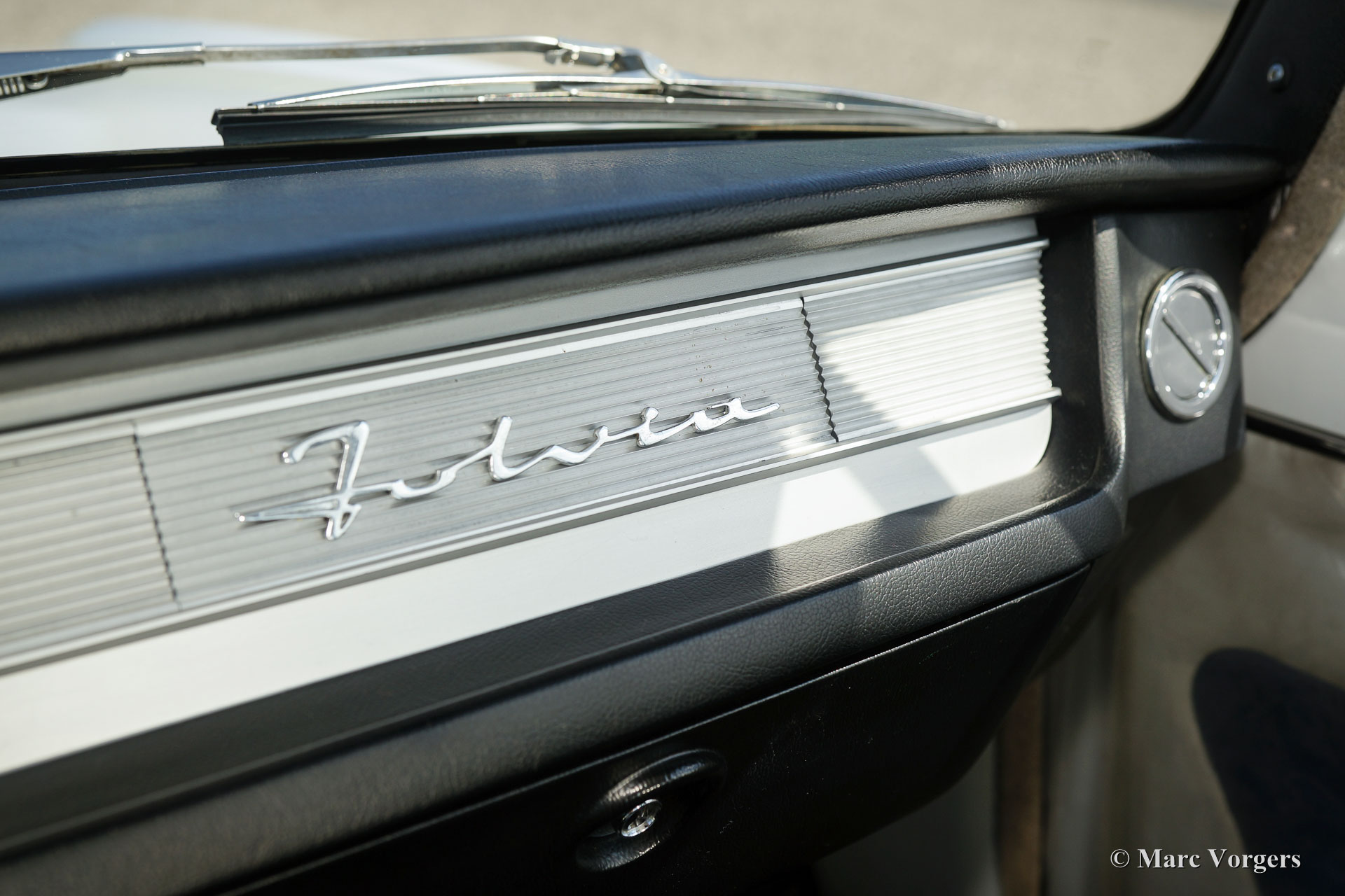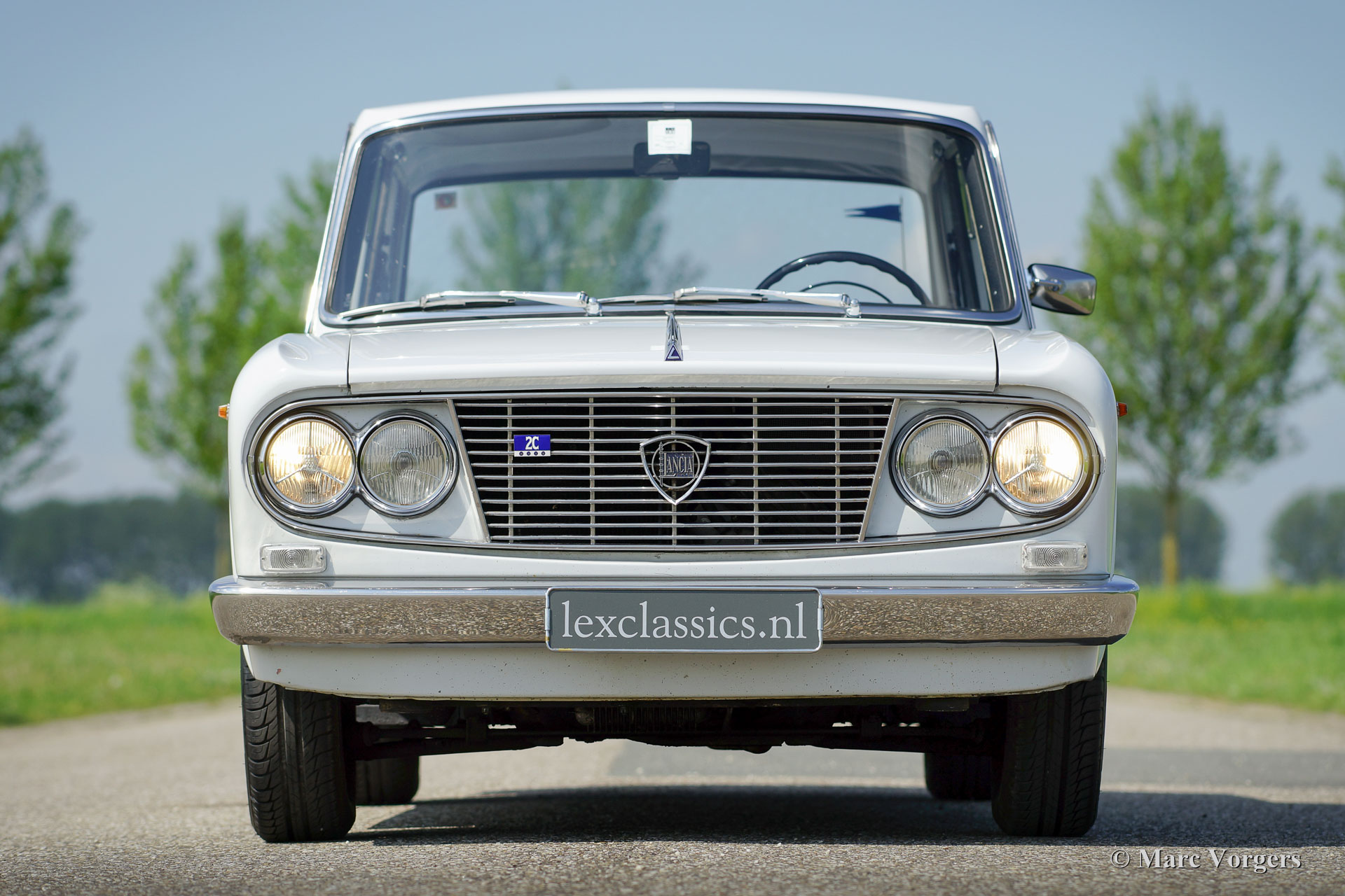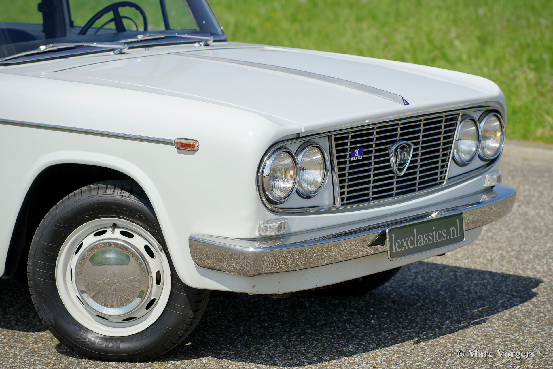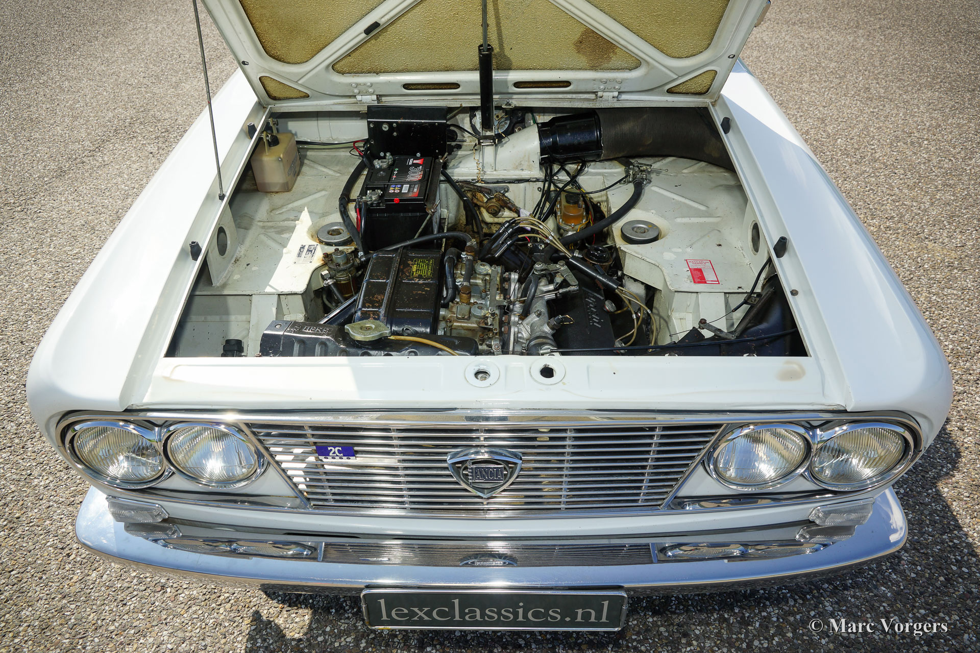 Lancia Fulvia Berlina 2C, jaar 1966. Kleur wit (Bianco) met een blauw stoffen interieur en zwart rubber vloerbedekking. Deze geweldige Lancia Fulvia Berlina 2C verkeert in excellente originele staat! De auto is grotendeels nog voorzien van de eerste lak en het interieur is volledig origineel. De deurpanelen zijn nog voorzien van de plasticfolie die de auto af-fabriek meekreeg! De stof van de bestuurdersstoel vertoont helaas een scheurtje dat gelukkig vrij eenvoudig hersteld kan worden. Technisch is deze Lancia ook een juweeltje; de V4 motor is uitgerust met twee Solex carburateurs (2C) en deze loopt perfect. De stuurschakeling laat zich perfect en als nieuw bedienen. Deze Fulvia Berlina is een fraai stukje Italiaanse industriële vormgeving uit de jaren 1960 met een bijzonder fraai gedetailleerd dashboard.