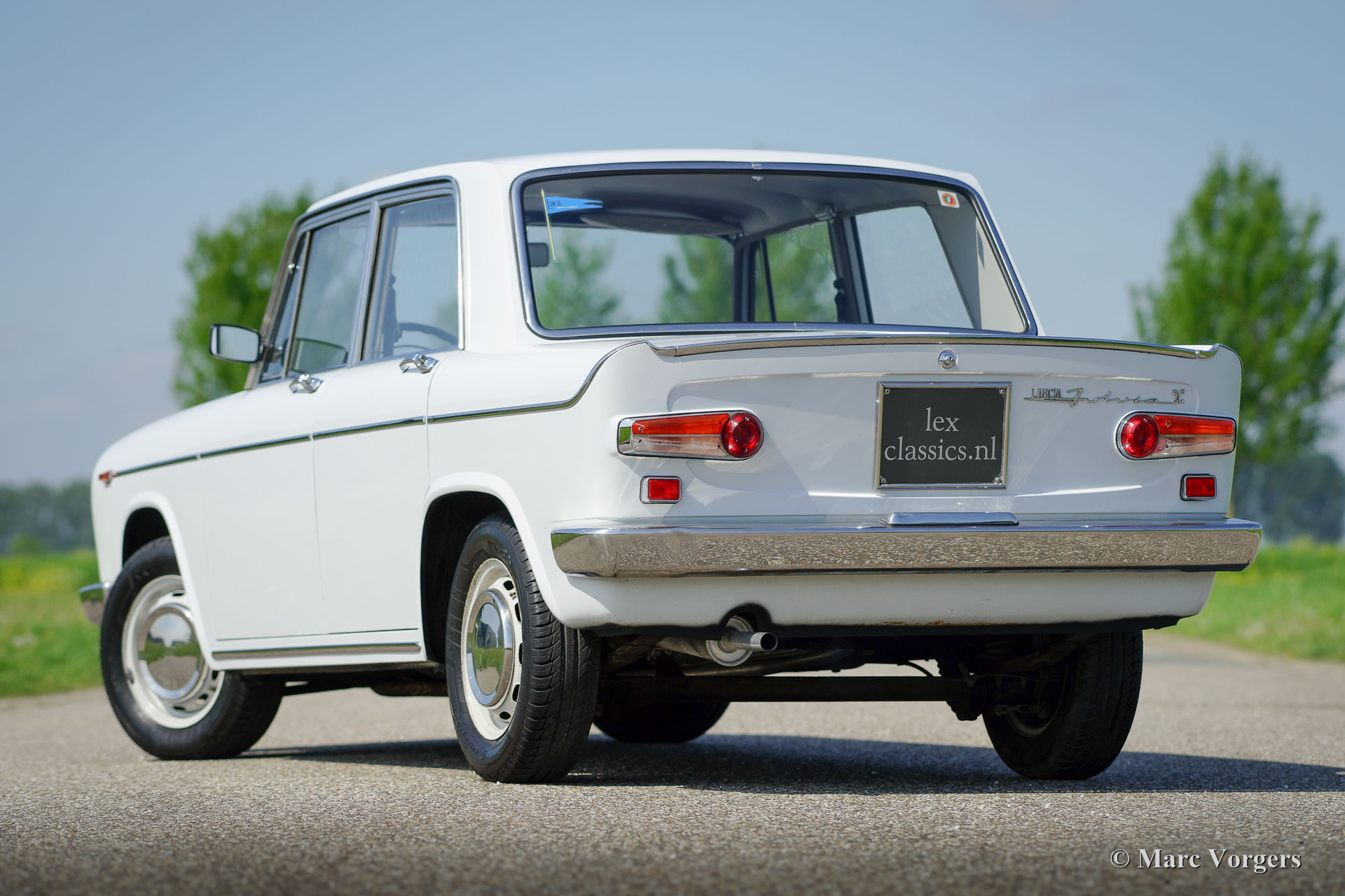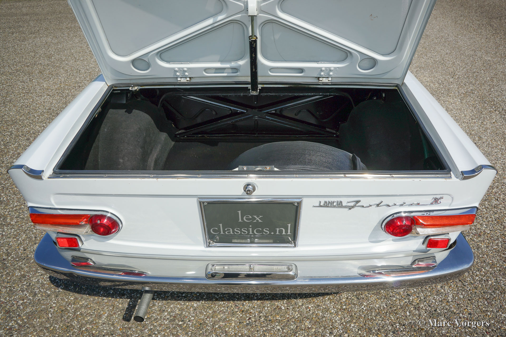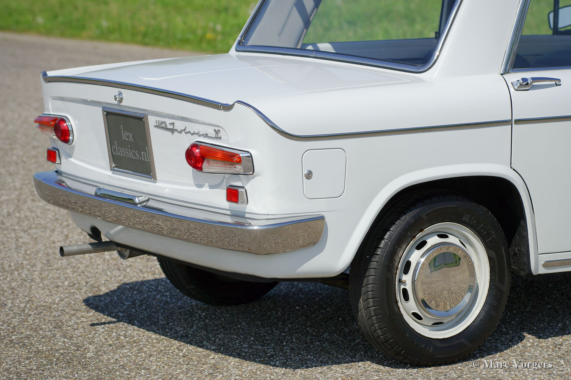 Lancia Fulvia Berlina 2C, jaar 1966. Kleur wit (Bianco) met een blauw stoffen interieur en zwart rubber vloerbedekking. Deze geweldige Lancia Fulvia Berlina 2C verkeert in excellente originele staat! De auto is grotendeels nog voorzien van de eerste lak en het interieur is volledig origineel. De deurpanelen zijn nog voorzien van de plasticfolie die de auto af-fabriek meekreeg! De stof van de bestuurdersstoel vertoont helaas een scheurtje dat gelukkig vrij eenvoudig hersteld kan worden. Technisch is deze Lancia ook een juweeltje; de V4 motor is uitgerust met twee Solex carburateurs (2C) en deze loopt perfect. De stuurschakeling laat zich perfect en als nieuw bedienen. Deze Fulvia Berlina is een fraai stukje Italiaanse industriële vormgeving uit de jaren 1960 met een bijzonder fraai gedetailleerd dashboard.