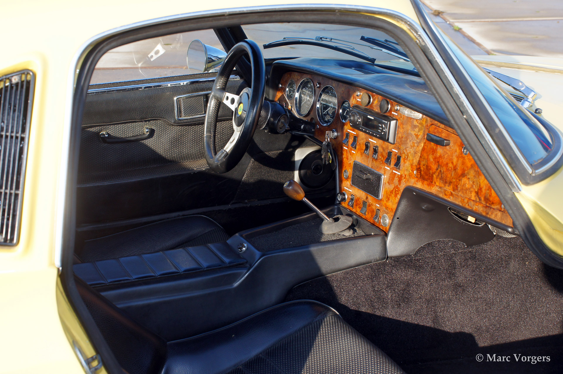 Lotus Elan 'Sprint' Fixed Head Coupe, bouwjaar 1971. Kleur 'two tone' lichtgeel boven wit met een goudkleurige 'Sprint' streep. Zwart vinyl interieur met zwart tapijt. Deze elan is uitgerust met de krachtige 'Big Valve' motor.