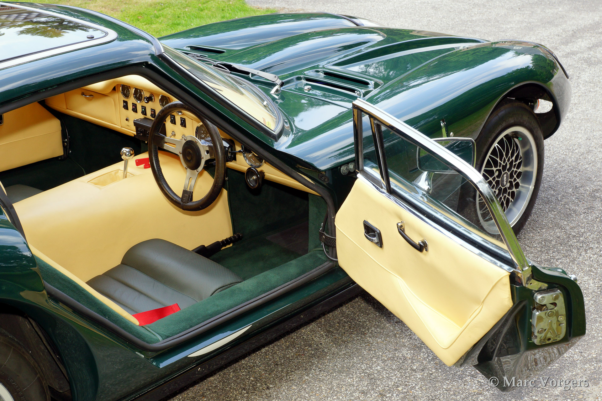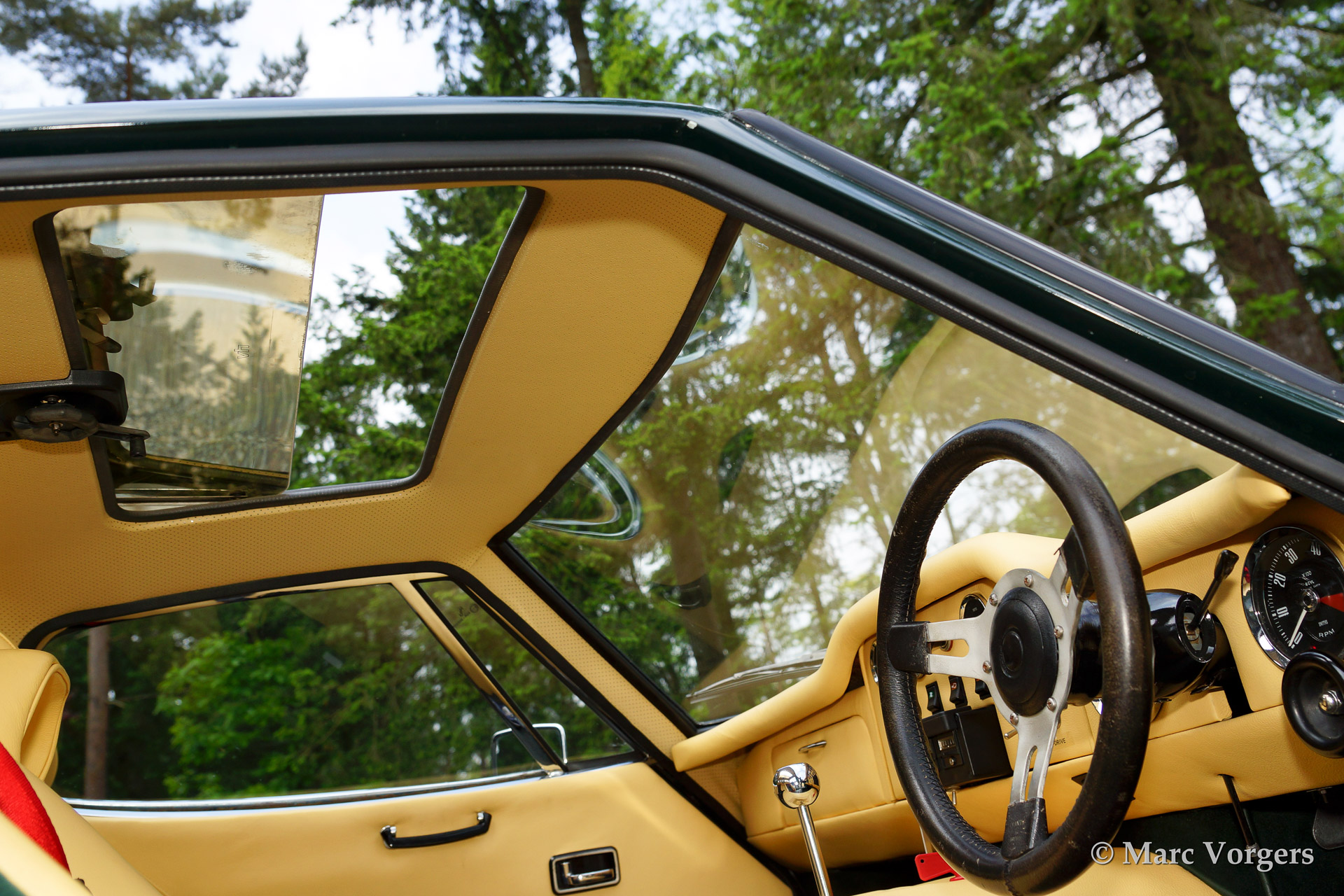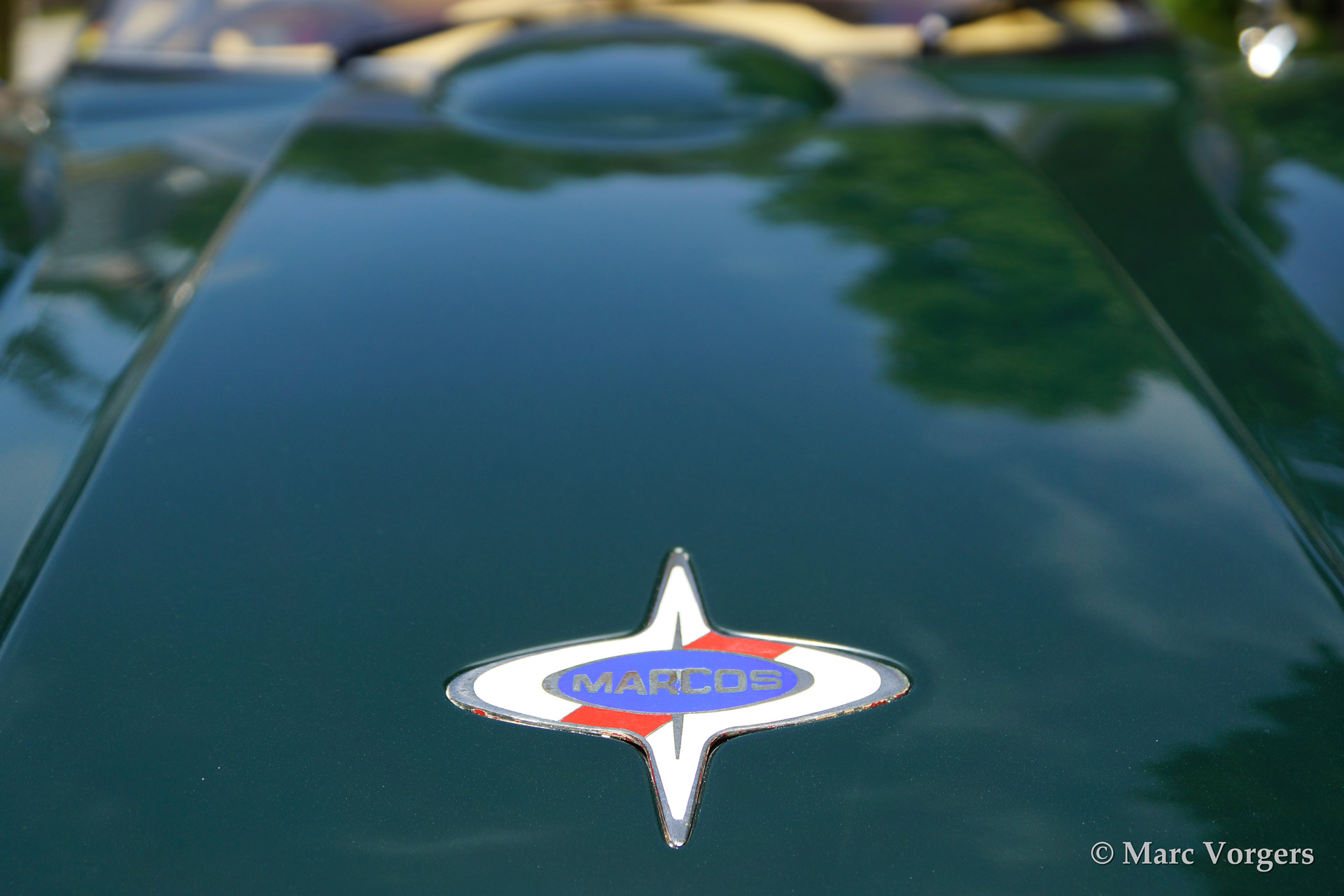 Marcos GT 3-Litre, bouwjaar 1969. Kleur 'British Racing Green'met een beige lederen interieur. Deze geweldige Marcos GT werd uitvoerig gerestaureerd. Kosten noch moeite werden gespaard om alles perfect te krijgen. De Marcos GT 3-Litre is een zeldzame auto, er werden slechts 145 exemplaren met de Ford 'Essex' 3 liter motor gebouwd. Volgens de documenten werd deze auto origineel afgeleverd met het grote sunroof! In dit geval geeft het sunroof ook extra, niet overbodige, hoofdruimte! De auto is uitgerust met een vol-lederen interieur (donkergroene stoelen, beige dashboard, transmissietunnel en de deur panelen, 4-punts veiligheidsgordels, extra meters en prachtige lichtmetalen wielen.