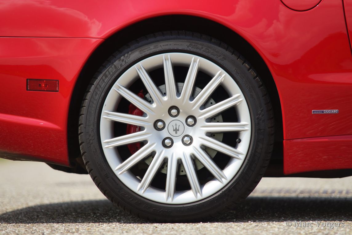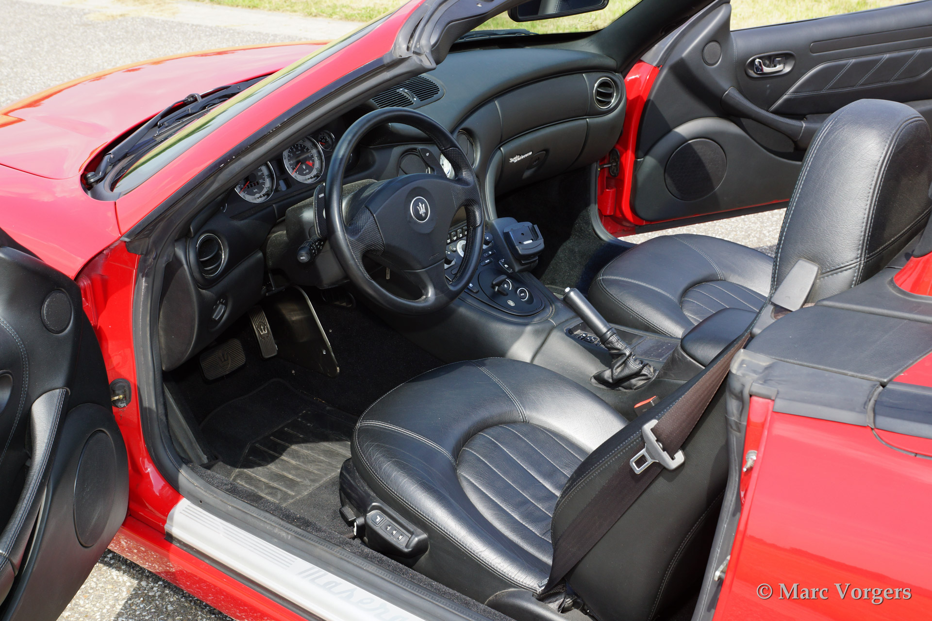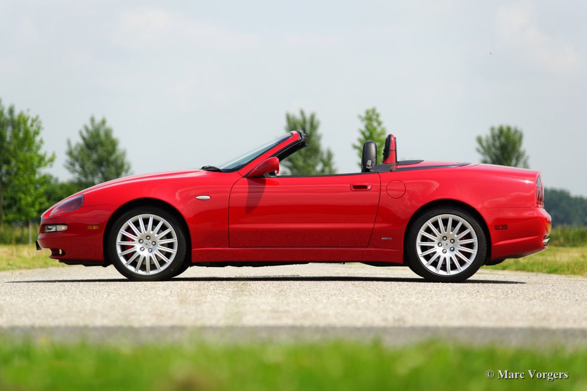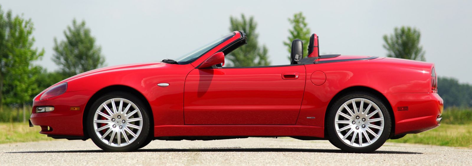 Maserati Spyder GT Cambiocorsa, bouwjaar 2002. Kleur rood met een zwart lederen interieur en een zwarte soft top. Deze Maserati Spyder is uitgerust met een Cambiocorsa F1 zesversnellingsbak met 'flippers' aan het stuur.