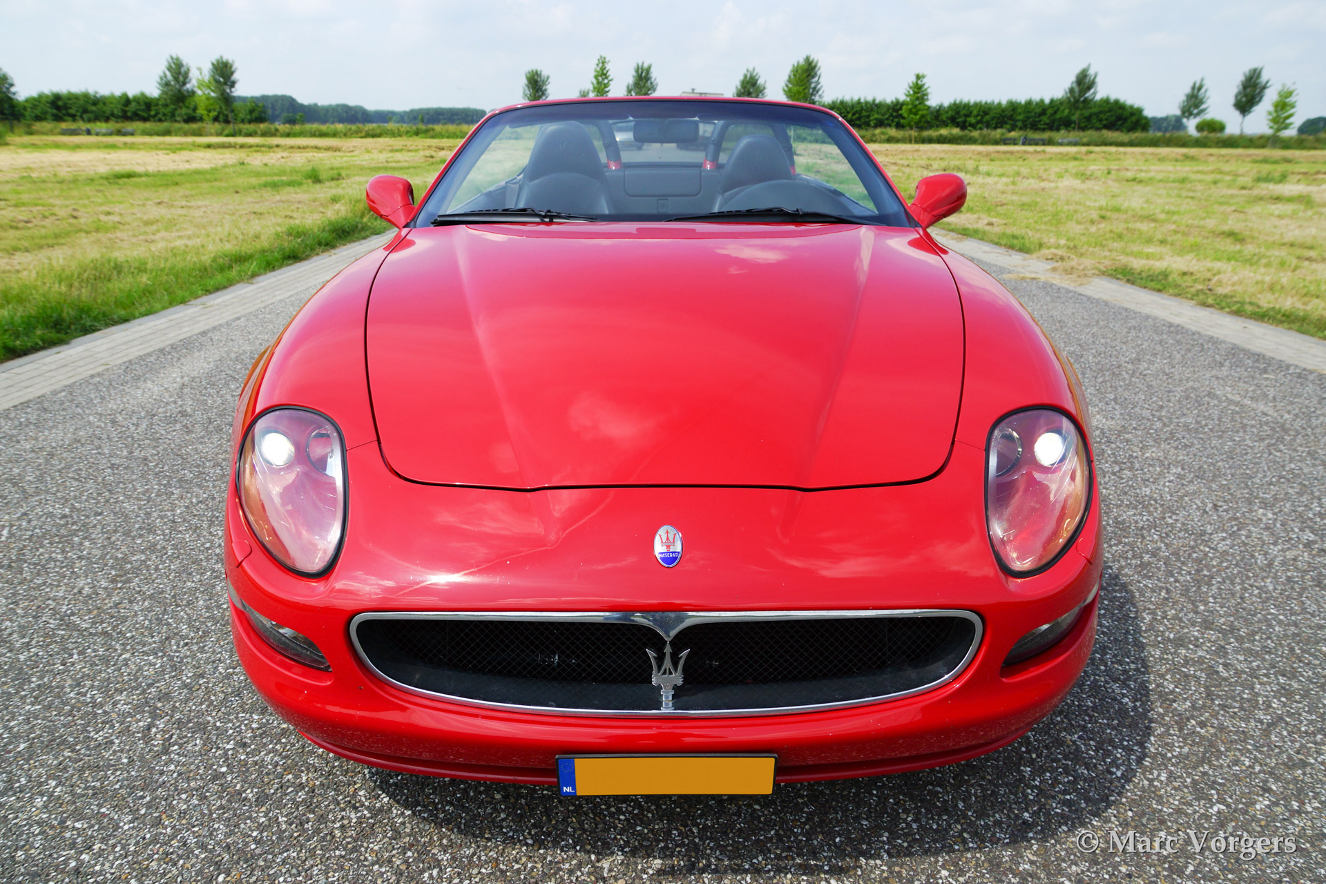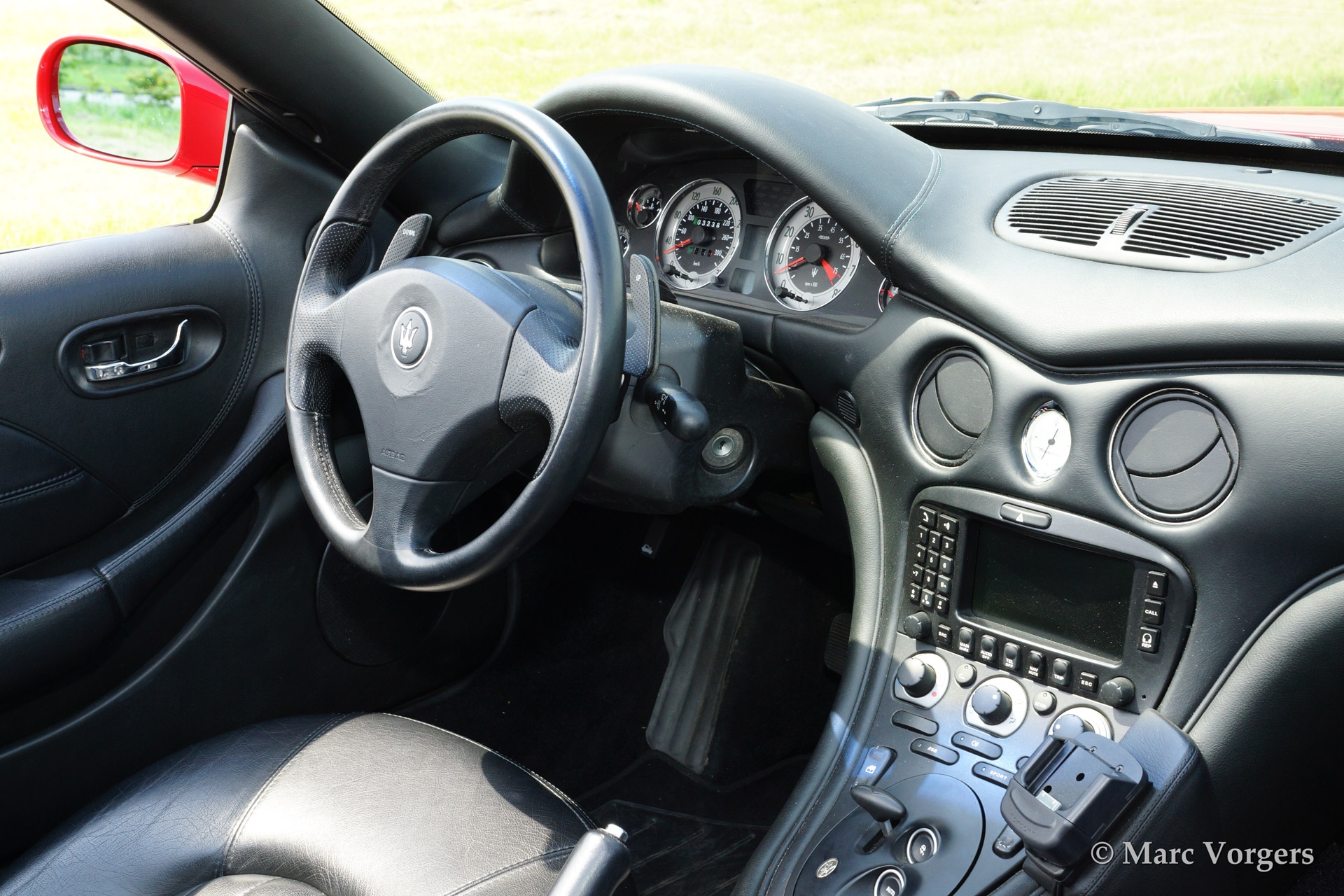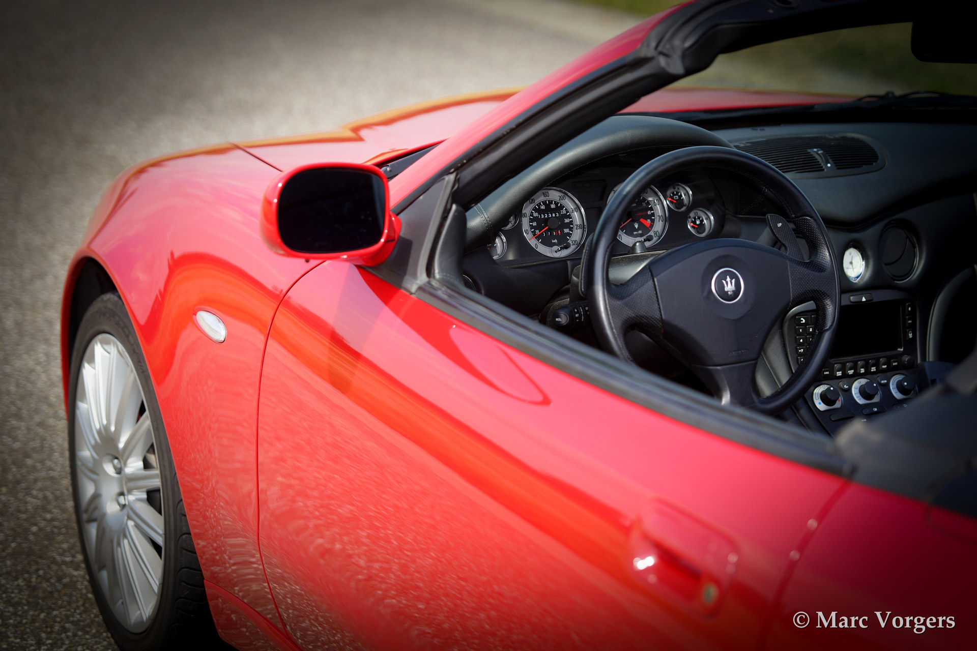 Maserati Spyder GT Cambiocorsa, bouwjaar 2002. Kleur rood met een zwart lederen interieur en een zwarte soft top. Deze Maserati Spyder is uitgerust met een Cambiocorsa F1 zesversnellingsbak met 'flippers' aan het stuur.