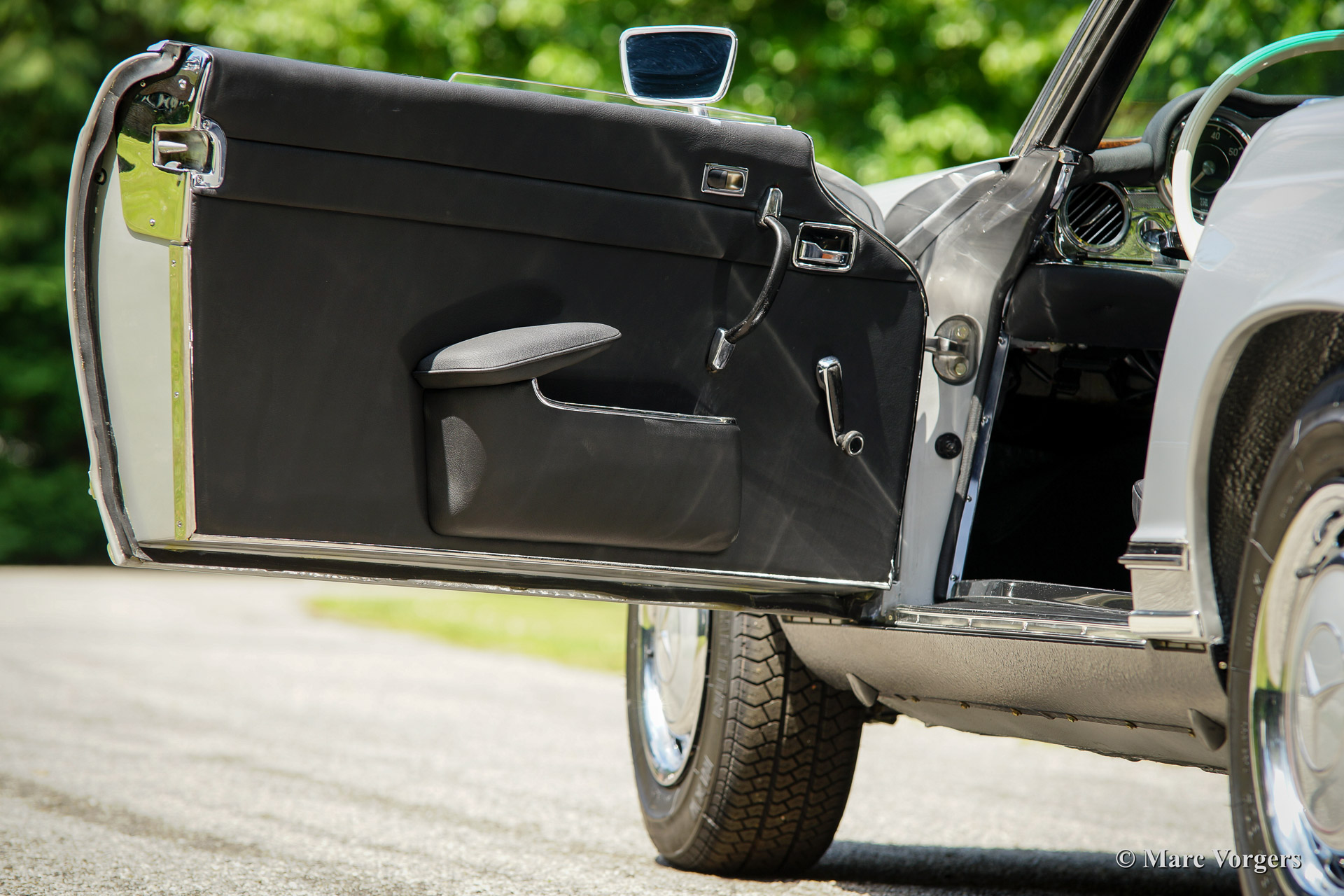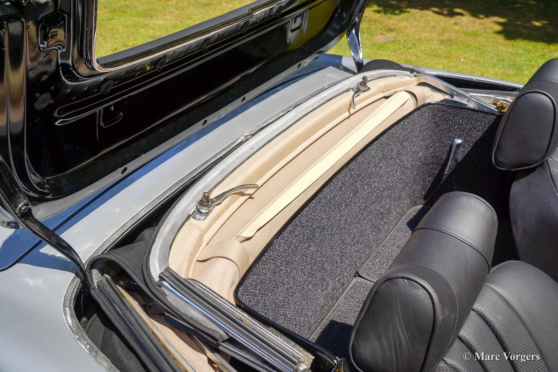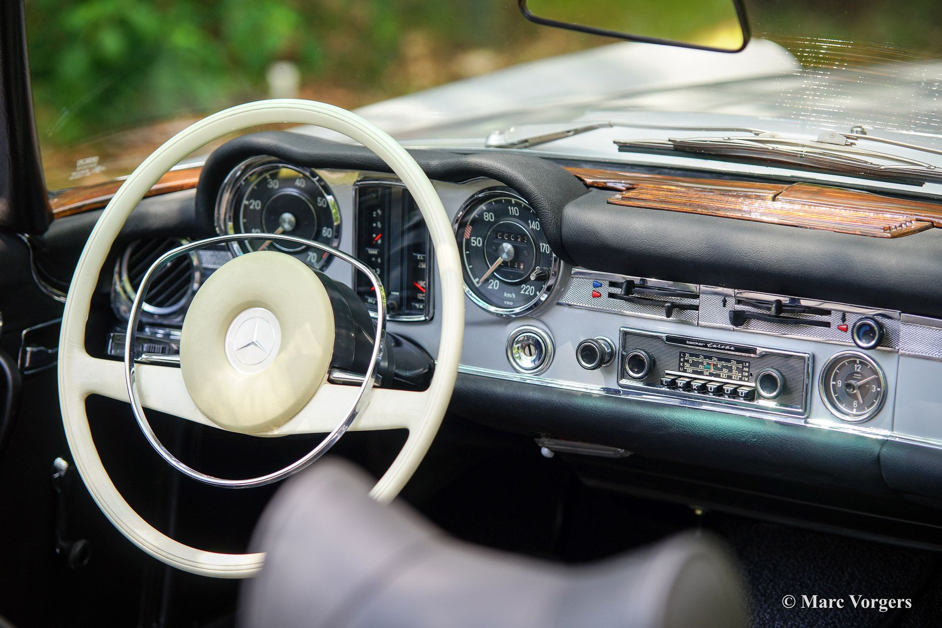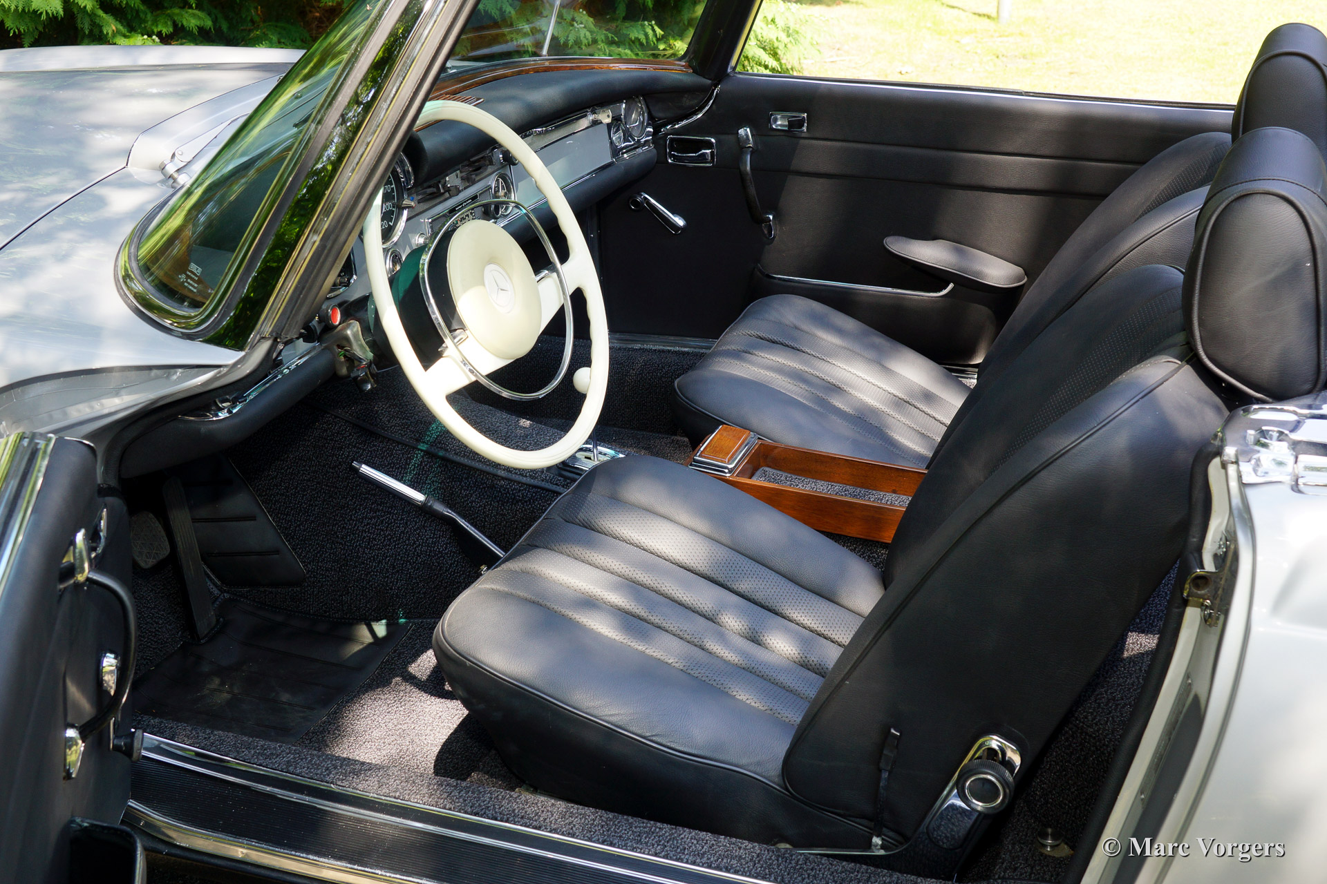 Mercedes-Benz 280 SL ‘Pagode’, bouwjaar 1970. Kleur zilvergrijs metallic met een zwart lederen interieur. Zwarte kap en hard top in carrosseriekleur. Deze fantastische Mercedes-Benz SL werd nieuw verkocht in Amerika. De auto is juist gereed gekomen na top restauratie door een Nederlandse Mercedes-Benz specialist, de automobiel verkeert in concoursstaat en de auto rijdt perfect! Tijdens de restauratie werden enige Amerikaanse details aangepast naar Europese specificaties zoals de mijlenteller naar kilometerteller, de koplampen en de richtingaanwijzers. Een fotoreportage van de restauratie is aanwezig. De Mercedes is uitgerust met een automatische versnellingsbak, een klassieke Becker radio, stuurbekrachtiging en de auto is compleet met de originele hard top in carrosseriekleur.