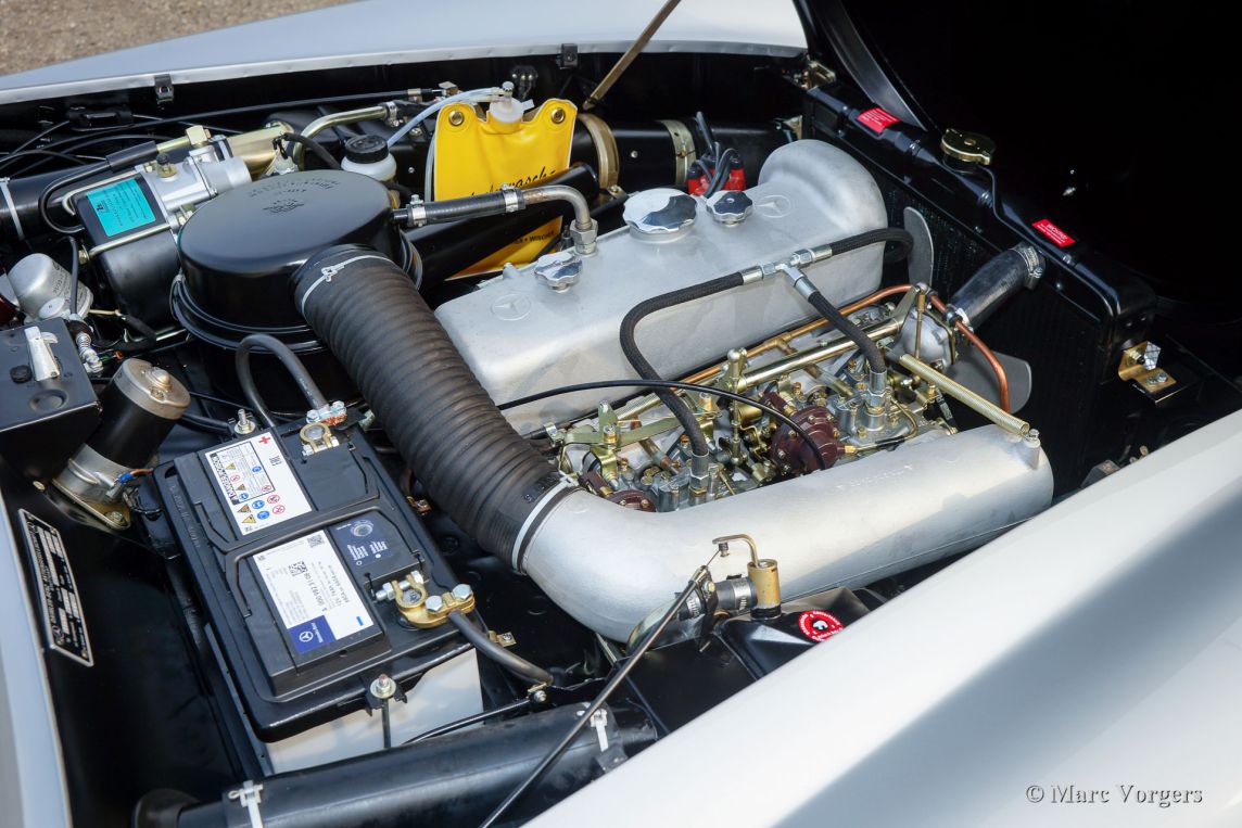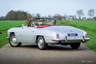Mercedes-Benz 190 SL (W121), jaar 1957. Kleur zilvergrijs metallic (MB-kleurcode DB180) met een roodleren interieur en grijs tapijt. Zwarte mohair kap en een rode kapafdekking. Mercedes-Benz ‘Datenkarte’ is aanwezig. Deze 190 SL heeft ‘matching numbers’ en ‘matching colours’; alles is dus fabriek origineel! Deze oogstrelend fraaie Mercedes 190 SL is in de periode 2015 - 2017 volledig en ‘body-off’ gerestaureerd door een ervaren Nederlandse Mercedes 190 SL-specialist. Deze 190 SL verkeert in absolute concoursstaat! Een uitgebreide fotoreportage en vele facturen van de restauratie zijn aanwezig. Gereviseerd zijn o.a. de motor (cilinderkop geschikt gemaakt voor loodvrije benzine), de carburateurs, versnellingsbak, remsysteem inclusief rembekrachtiger, de complete wielophanging en alle dashboard instrumenten. Het originele chroomwerk is nieuw verchroomd, alle delen van de wielophanging zijn gestraald en zwart gecoat. Werkelijk alles is gerestaureerd, gereviseerd en/of vernieuwd waarbij de kabelboom (elektrische bedrading), de ruiten, de koelblokken in de kachel en de koelradiator uiteraard meegenomen zijn. De carrosserie is gerestaureerd vanaf de blanke plaat en voorzien van een professioneel en zeer strak laksysteem. Sinds de restauratie heeft de auto 300 testkilometers gereden, dit is een TOP-exemplaar in absolute concoursstaat!