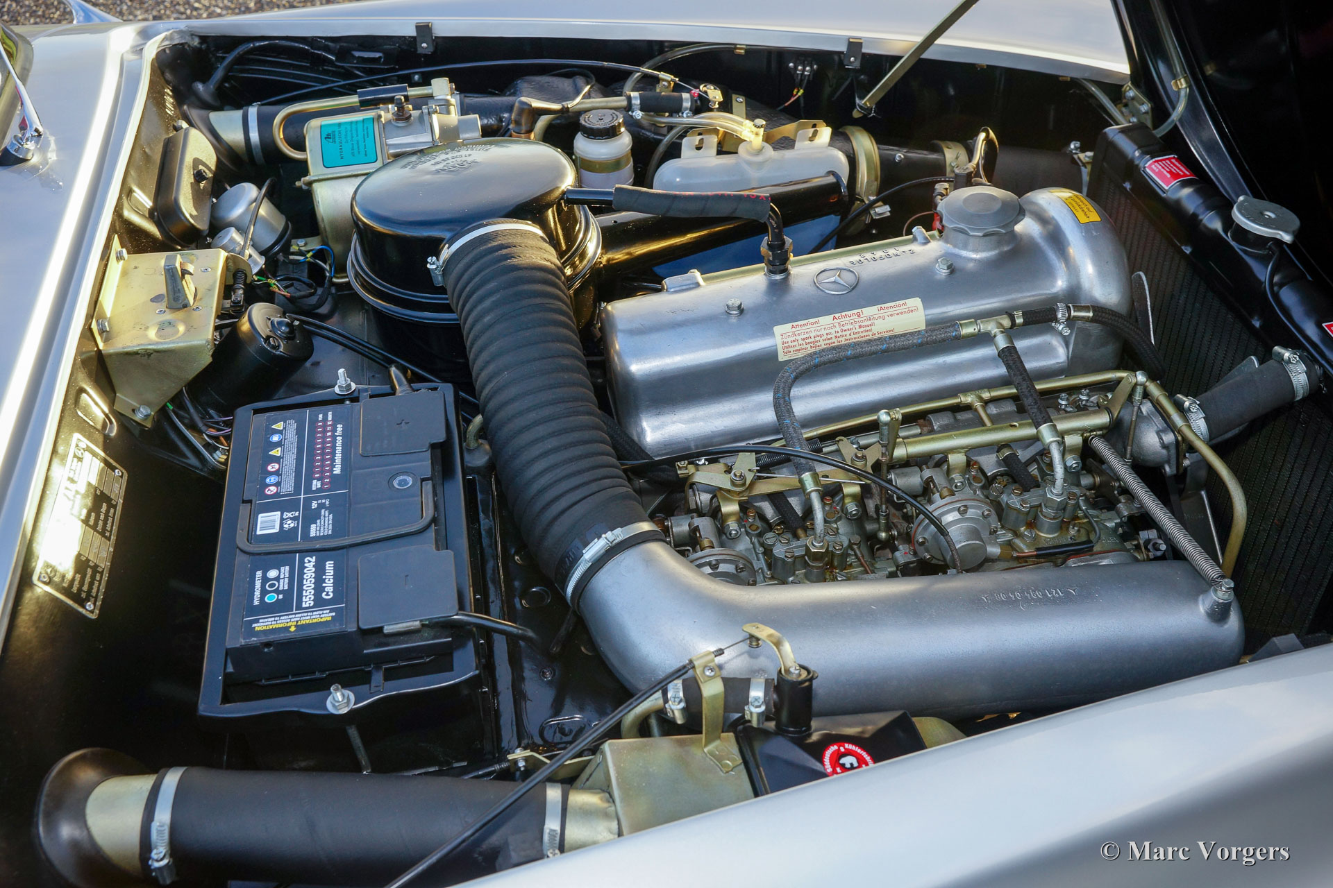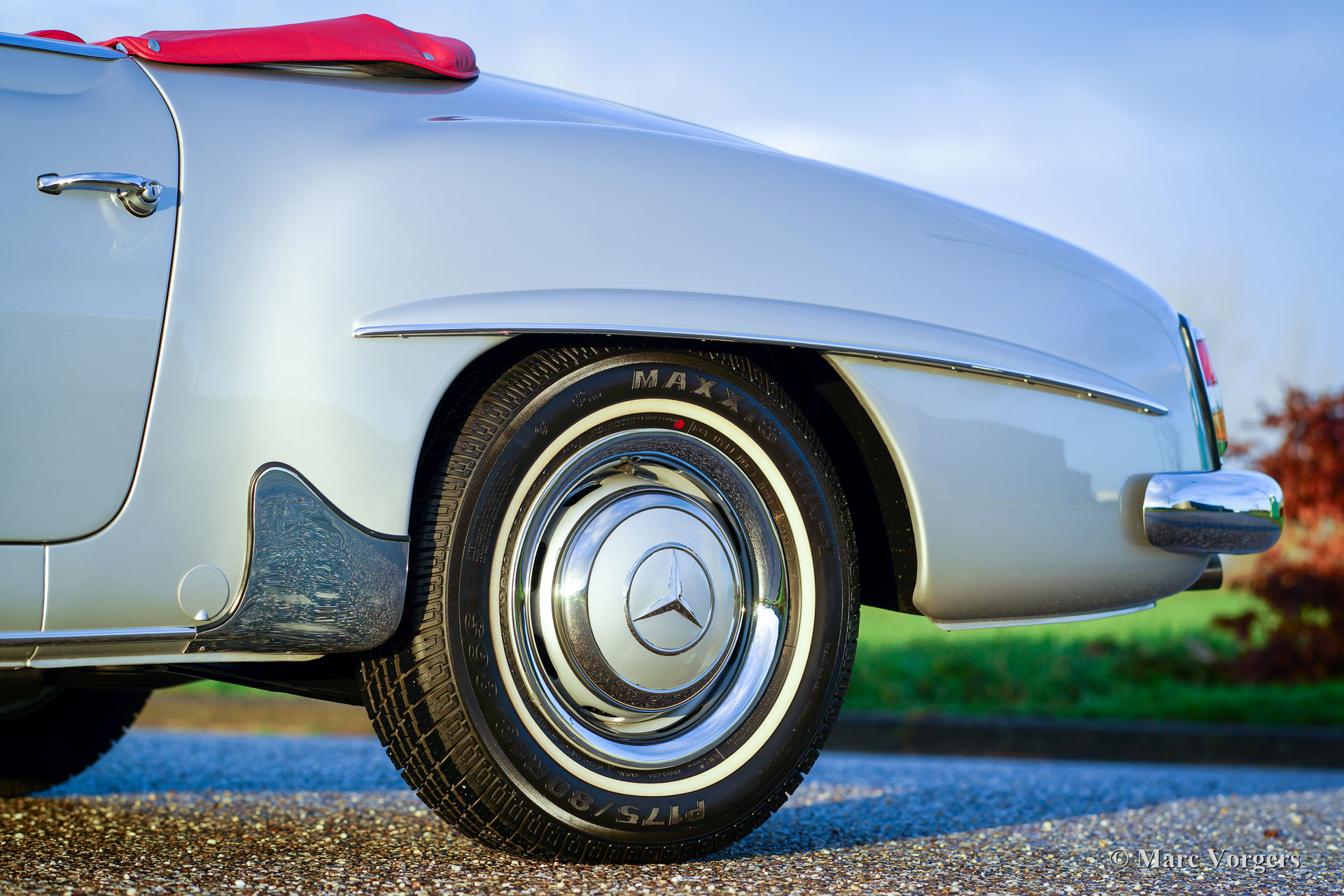 Mercedes-Benz 190 SL, bouwjaar 1961. Kleur zilver metallic met een roodlederen interieur. Deze geweldige Mercedes 190 SL werd in het verleden uitvoerig en perfect gerestaureerd. Een fotoreportage van de restauratie is aanwezig. Deze 190 SL heeft een prachtig strakke carrosserie met fraaie passingen, de auto verkeert in sublieme topstaat! De auto gaat vergezeld van een Mercedes-Benz ‘wagenkaart’ waarop te zien is dat de auto ‘matching numbers’ heeft. Een top exemplaar!