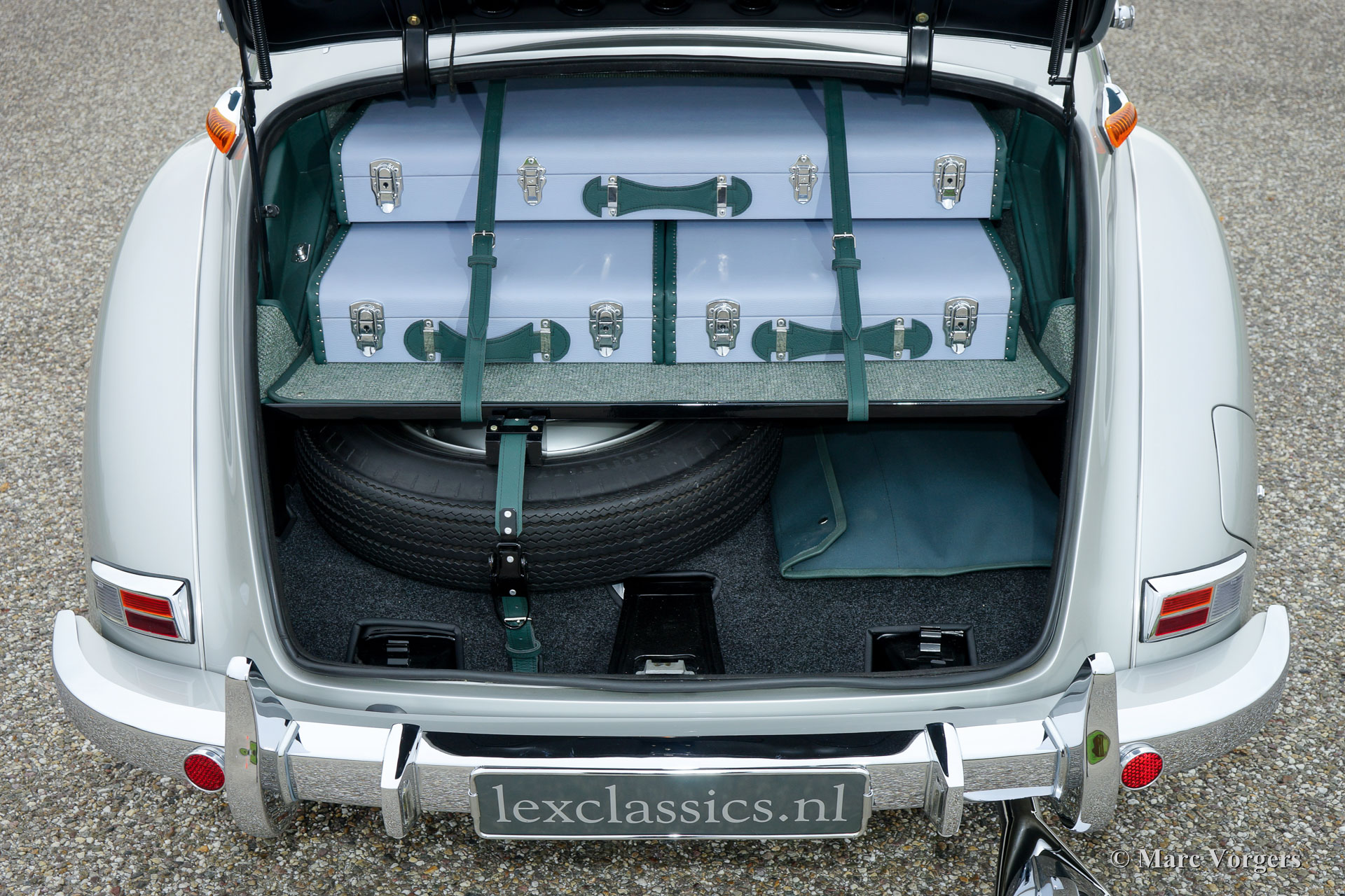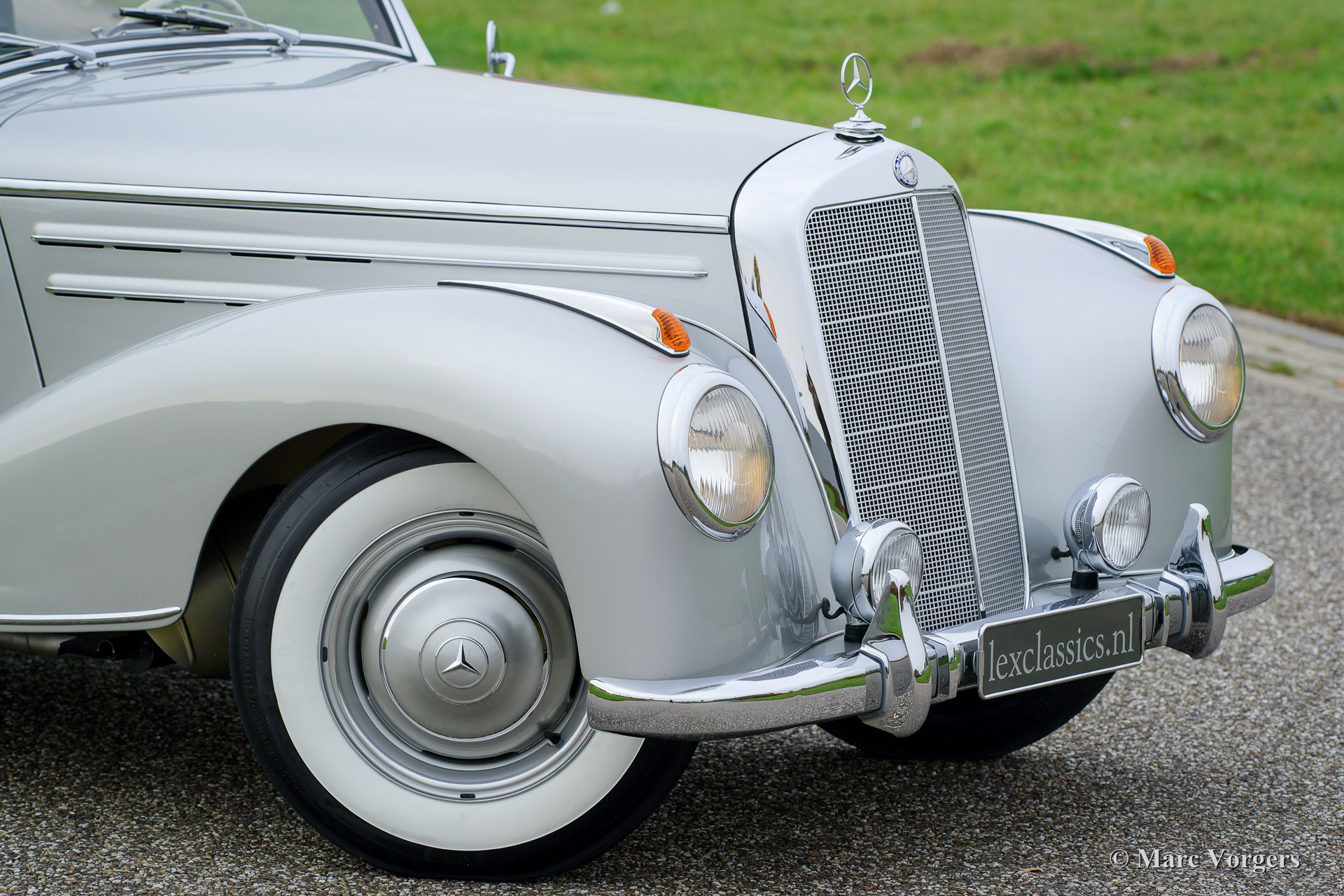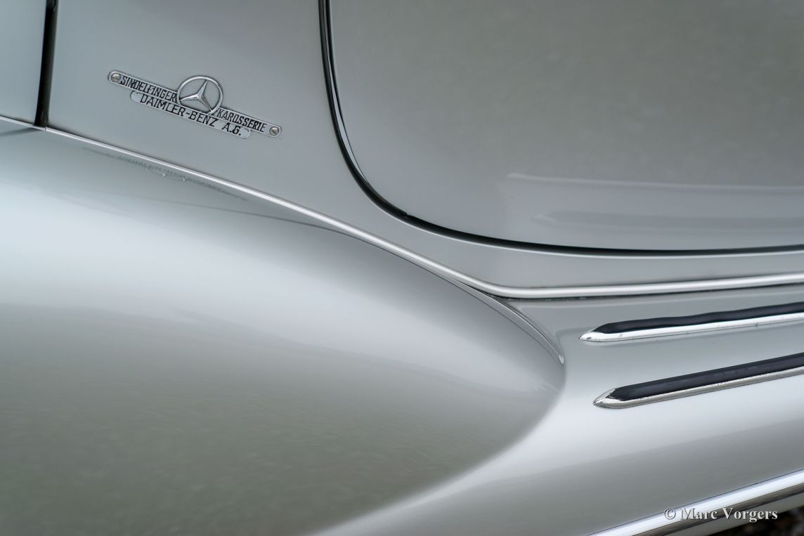 Mercedes-Benz 220 A cabriolet, jaar 1952. Kleur zilver metallic met een groen lederen interieur en groen gemêleerd tapijt. Groene mohair cabrioletkap en kapafdekking. Deze fantastische Mercedes-Benz 220 A werd in Duitsland uitvoerig en ‘body-off’ gerestaureerd naar zeer hoog niveau! De auto verkeert in smetteloze A1 concoursstaat! Waar u ook kijkt; u ziet enkel perfectie. Dit wordt afgemaakt met een blik in de kofferbak waar u een prachtige op maat gemaakte kofferset vindt. Een uitvoerige fotoreportage van de restauratie is aanwezig. Deze automobielen waren in de jaren 1950 onbetaalbaar en vandaag de dag zeldzame collectors items. Dit is een oogverblindend top-exemplaar en een uitstekend rijdende Mercedes-Benz!
