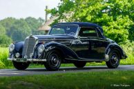 Mercedes-Benz 220 Cabriolet A, jaar 1951. Kleur donkerblauw gecombineerd met een grijs lederen interieur en grijs tapijt. Donkerblauwe cabrioletkap en kap-afdekking. In de jaren 1990 werd deze prachtige en zeldzame Mercedes 220 Cabriolet A uitvoerig gerestaureerd door een Nederlandse Mercedes-Benz specialist. Alles werd gerestaureerd, gereviseerd en/ of vernieuwd, enkel de originele lederen interieurbekleding werd opgeknapt en overgezet in de gerestaureerde auto. Na meer dan 20 jaar en slechts 4983 kilometer sinds de restauratie verkeert de auto nog altijd in uitstekende conditie! De carrosserie, de lak en het chroom verkeren in prachtige staat. De motorruimte, onderzijde en de kofferruimte zien er fraai en schoon uit. Het bijna 70 jaar oude originele interieur verkeert in goede conditie met sporen van gebruik. De auto toont alle originele details en is voorzien van de originele Becker radio en Bosch mistlampen. Verder wordt de auto geleverd met de originele gereedschapsrol en de uiterst zeldzame originele ‘Bad Cannstadt’ kofferset!