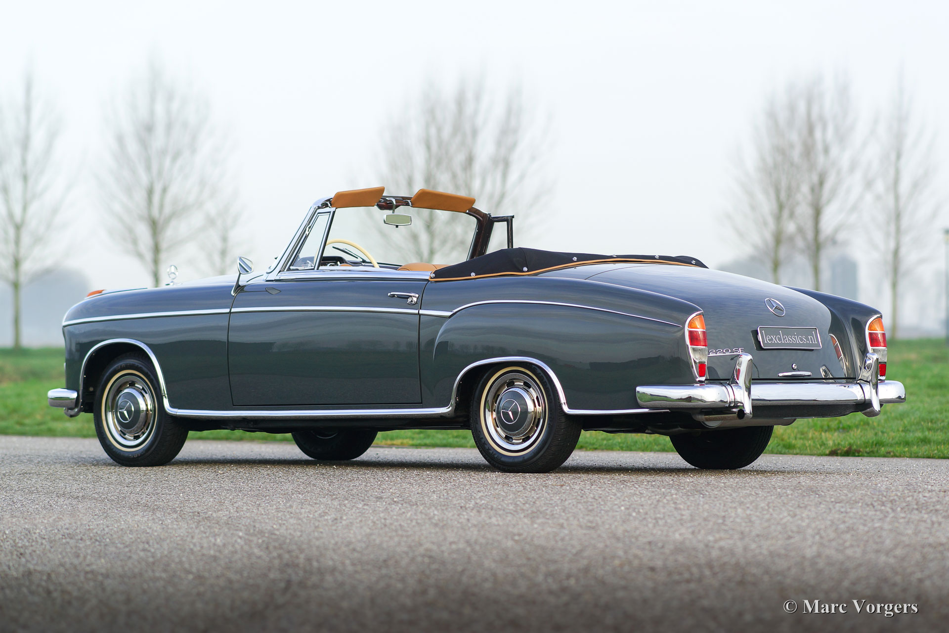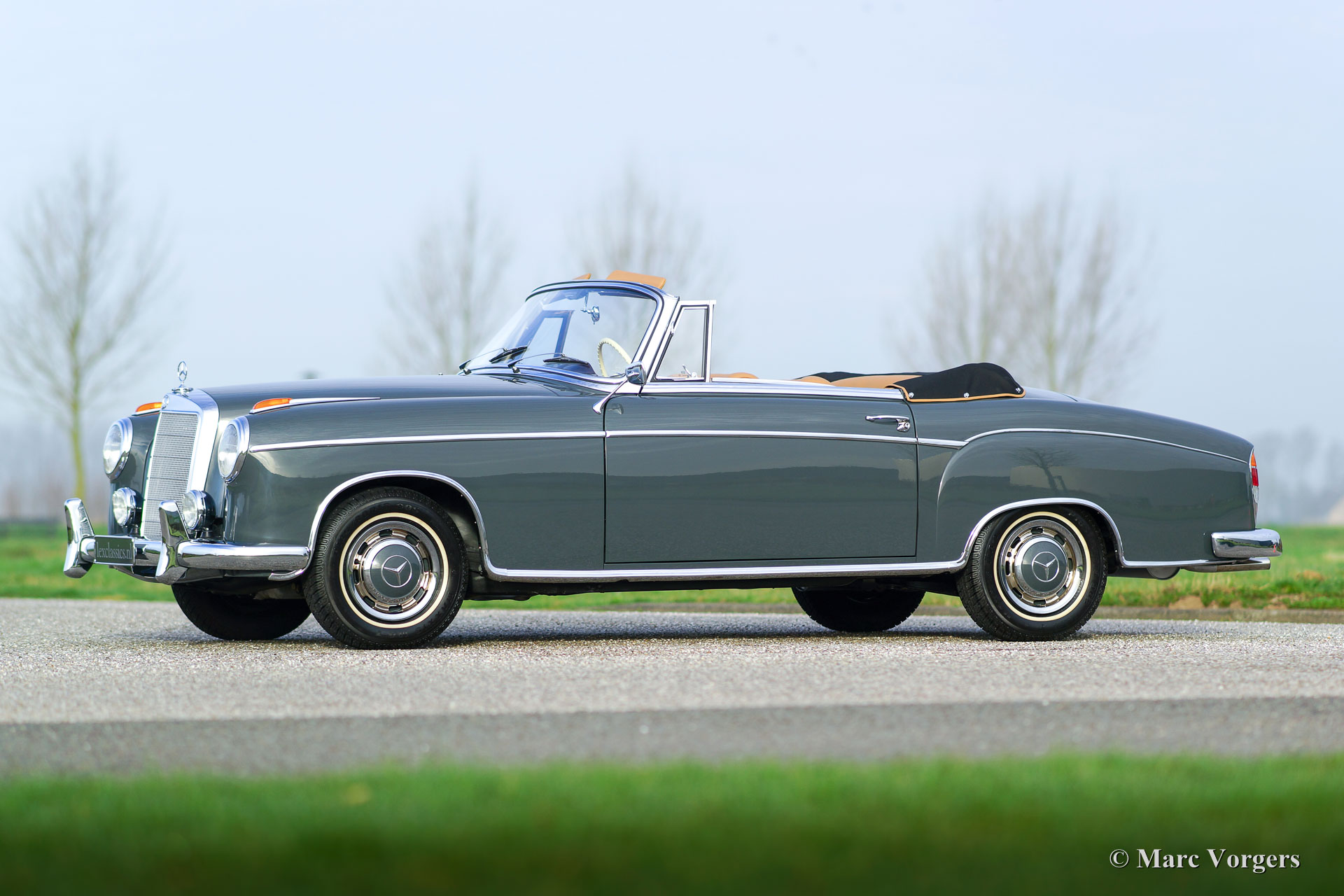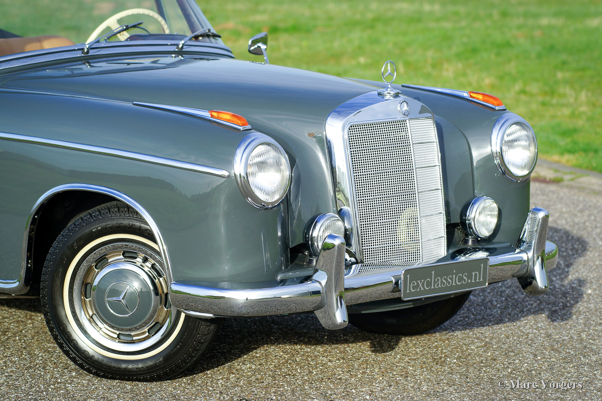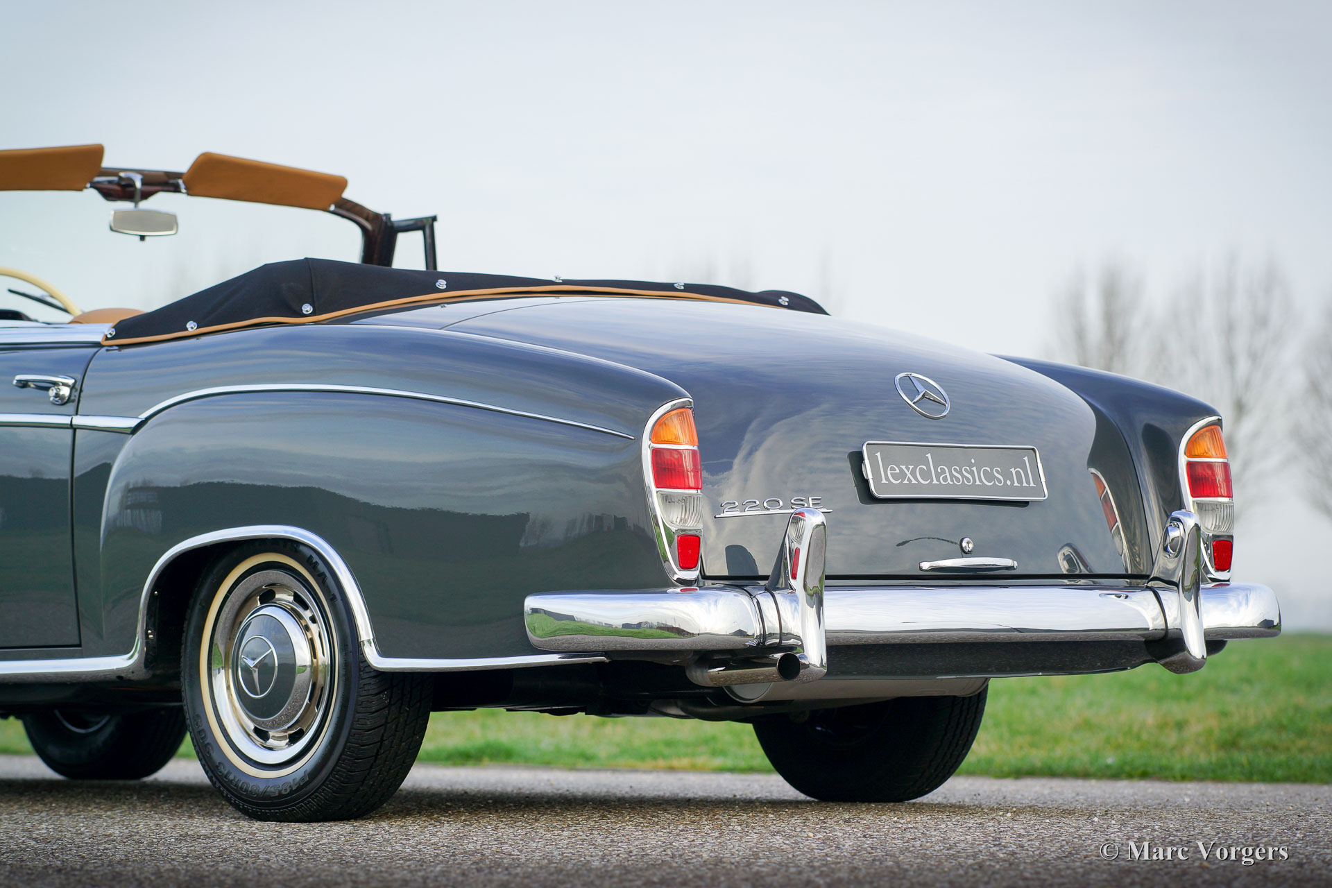 Mercedes-Benz 220 SE (W128) cabriolet, jaar 1960. Kleur grijs met een beige leren interieur en beige tapijt. Zwarte mohair kap, zwarte mohair kap-afdekking afgewerkt met beige biezen. Deze bijzonder fraaie Mercedes-Benz cabriolet werd uitvoerig, en met veel oog voor perfectie, gerestaureerd door en specialist. De automobiel verkeert in sublieme topstaat; concours. Een fotoreportage van de restauratie is aanwezig. Er werden slechts 1.112 exemplaren van deze vierpersoons cabriolet gebouwd. De auto wordt compleet geleverd met een op maat gemaakte kofferset in de kofferbak. Dit is een absoluut top-exemplaar!