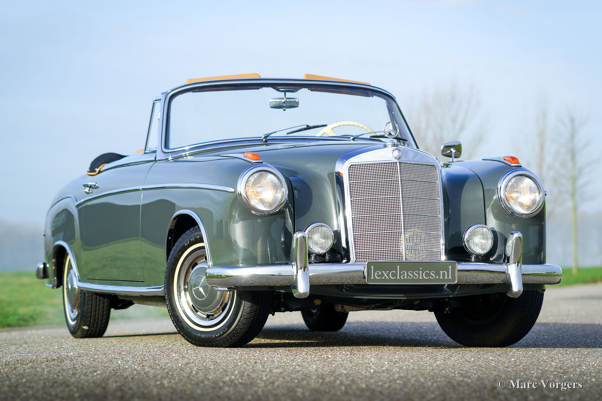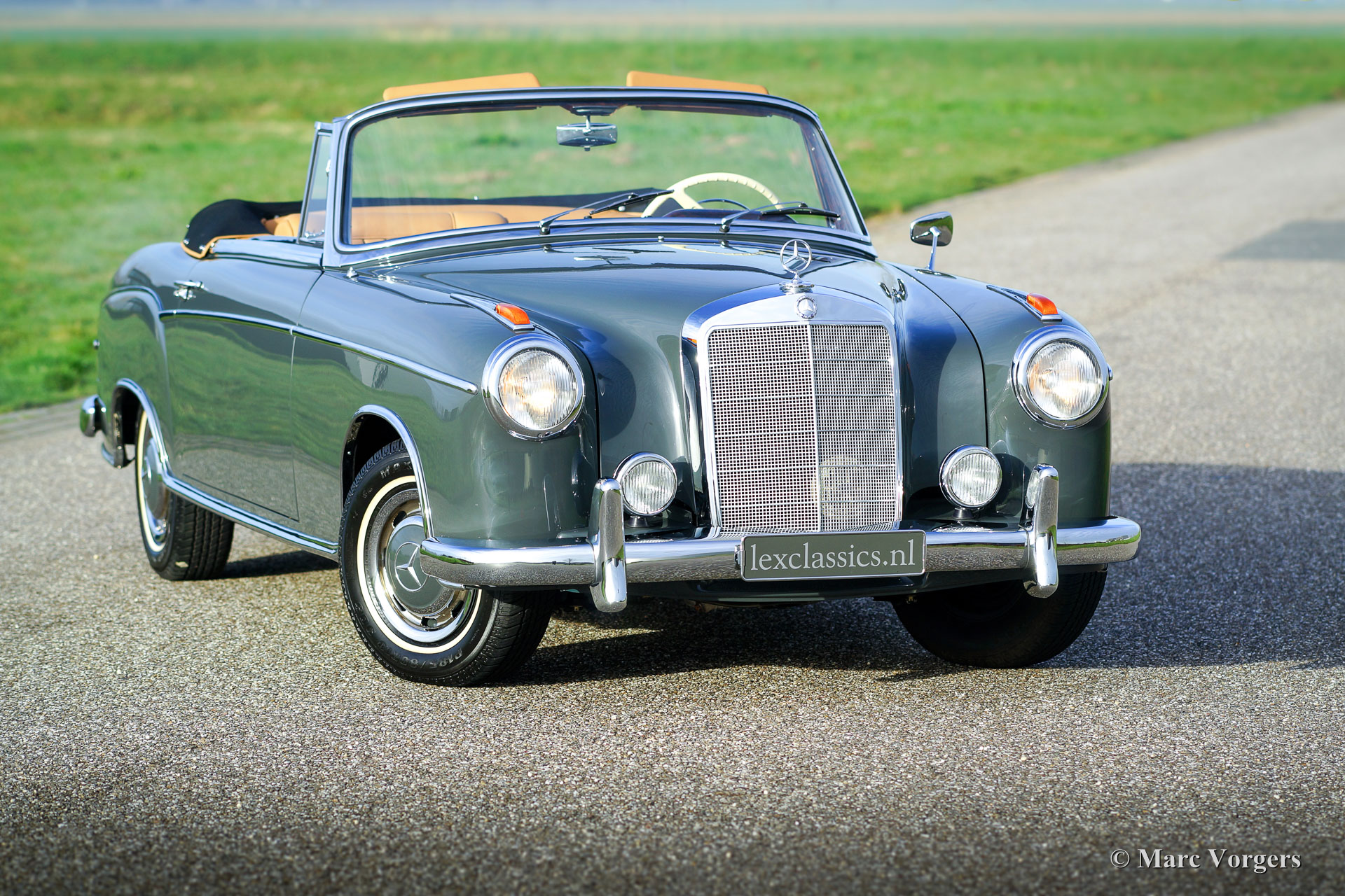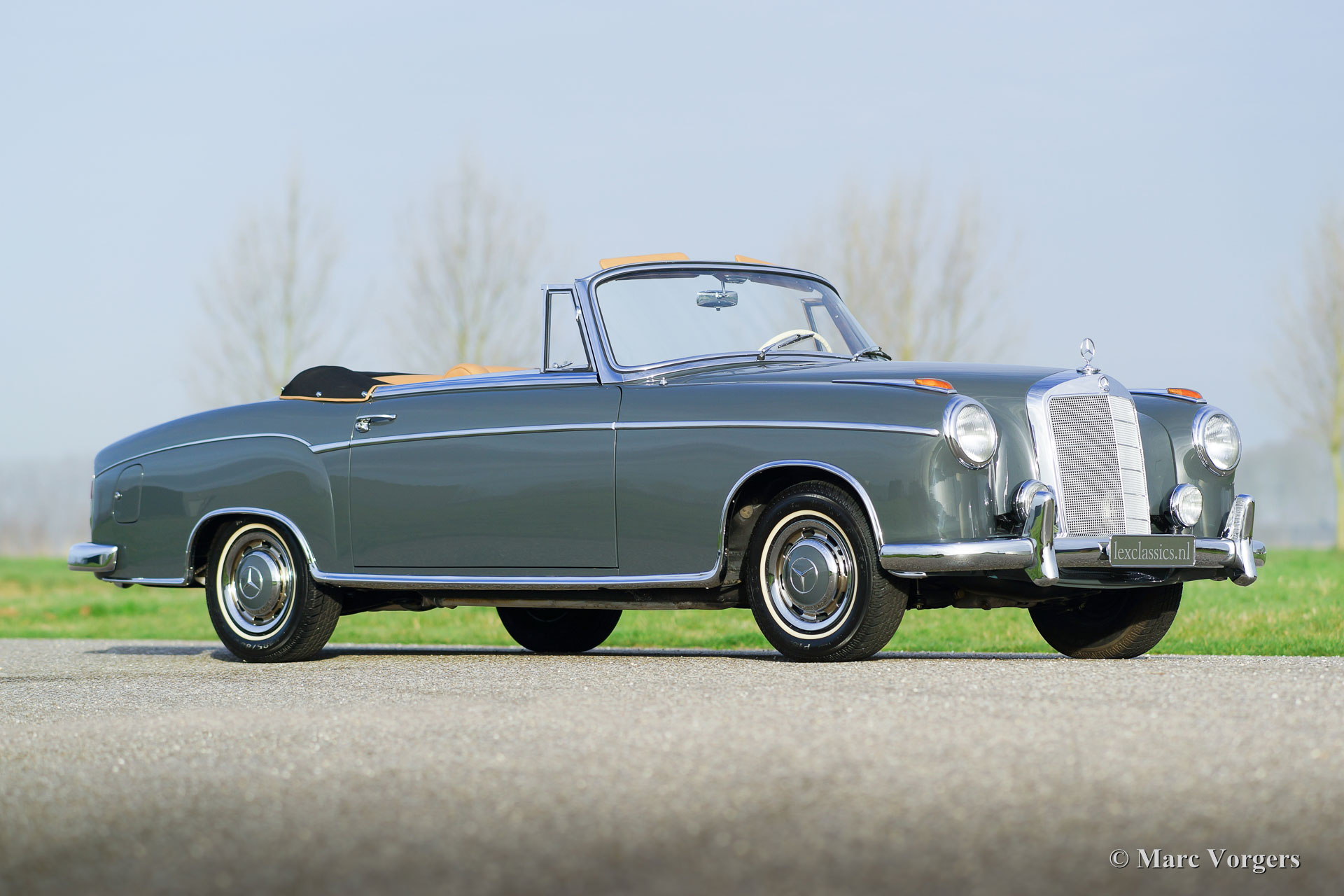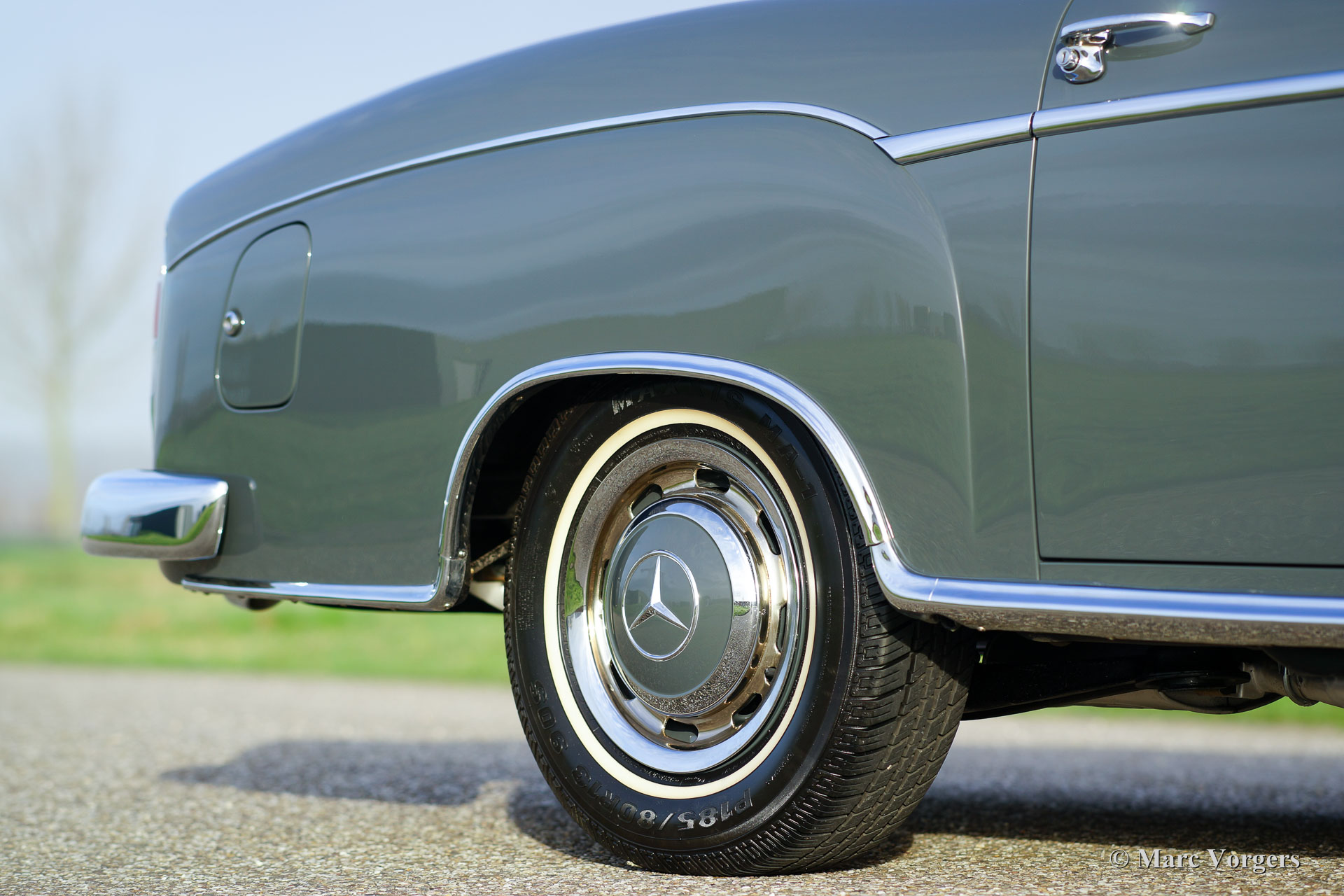 Mercedes-Benz 220 SE (W128) cabriolet, jaar 1960. Kleur grijs met een beige leren interieur en beige tapijt. Zwarte mohair kap, zwarte mohair kap-afdekking afgewerkt met beige biezen. Deze bijzonder fraaie Mercedes-Benz cabriolet werd uitvoerig, en met veel oog voor perfectie, gerestaureerd door en specialist. De automobiel verkeert in sublieme topstaat; concours. Een fotoreportage van de restauratie is aanwezig. Er werden slechts 1.112 exemplaren van deze vierpersoons cabriolet gebouwd. De auto wordt compleet geleverd met een op maat gemaakte kofferset in de kofferbak. Dit is een absoluut top-exemplaar!