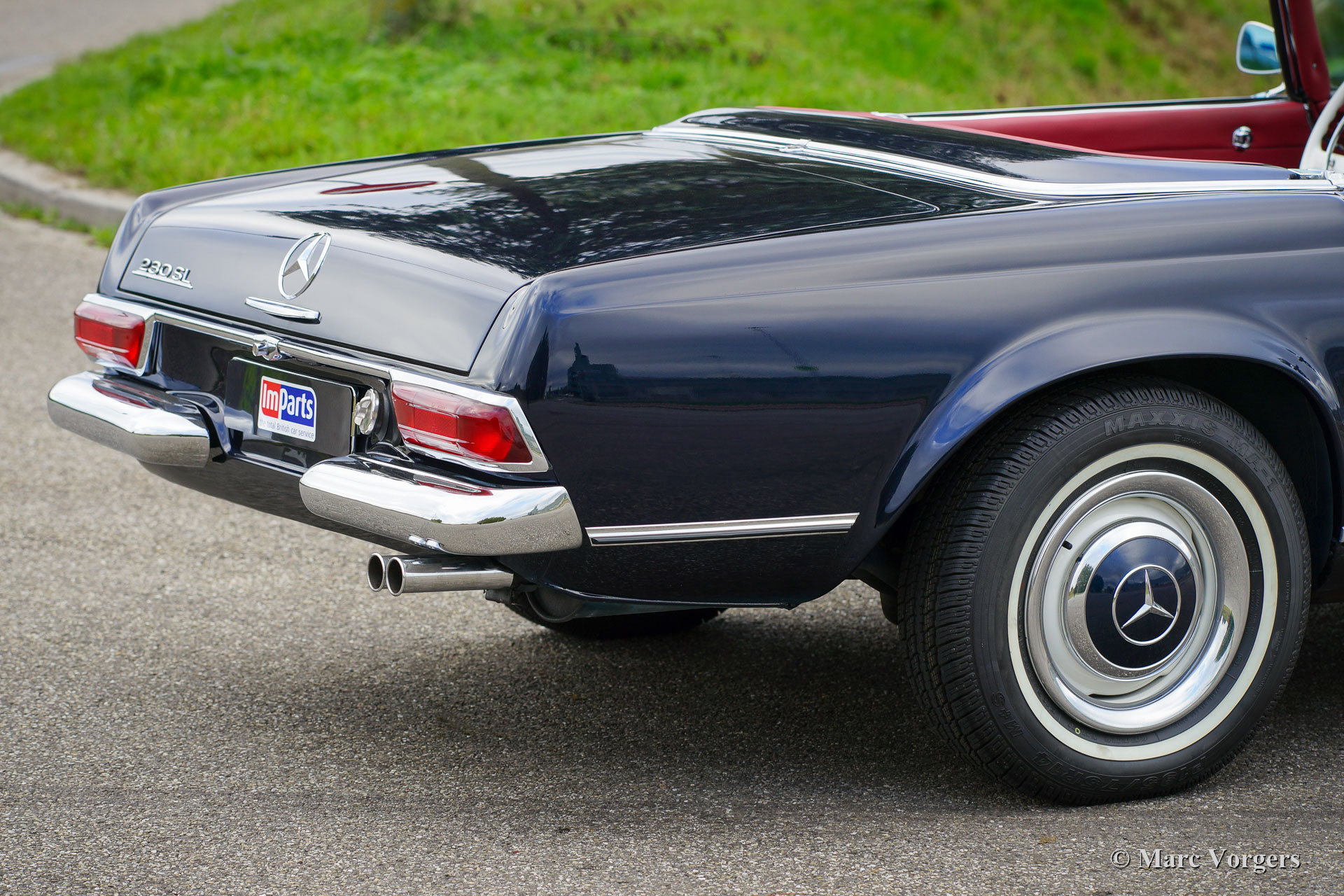 Mercedes-Benz 230 SL ‘Pagode’, jaar 1966. Kleur donkerblauw metallic gecombineerd met een donkerrood lederen interieur en rood tapijt. Donkerblauwe mohair cabriolet kap. Deze prachtige Mercedes-Benz 230 SL werd nieuw verkocht in de VS. De automobiel werd uitvoerig gerestaureerd en recent is de motor gereviseerd. De factuur van de motorrevisie is aanwezig. Deze Mercedes-Benz 230 SL ‘Pagode’ verkeert in zeer goede tot excellente conditie en de auto rijdt perfect. De auto toont alle originele details zoals het prachtige witte stuur en de stalen wielen met chromen wieldoppen. Onder de motorkap ziet alles er fantastisch uit, en alle originele puntlassen zijn nog zichtbaar zoals het hoort. De zescilinder-lijnmotor met benzine-injectie levert 170 pk en de automatische versnellingsbak met 4 versnellingen schakelt uitstekend. De 230 SL werd gebouwd van 1963 tot 1967, er werden 19.000 auto's van dit type gebouwd. De auto is voorzien van een klassieke Blaupunkt radio. Dit is een zeer fraai exemplaar!