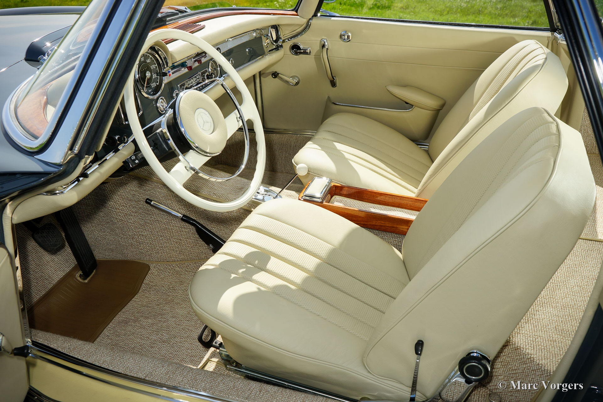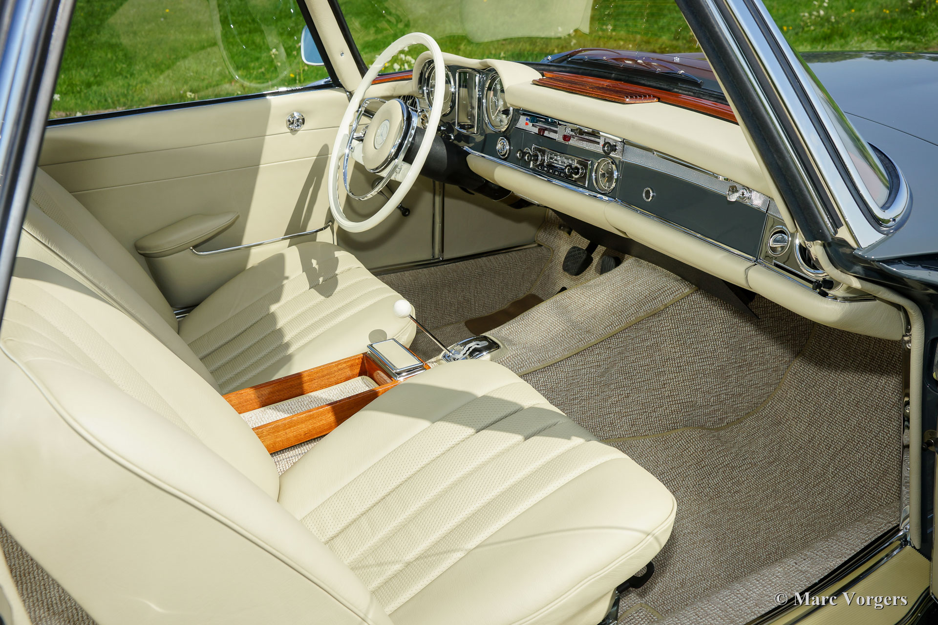 Mercedes-Benz 230 SL ‘Pagode’, jaar 1967. ‘Matching numbers’, MB ‘Datenkarte’ is aanwezig. Kleur grijs (Graphitgrau MB-kleurnummer 190) met een crèmekleurige ‘hard-top’ en een zwarte mohair ‘soft-top’. Beige leren interieur en beige tapijt. Deze fantastische Mercedes 230 SL Pagode is volledig en ‘body-off’ gerestaureerd in de periode 2014-2016. Werkelijk ALLES werd gerestaureerd, gereviseerd en vernieuwd! Er zijn circa 2000 uren aan deze toprestauratie besteed. Deze SL toont perfecte carrosserie passingen, alle originele puntlassen, een perfect aansluitende soft-top, een hagelnieuw gerestaureerde hard-top en een met de beste materialen gerestaureerd interieur; dit is een absoluut TOP-exemplaar in smetteloze A1 concoursstaat! Een uitgebreide fotoreportage van de restauratie is aanwezig. De auto is uitgerust met stuurbekrachtiging, rembekrachtiging, een automatische versnellingsbak en een prachtige klassieke Blaupunkt radio. Een mooier en beter exemplaar zult u niet snel vinden!