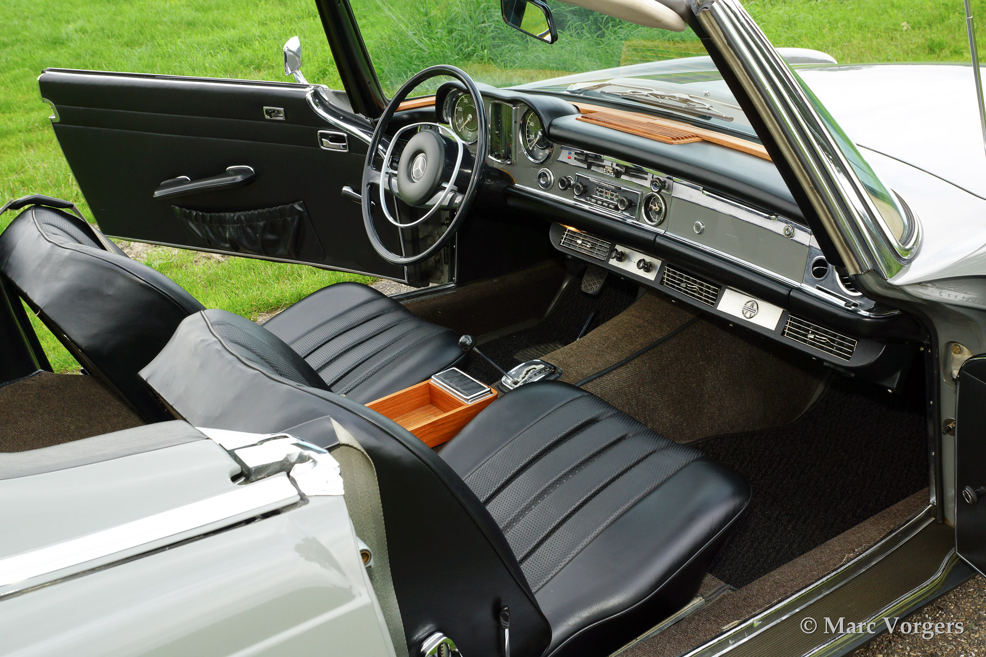 Mercedes-Benz 250 SL 'Pagode', bouwjaar 1967. Kleur 'Arabian' grijs met een zwart lederen interieur. Zwarte mohair soft top en hard top in carrosseriekleur. Deze prachtige en zeer originele 250 SL heeft een prachtige klassieke kleurcombinatie. Deze 250 SL werd geïmporteerd vanuit Californië, USA. De auto is uitgerust met stuurbekrachtiging, een automatische versnellingsbak, getinte ruiten en speciale driepuntsgordels.