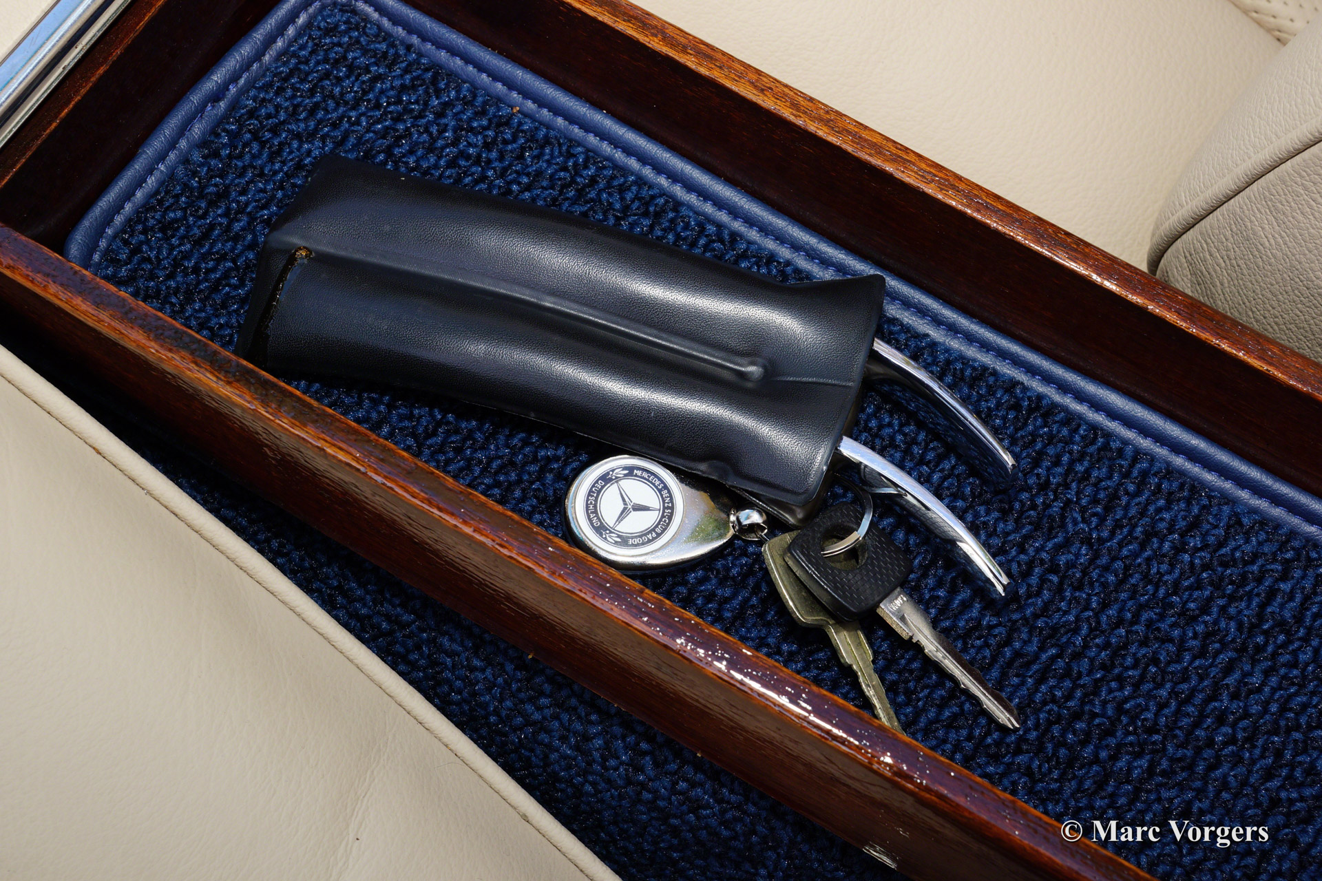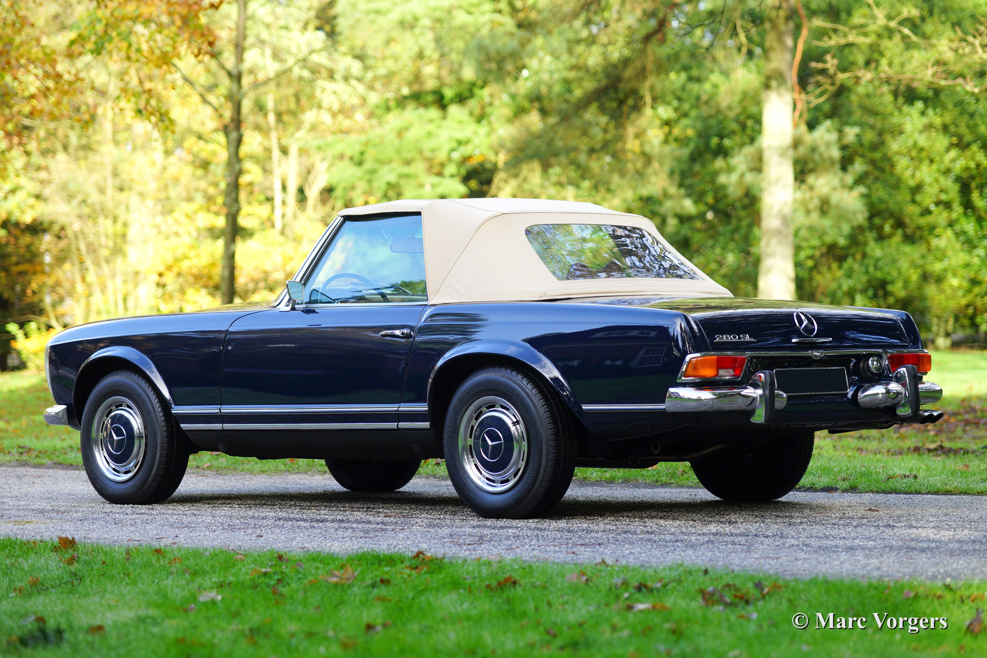 Mercedes-Benz 280 SL 'Pagode', bouwjaar 1970. Kleur donkerblauw (MB kleurcode 904). Beige lederen interieur (kleurcode 8000) en een beige soft top. Deze schitterende Mercedes-Benz 280 SL werd nieuw geleverd in Houston, Texas, USA.