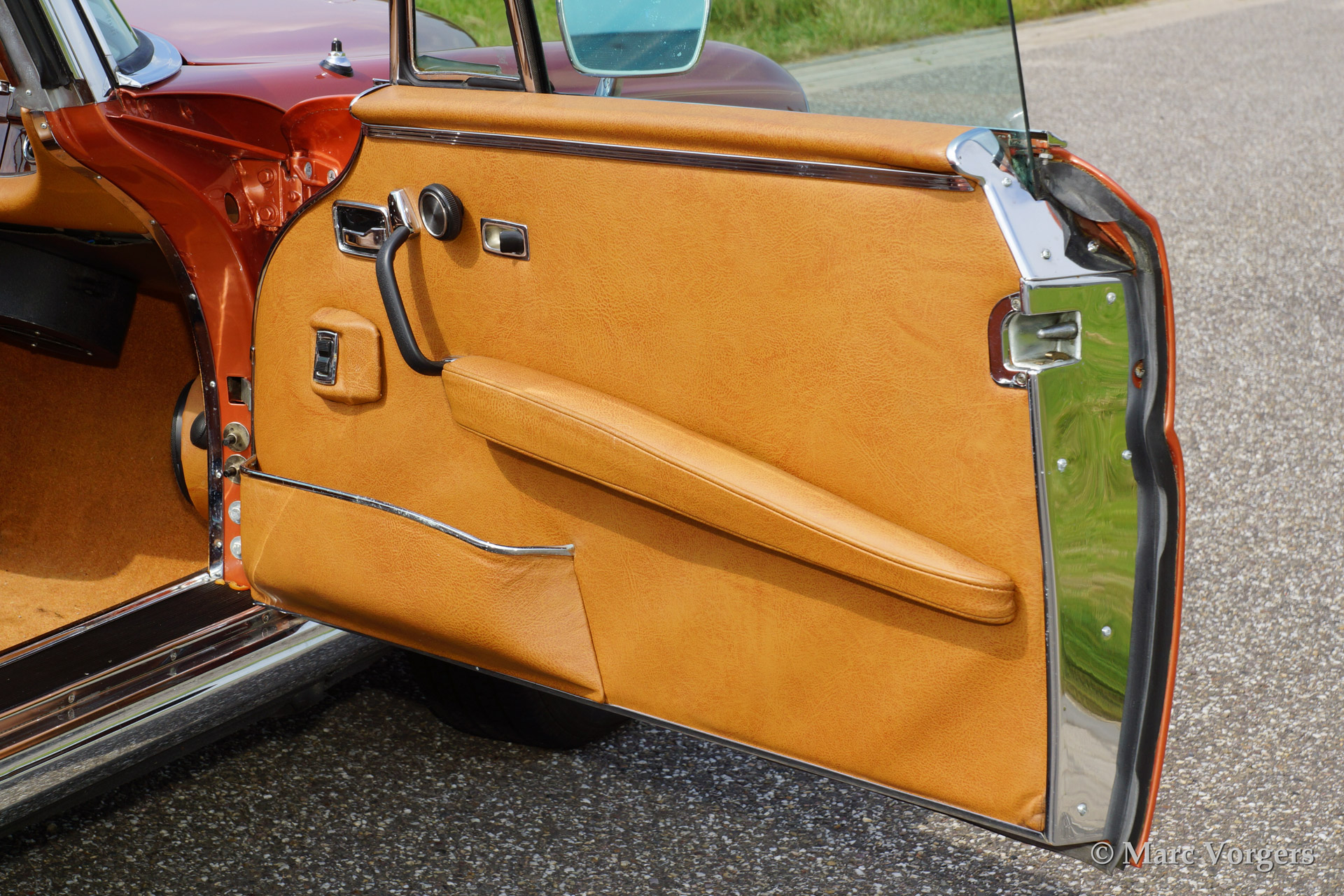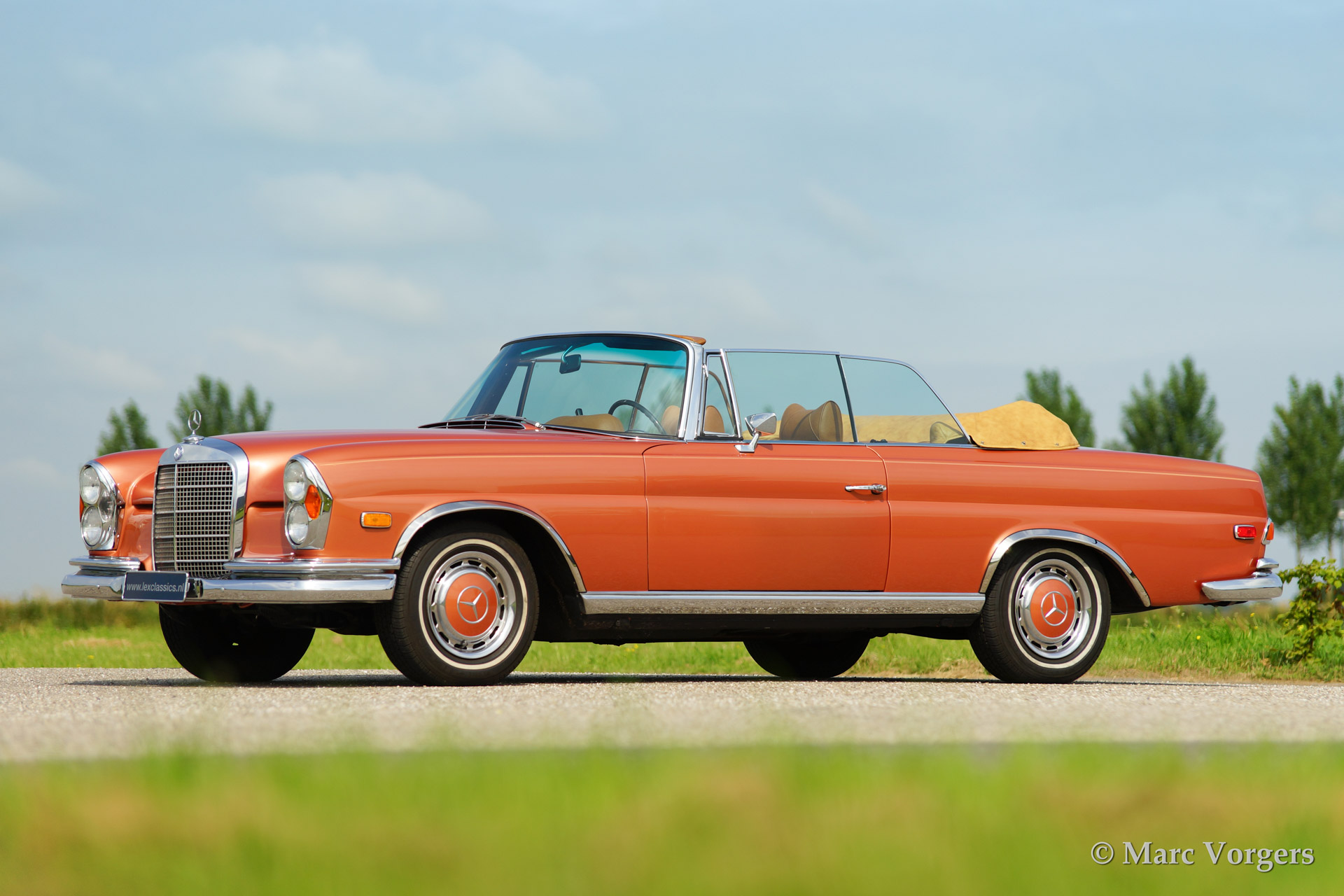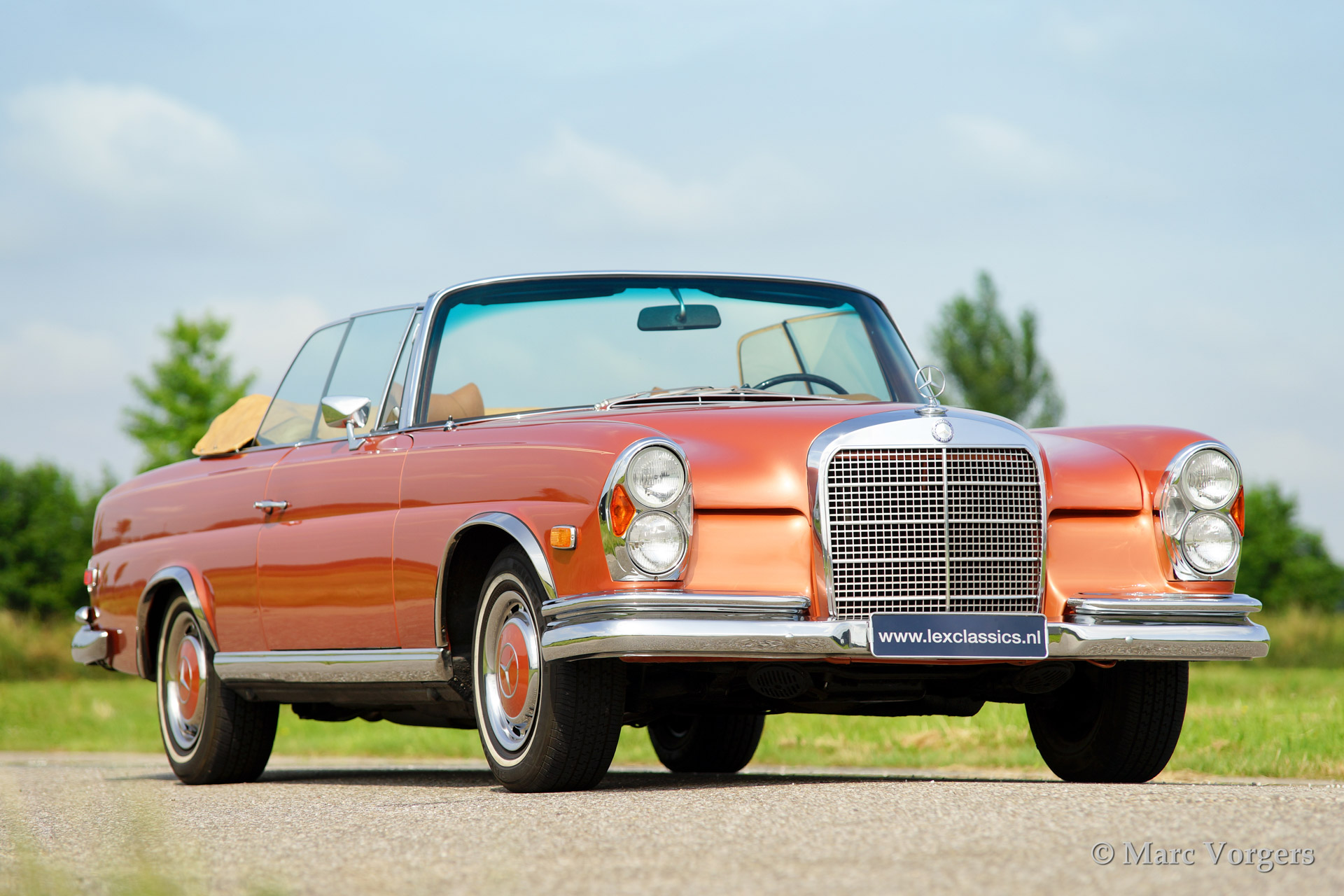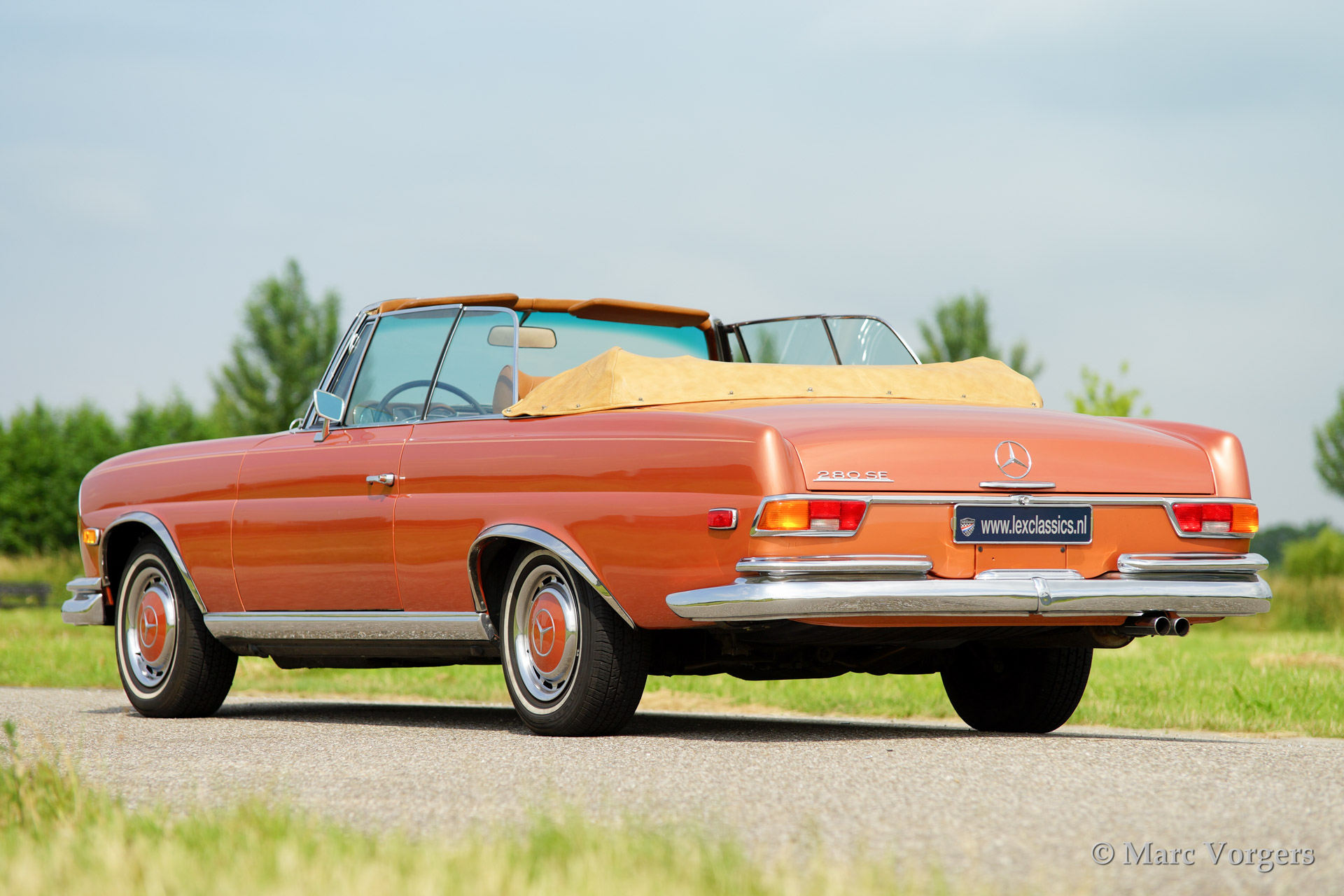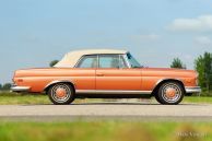 Mercedes-Benz 280 SE cabriolet (W111), bouwjaar 1969. Kleur 'Inca red' metallic (een zeer zeldzame kleur die op Mercedes R107 SL modellen werd toegepast) met een lichtbruin lederen interieur en een beige mohair cabrioletdak. De automobiel werd uitvoerig gerestaureerd in de USA. Deze indrukwekkende Mercedes is uitgerust met een voortreffelijk schakelende automatische vierversnellingsbak (stuurschakeling), elektrisch bediende zijruiten voor en achter, een elektrisch bediende kap, getinte ruiten, radio en airconditioning.