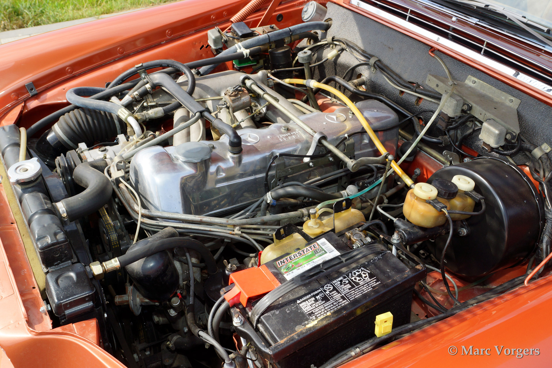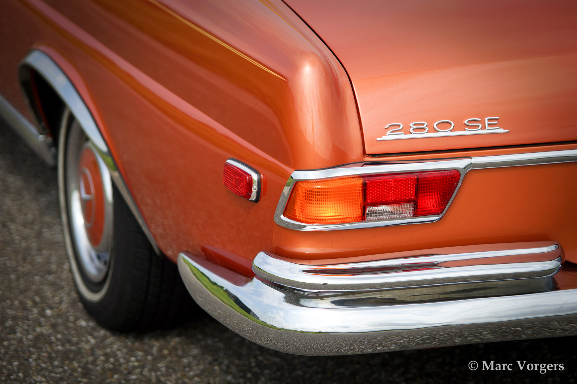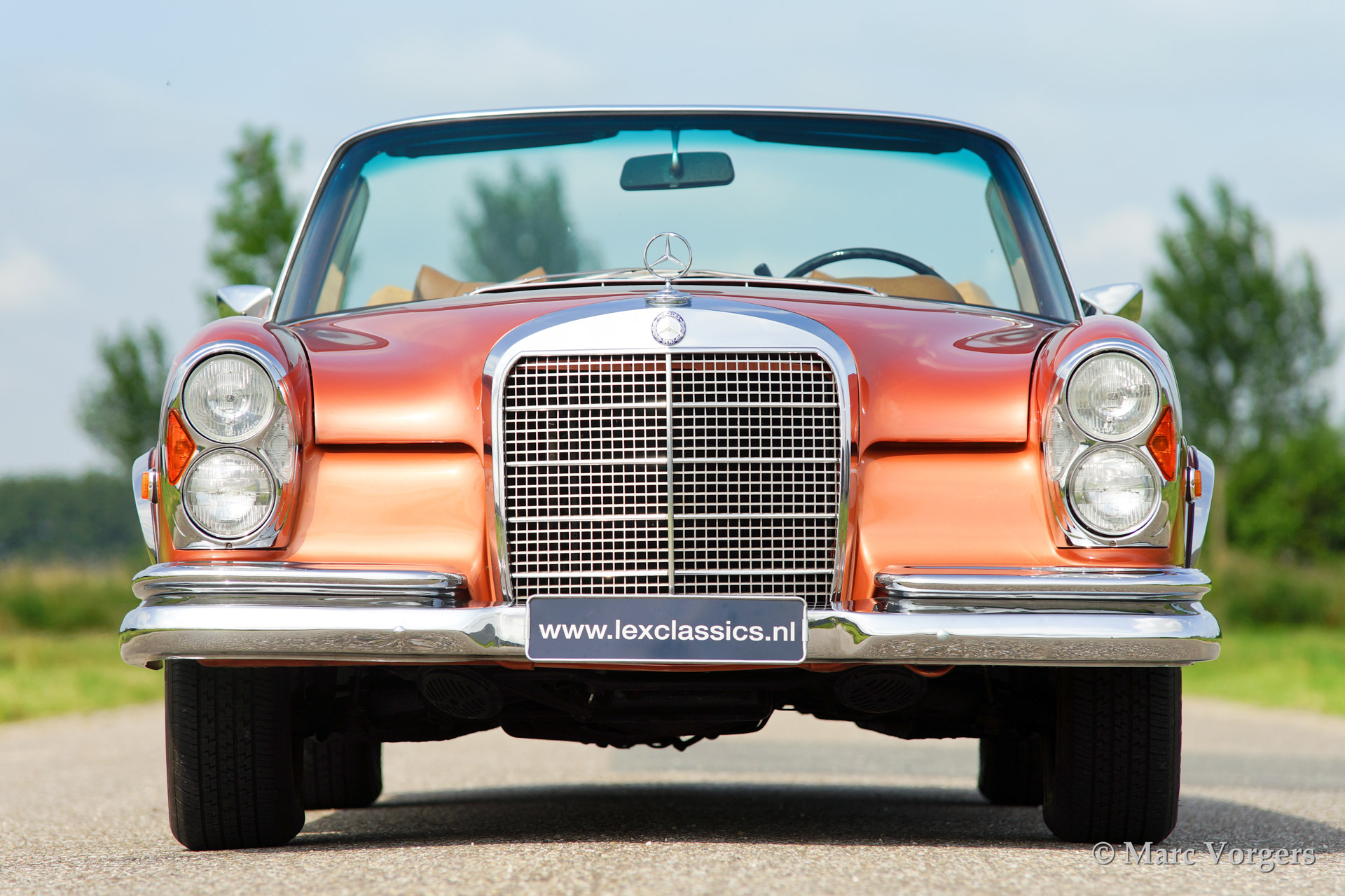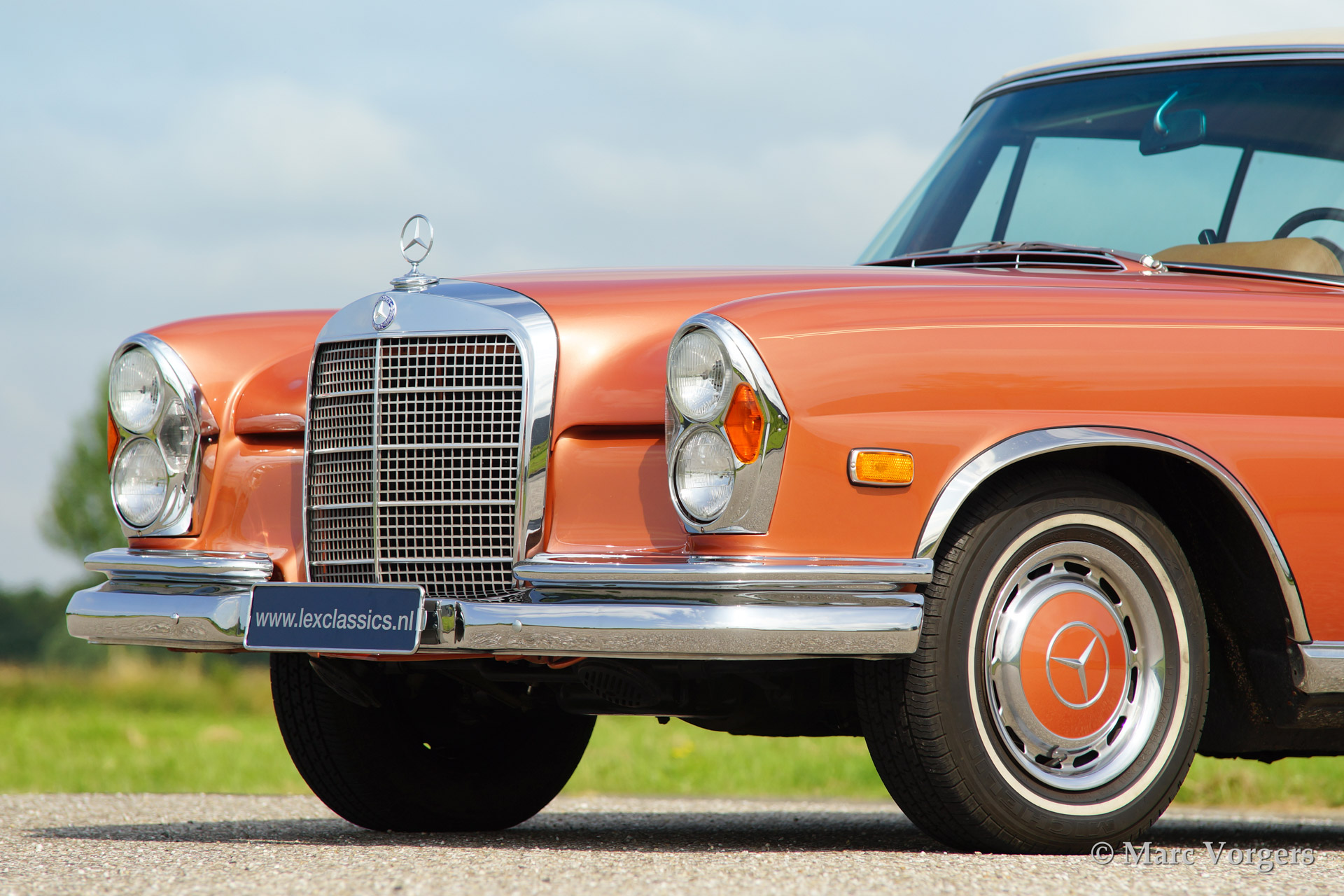 Mercedes-Benz 280 SE cabriolet (W111), bouwjaar 1969. Kleur 'Inca red' metallic (een zeer zeldzame kleur die op Mercedes R107 SL modellen werd toegepast) met een lichtbruin lederen interieur en een beige mohair cabrioletdak. De automobiel werd uitvoerig gerestaureerd in de USA. Deze indrukwekkende Mercedes is uitgerust met een voortreffelijk schakelende automatische vierversnellingsbak (stuurschakeling), elektrisch bediende zijruiten voor en achter, een elektrisch bediende kap, getinte ruiten, radio en airconditioning.