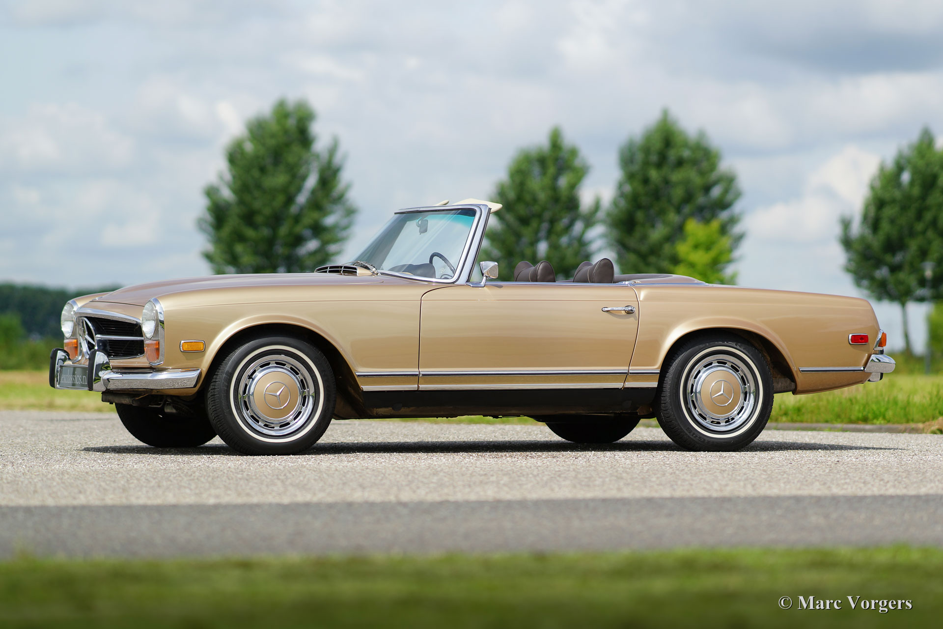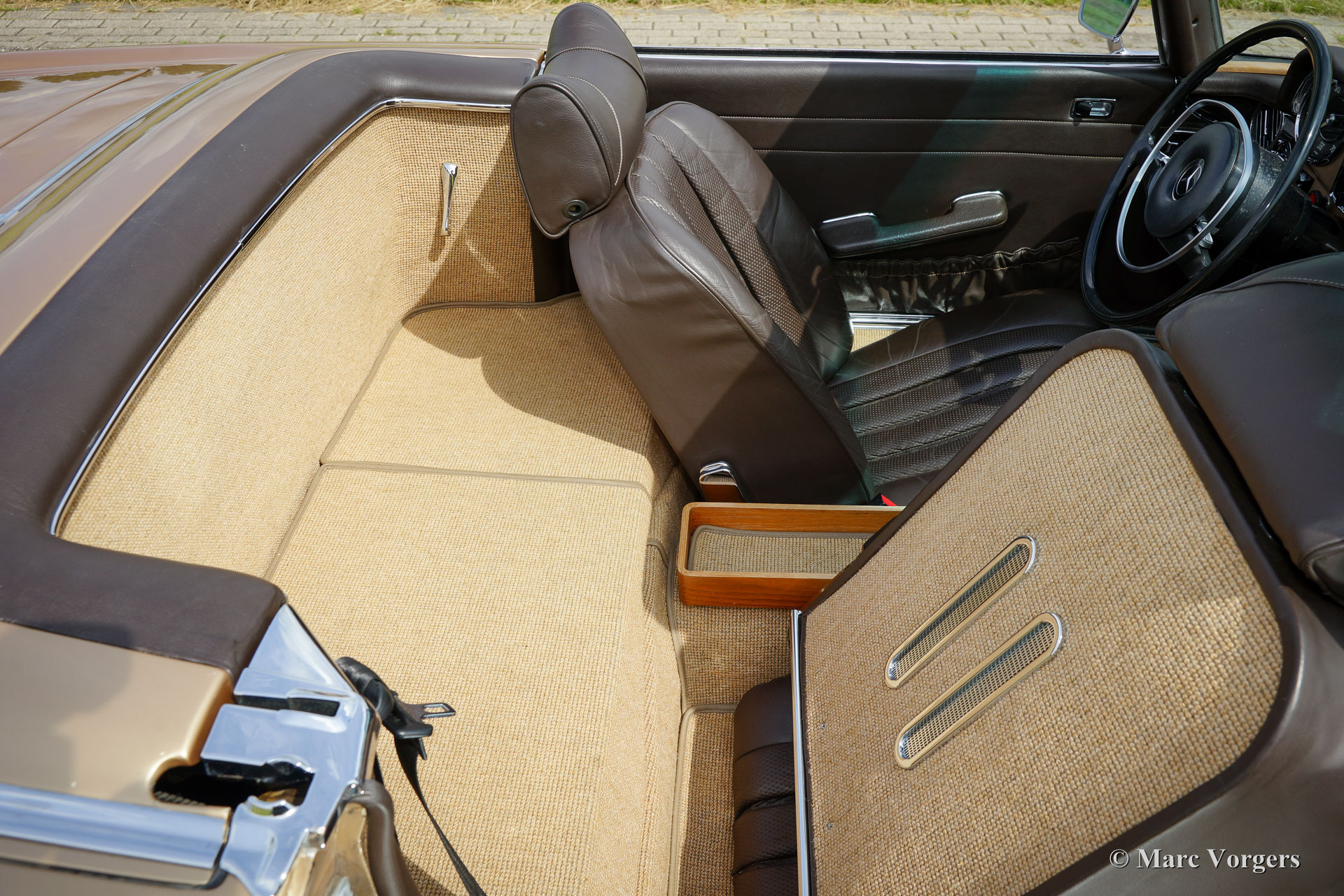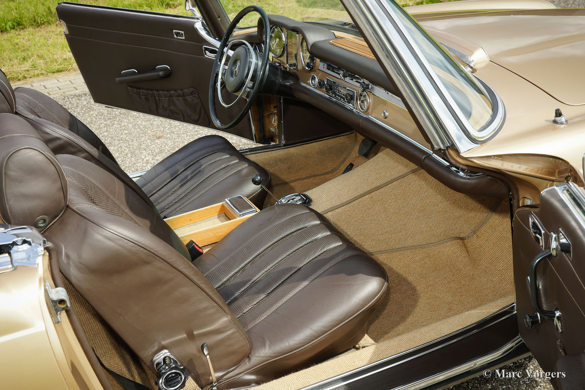 Mercedes-Benz 280 SL ‘Pagode’, jaar 1969. Kleur beige metallic met een donkerbruin leren interieur en beige vloerbedekking. ‘Hard-top’ in carrosseriekleur en donkerbruine ‘soft-top’. Deze geweldige Mercedes-Benz 280 SL werd nieuw verkocht in de USA waar de auto jarenlang gekoesterd werd. Deze 280 SL ‘Pagode’ verkeert namelijk in excellente tot sublieme originele staat! De auto werd in het verleden slechts een keer zeer fraai overgespoten in de originele kleur. Deze 280 SL rijdt zoals een nieuwe Pagode ooit gereden moet hebben; absoluut perfect en als nieuw! De auto voelt zeer solide en alles is zeer fraai afgewerkt. Een dergelijke, uitstekende en originele, 280 SL is zeer moeilijk te vinden. Een uitstekende investering omdat originaliteit tijdens een restauratie nooit en te nimmer teruggebracht kan worden. Deze 280 SL is voorzien van een uitstekend schakelende 4-traps automatische versnellingsbak en de auto toont alle originele details.