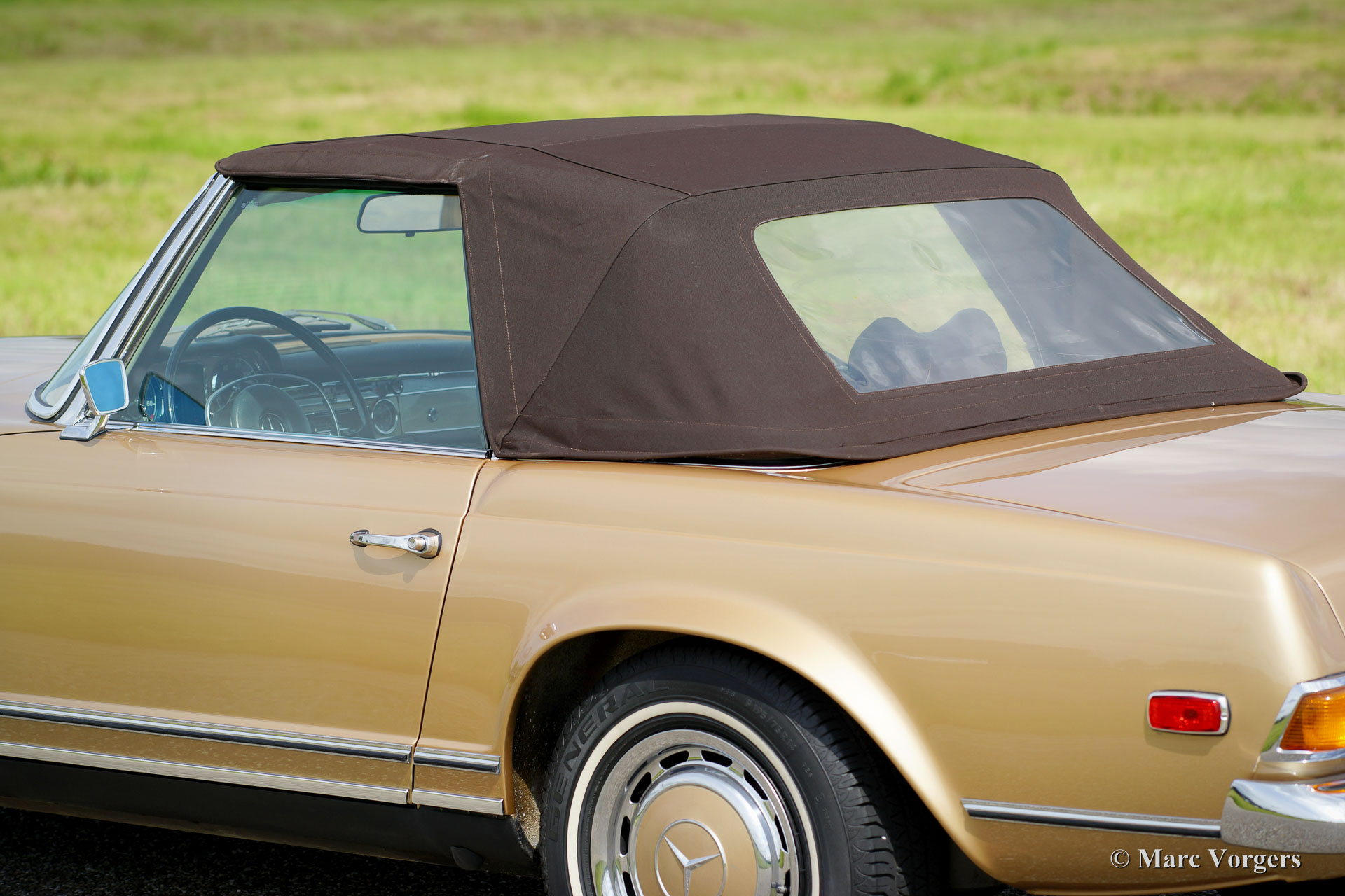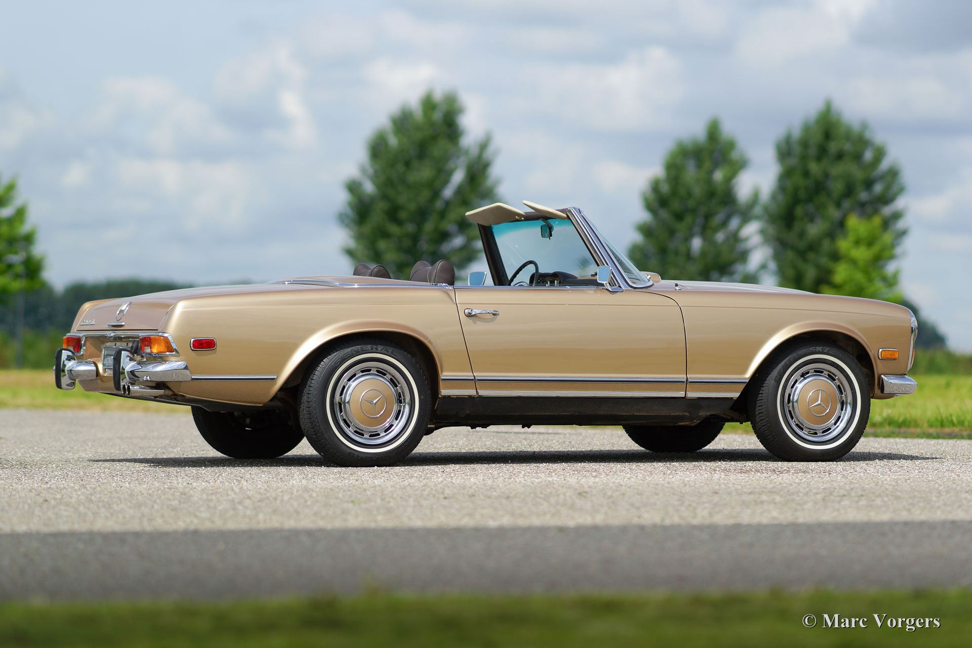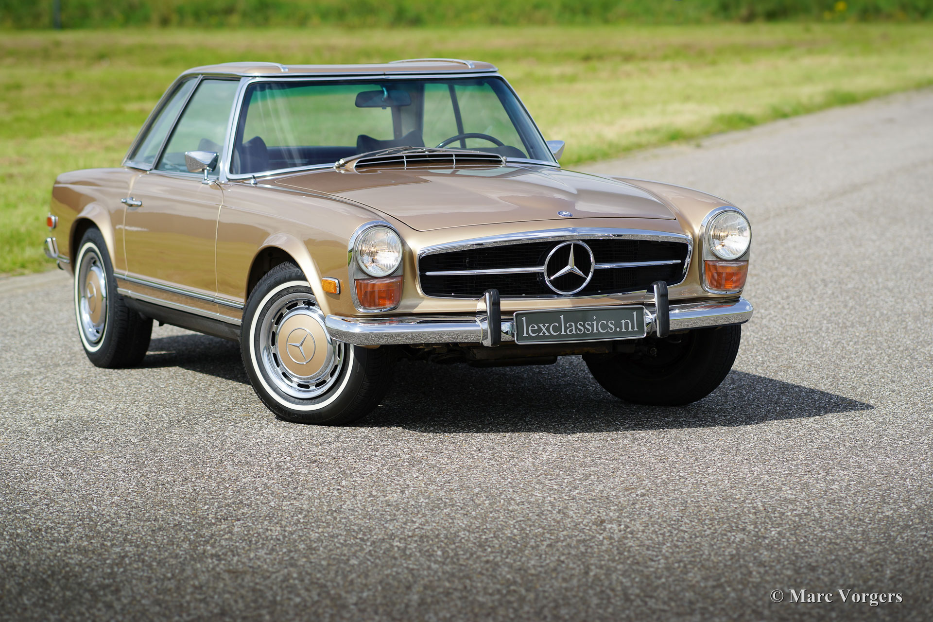 Mercedes-Benz 280 SL ‘Pagode’, jaar 1969. Kleur beige metallic met een donkerbruin leren interieur en beige vloerbedekking. ‘Hard-top’ in carrosseriekleur en donkerbruine ‘soft-top’. Deze geweldige Mercedes-Benz 280 SL werd nieuw verkocht in de USA waar de auto jarenlang gekoesterd werd. Deze 280 SL ‘Pagode’ verkeert namelijk in excellente tot sublieme originele staat! De auto werd in het verleden slechts een keer zeer fraai overgespoten in de originele kleur. Deze 280 SL rijdt zoals een nieuwe Pagode ooit gereden moet hebben; absoluut perfect en als nieuw! De auto voelt zeer solide en alles is zeer fraai afgewerkt. Een dergelijke, uitstekende en originele, 280 SL is zeer moeilijk te vinden. Een uitstekende investering omdat originaliteit tijdens een restauratie nooit en te nimmer teruggebracht kan worden. Deze 280 SL is voorzien van een uitstekend schakelende 4-traps automatische versnellingsbak en de auto toont alle originele details.