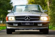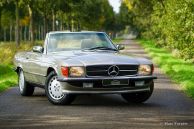 Mercedes-Benz 300 SL (R107), jaar 1987. Kleur ‘Rauchsilber’ (kleurcode DB702) gecombineerd met een beige interieur en beige tapijt. Zwarte softtop en originele hardtop in carrosseriekleur. Deze prachtige Mercedes-Benz 300 SL werd nieuw verkocht in Nederland, de auto heeft drie liefhebbers als eigenaren gekend. De volledige (service) geschiedenis is bekend en perfect gedocumenteerd. Dit is een vrij zeldzaam 300 SL zescilindermodel uitgerust met de M103-motor. De auto verkeert in sublieme originele conditie en de auto rijdt als nieuw! Deze Mercedes-Benz heeft 133.3338 kilometer gereden. Dit exemplaar van topklasse wordt compleet geleverd met alle originele boekjes, alle originele sleutels en de originele gereedschapset. Deze fraaie 300 SL is uitgerust met de volgende opties: Automatische versnellingsbak MB code 420, metallic lak code 702, bekleding code 175, groen getint glas code 592, elektrische ruiten code 583, centrale vergrendeling code 466, buitentemperatuur meter code 240, koplampsproeiers/ wissers code 600, achterbank code 565, rechter achteruitkijkspiegel code 502, centrale armsteun code 570, lichtmetalen wielen code 640, Becker Mexico 830 radio code 251, Hirschmann elektrische antenne code 531, klasse 2 alarmsysteem code 551. De originele hardtop werd zelden gebruikt. Dit is een prachtig exemplaar in een fantastische originele staat!