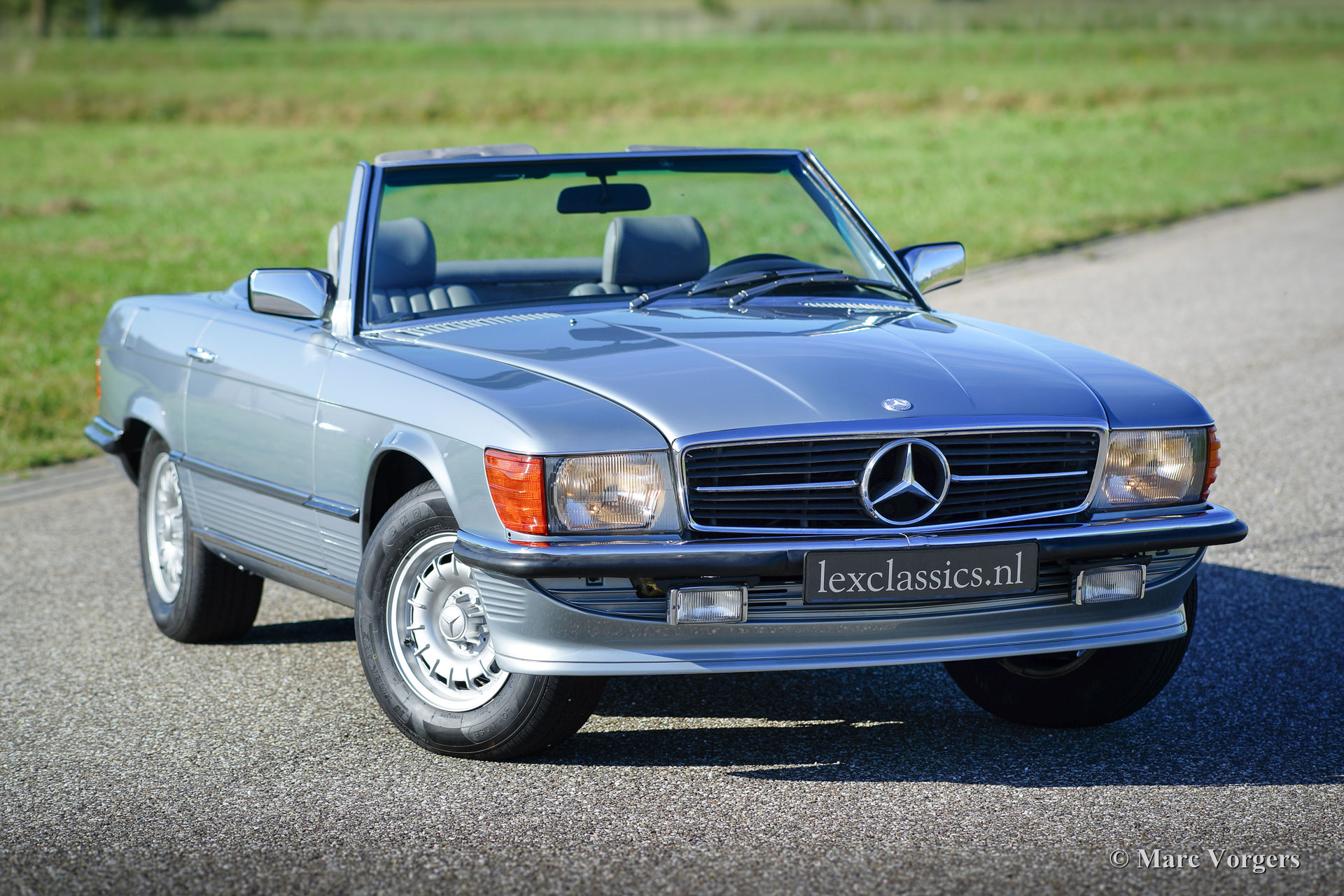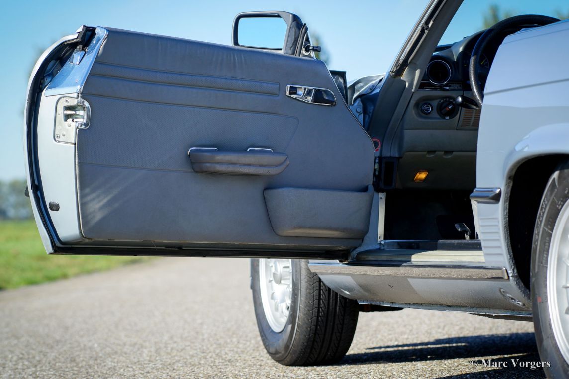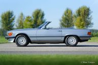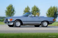 Mercedes-Benz 380 SL (R107), jaar 1982. Kleur lichtblauw (Silber Blau) metallic met een grijs lederen interieur en grijs tapijt. Blauwe mohair kap en een hard-top in carrosseriekleur. Het betreft een SL uit de zeer populaire R107 serie die van 1971 tot 1989 werd gebouwd. Deze 380 SL werd nieuw verkocht in Californië (USA), in het jaar 1992 werd de Mercedes in Nederland geïmporteerd. Aangekomen in Nederland werd de auto omgebouwd naar Europese uiterlijke specificaties. Deze Mercedes-Benz 380 SL verkeert in zeer goede staat en de auto rijdt perfect. De V8 motor is een heerlijkheid en de automatische versnellingsbak schakelt zeer soepel. De auto is compleet met de originele service- en instructieboekjes. Een kilometerstandenoverzicht vanaf 1992 is aanwezig. Opties: originele MB lichtmetalen wielen, cruise control, buitenspiegel rechts, antenne, wegklapbare armleuning, ‘climate control’, elektrisch bediende ramen en groen getint glas. Dit is een voortreffelijke ‘cruiser’ waarmee u comfortabel en in stijl door Europa kunt reizen onder het genot van de heerlijke V8 roffel.