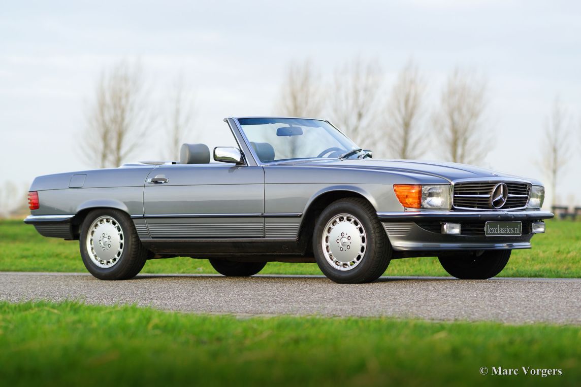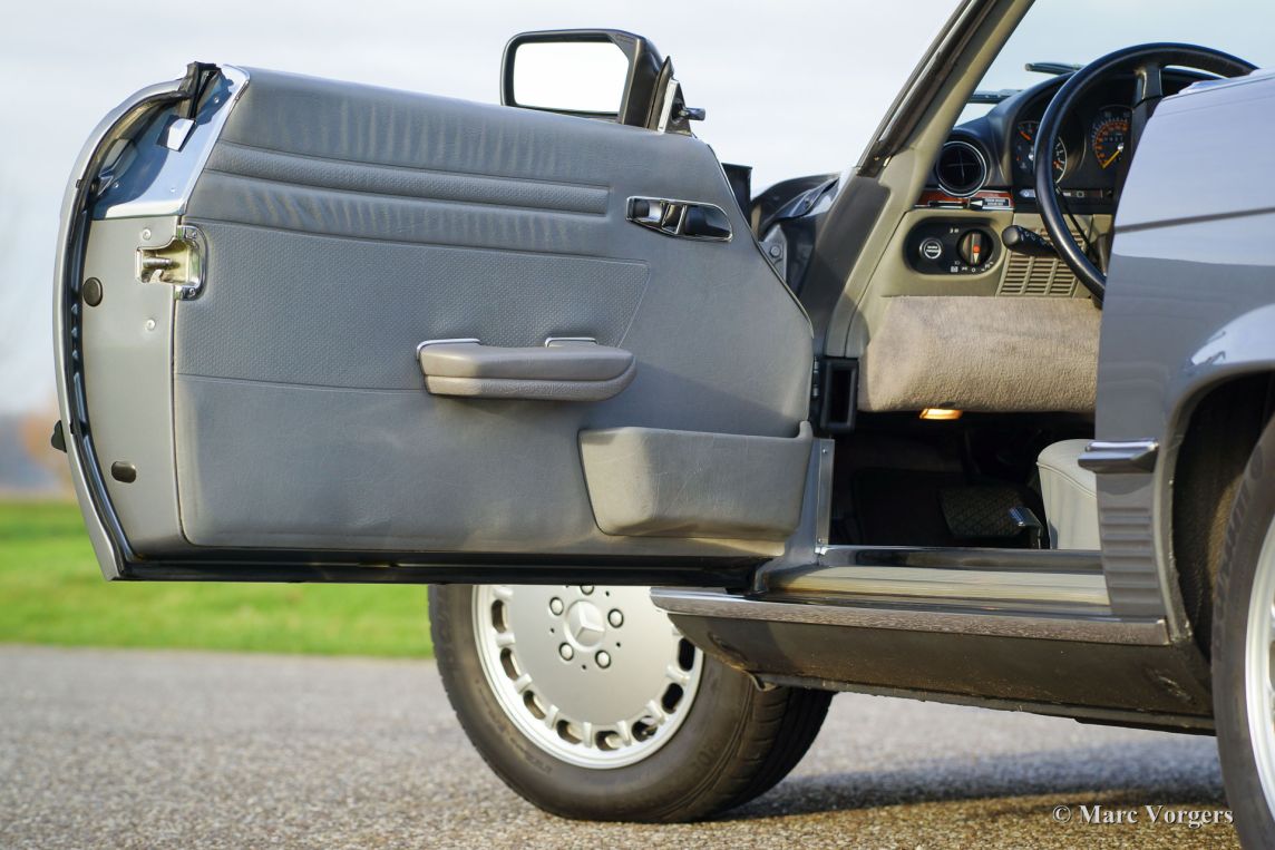 Mercedes-Benz 560 SL (R107), bouwjaar 1988. Kleur donkergrijs metallic met een lichtgrijs lederen interieur. Zwarte mohair cabrioletkap. Deze geweldige Mercedes-Benz 560 SL werd nieuw verkocht in Californië (USA). In het jaar 2014 werd de automobiel in België geïmporteerd. Aansluitend is deze 560 SL door een Mercedes-Benz-specialist geheel nagezien en technisch klaar gemaakt waarbij er ook een nieuwe originele versnellingsbak werd gemonteerd. Tevens werd deze fraaie 560 SL voorzien van Europese bumpers en koplampen. Dit is perfect gedaan, de auto verkeert in sublieme topstaat, als nieuw! Er werd meer dan 30.000,- Euro geïnvesteerd in deze auto, facturen hiervan zijn aanwezig.