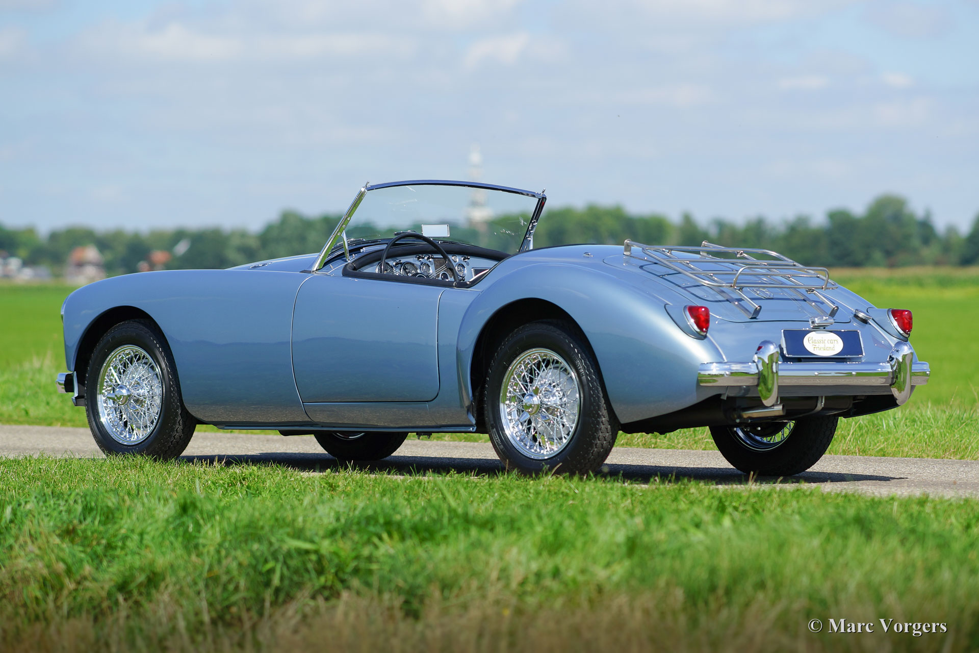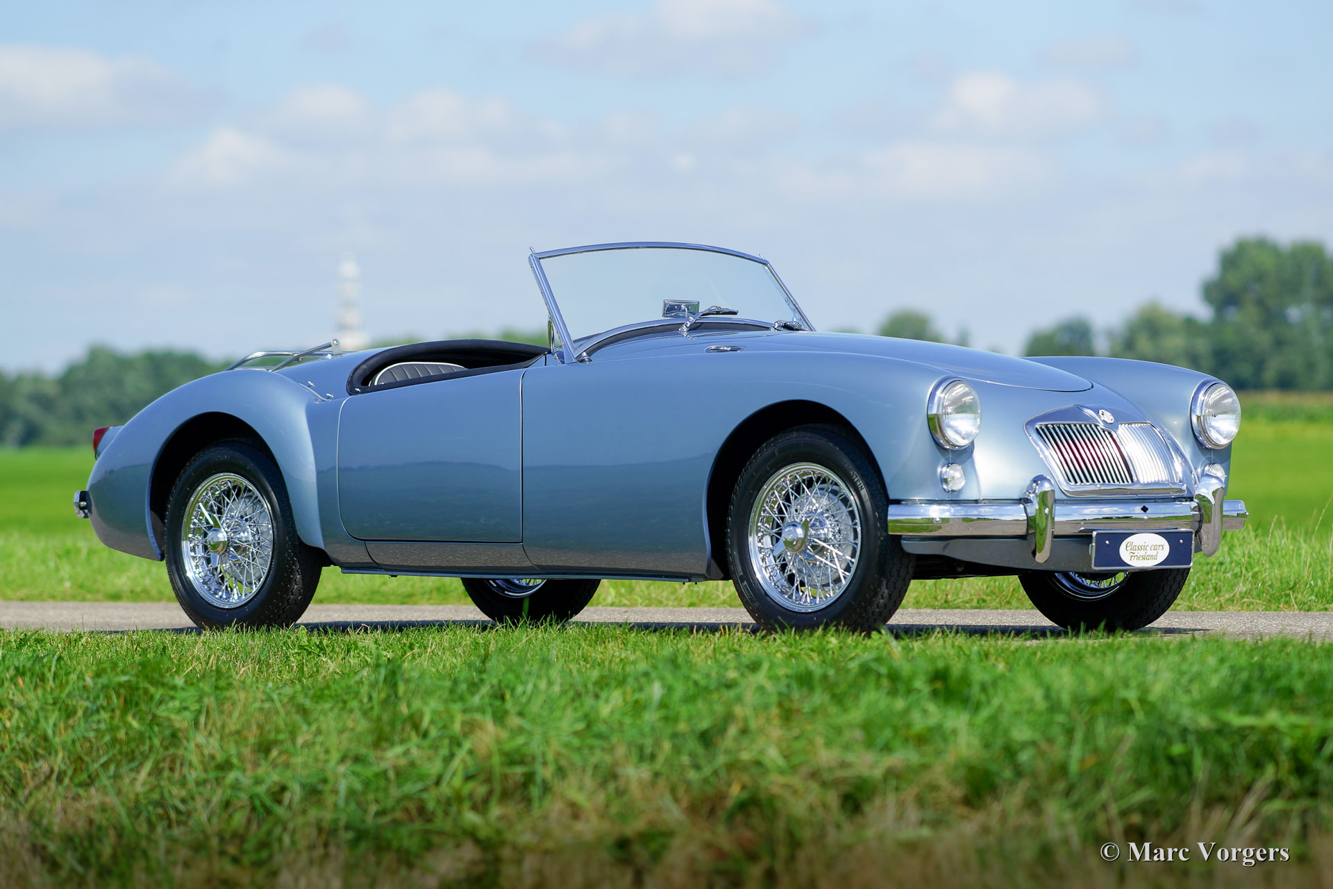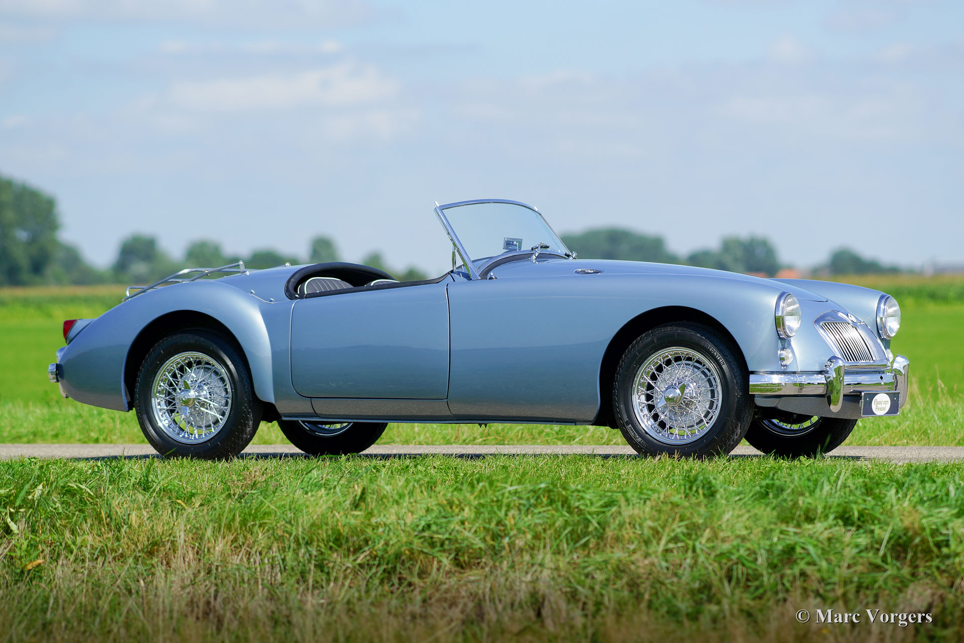MG MGA 1500 roadster, jaar 1957. Kleur Ice Blue metallic met een zwartlederen interieur afgewerkt met witte biezen. De auto is uitgerust met een zwarte mohair ‘soft-top’, zwarte tonneaucover en aluminium ‘side-screens’. Deze beeldschone MGA 1500 roadster werd uitvoerig gerestaureerd in Nederland. De restauratie is van zeer hoog niveau en de passingen van alle carosseriedelen is perfect. De motor en de versnellingsbak werden gereviseerd, het remsysteem vernieuwd, nieuw chroom, een nieuwe kabelboom etc. Een fotoreportage van de restauratie is aanwezig. Deze MGA verkeert in sublieme topstaat; nieuw! De auto is voorzien van chroom spaakwielen, Vredestein banden en een een rvs uitlaat. Een top-exemplaar in een zeer fraaie kleurstelling.