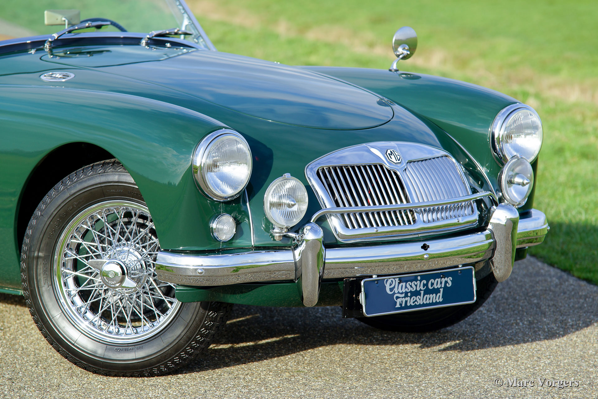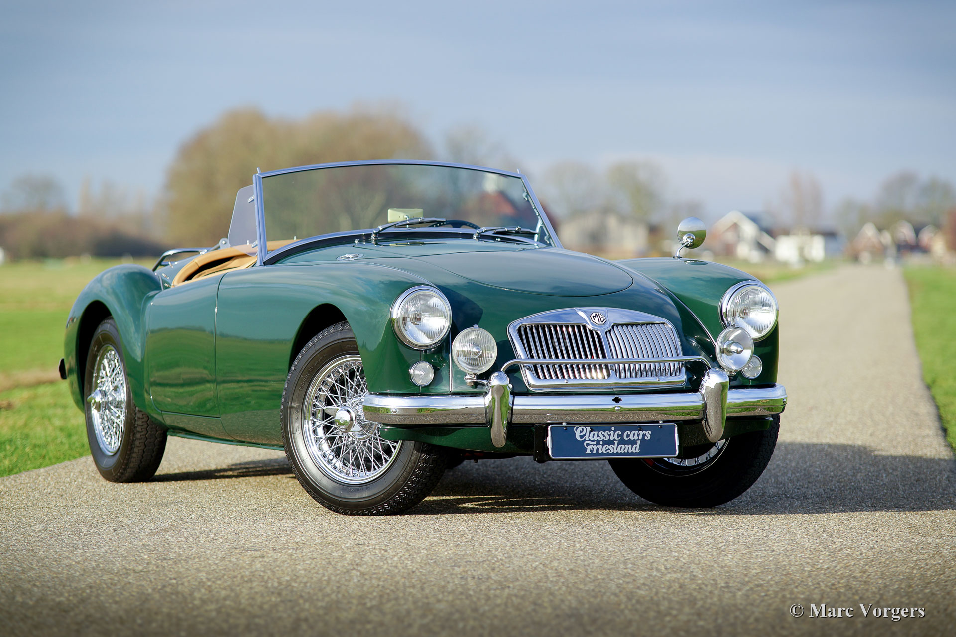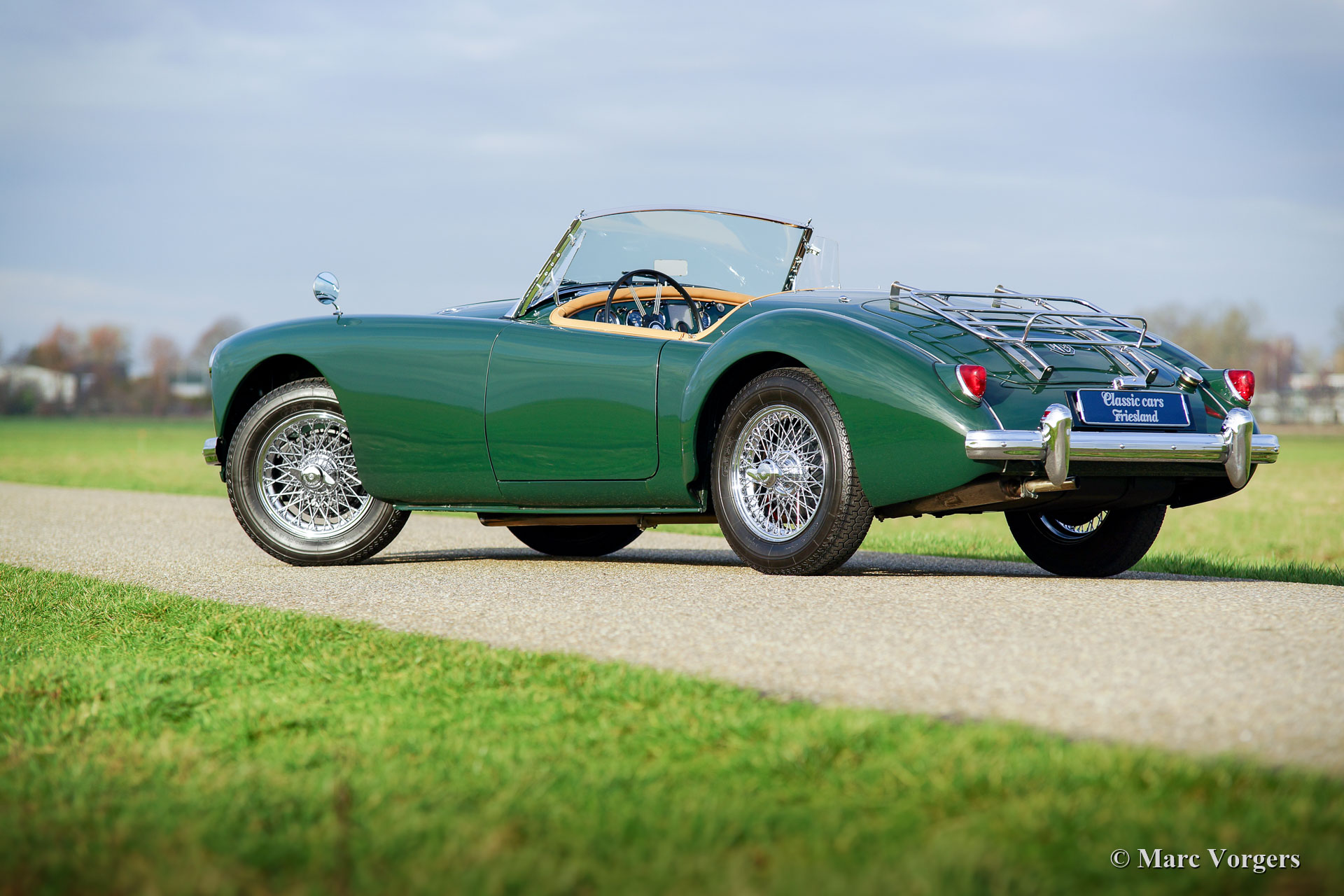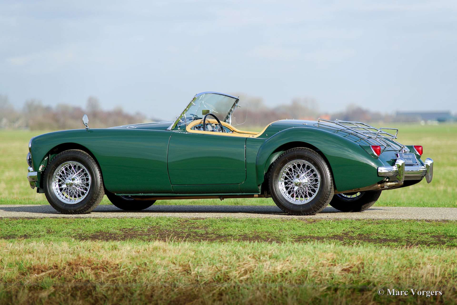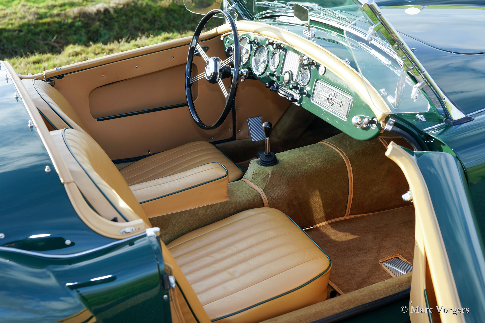MG MGA 1500 roadster, jaar 1957. Kleur British Racing Green gecombineerd met een beige leren interieur afgewerkt met donkergroene biezen en beige wollen tapijt. Zwarte mohair soft-top en tonneau-cover, zijruiten met aluminium frames. Deze prachtige MGA 1500 roadster werd uitgebreid en body-off gerestaureerd door een Nederlandse MG-liefhebber. De motor, versnellingsbak, remmen en koeling zijn gereviseerd en de kabelboom is vernieuwd. Een uitgebreid restauratieverslag is aanwezig. Deze prachtige MGA 1500 roadster verkeert in sublieme conditie en de auto rijdt voortreffelijk! De auto is uitgerust met verchroomde spaakwielen, een verchroomd bagagerek en een roestvrijstalen uitlaat. Een prachtig exemplaar!