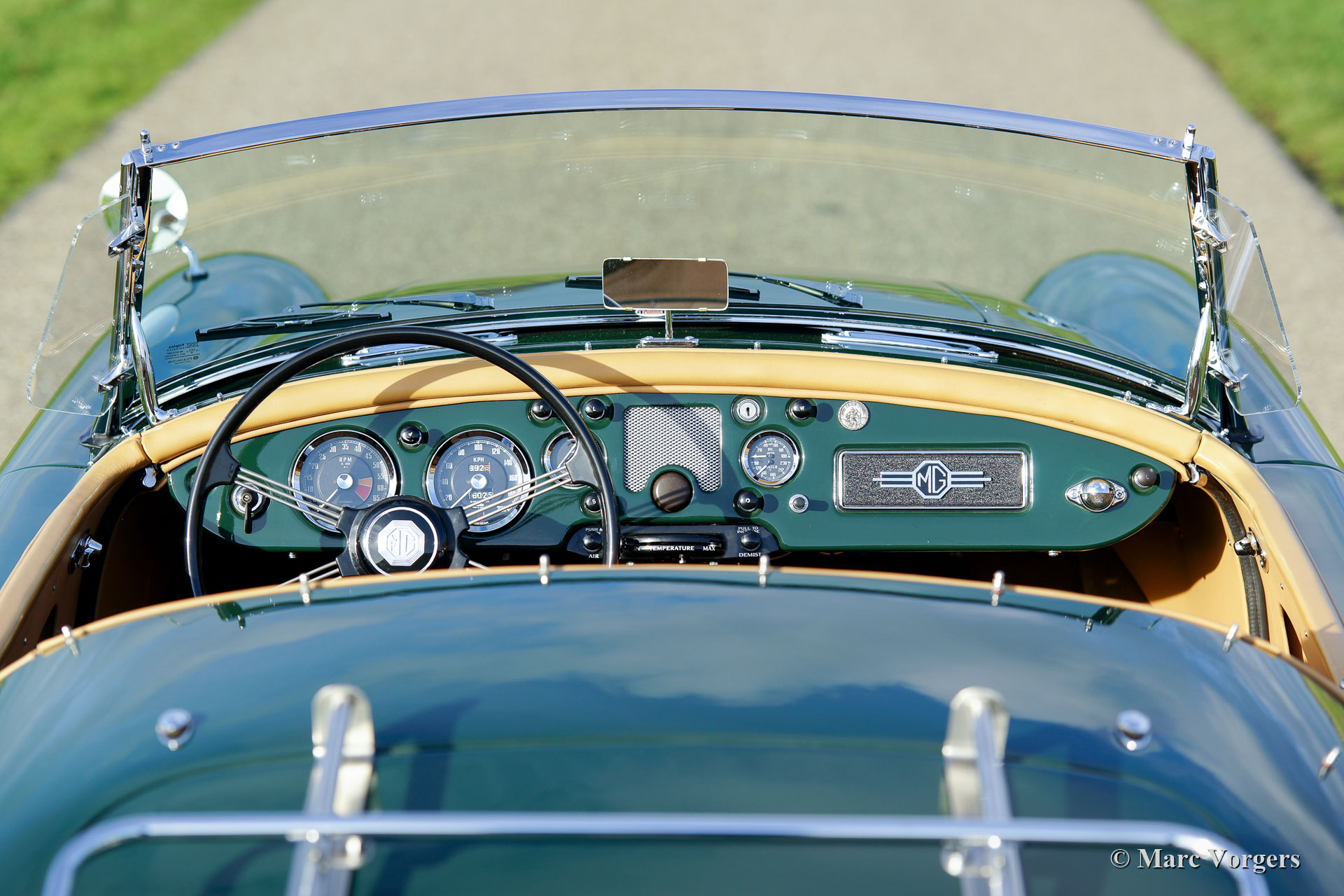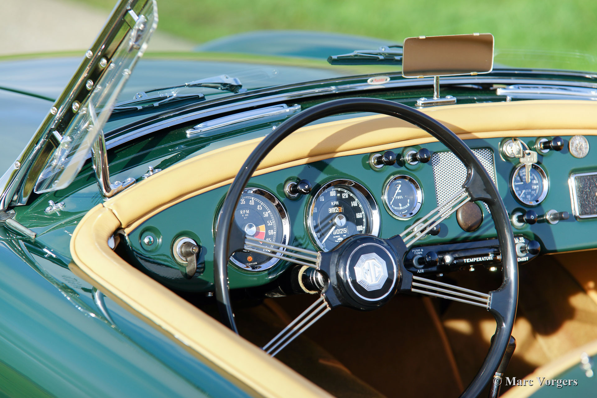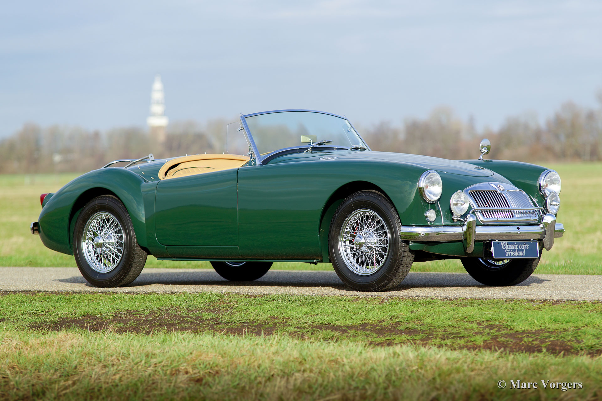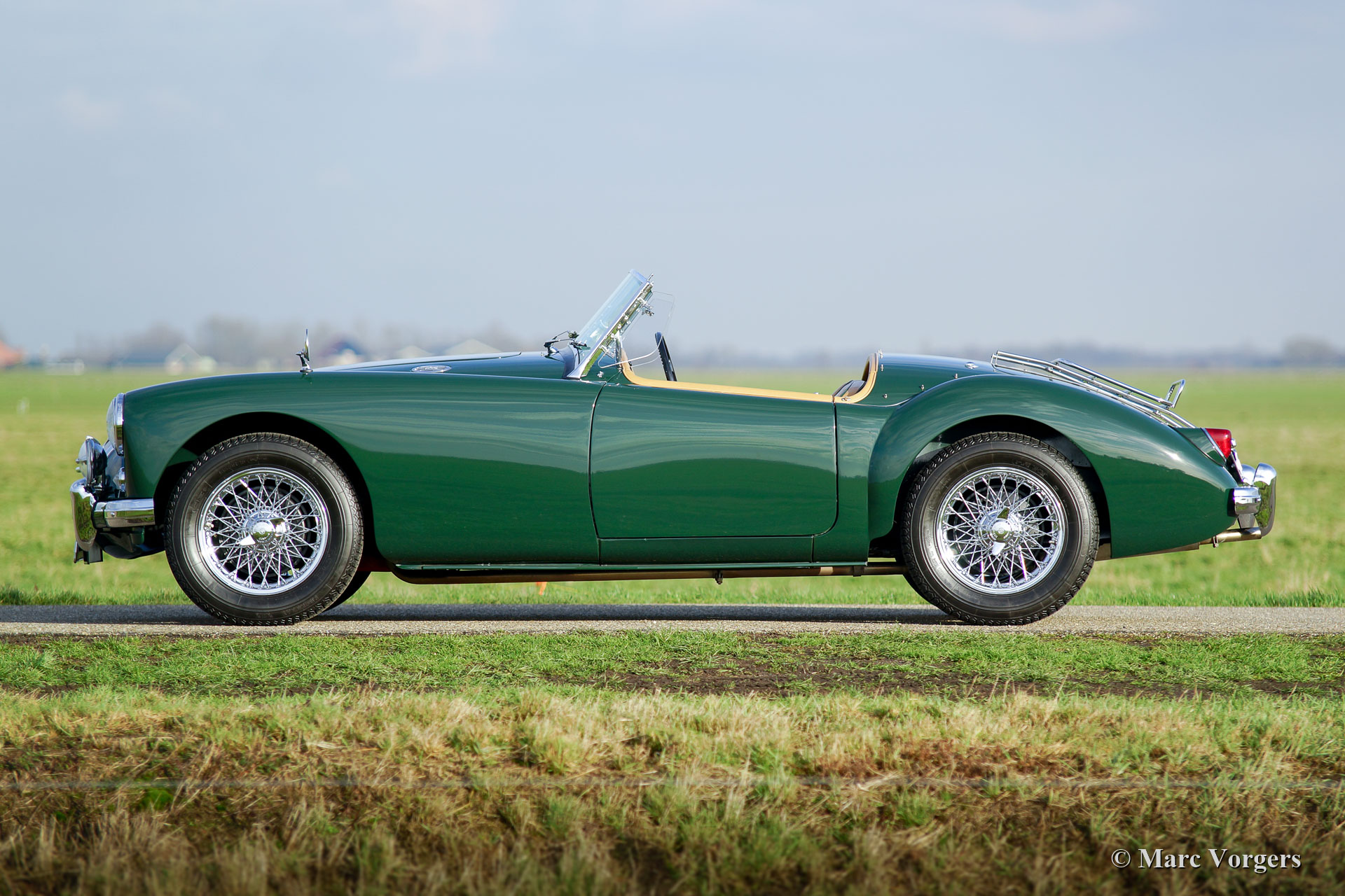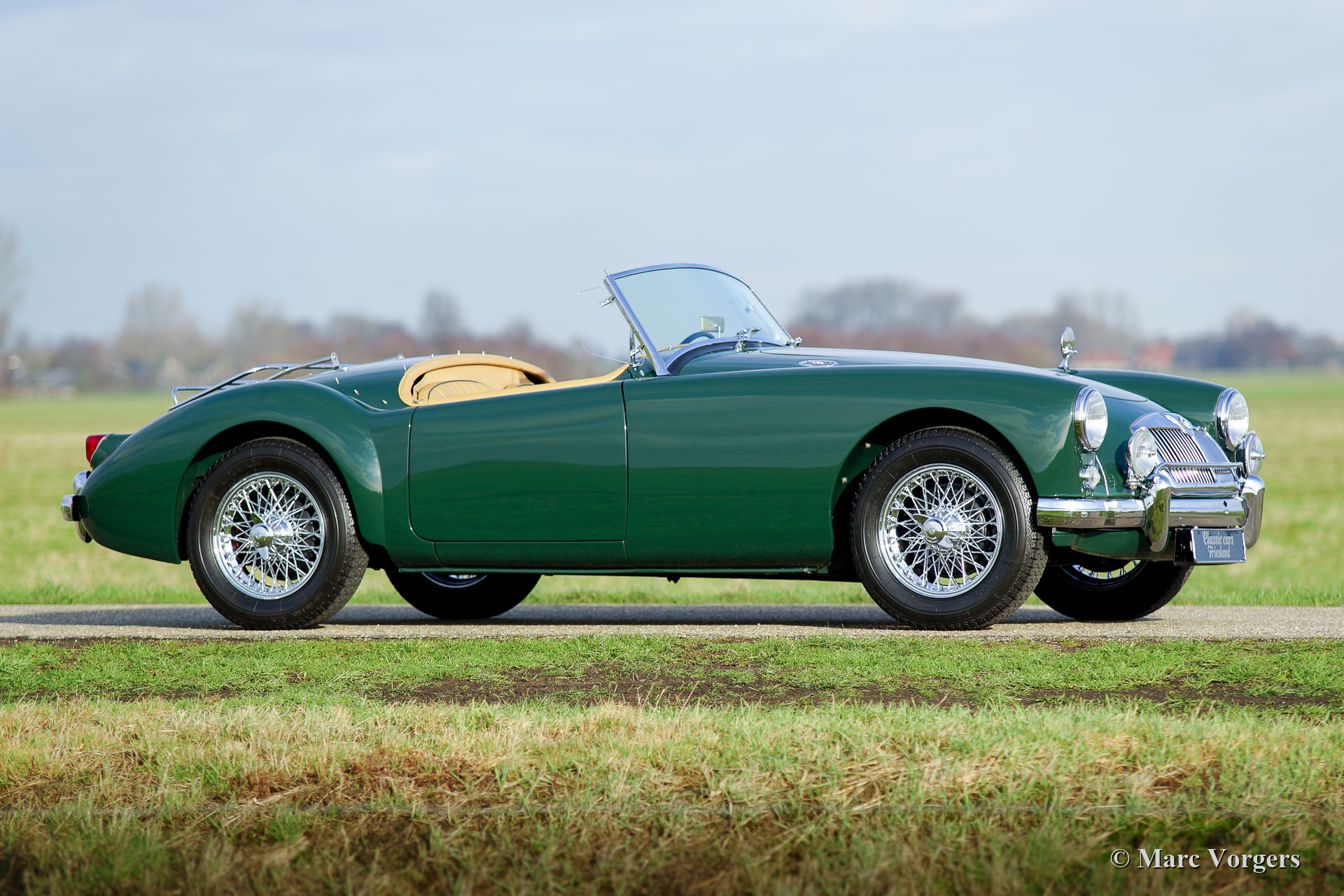 MG MGA 1500 roadster, jaar 1957. Kleur British Racing Green gecombineerd met een beige leren interieur afgewerkt met donkergroene biezen en beige wollen tapijt. Zwarte mohair soft-top en tonneau-cover, zijruiten met aluminium frames. Deze prachtige MGA 1500 roadster werd uitgebreid en body-off gerestaureerd door een Nederlandse MG-liefhebber. De motor, versnellingsbak, remmen en koeling zijn gereviseerd en de kabelboom is vernieuwd. Een uitgebreid restauratieverslag is aanwezig. Deze prachtige MGA 1500 roadster verkeert in sublieme conditie en de auto rijdt voortreffelijk! De auto is uitgerust met verchroomde spaakwielen, een verchroomd bagagerek en een roestvrijstalen uitlaat. Een prachtig exemplaar!