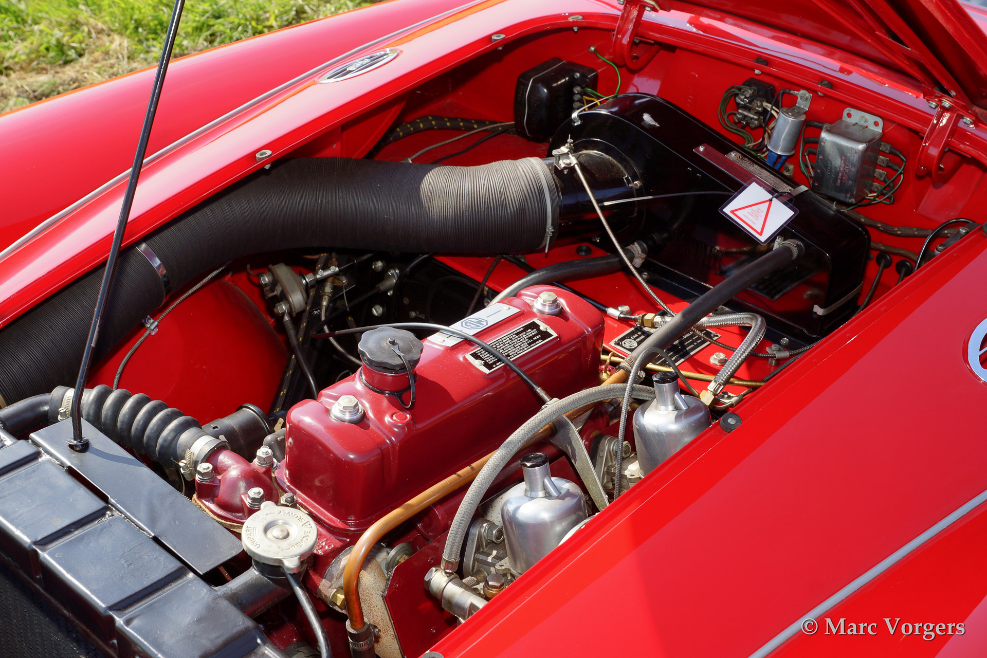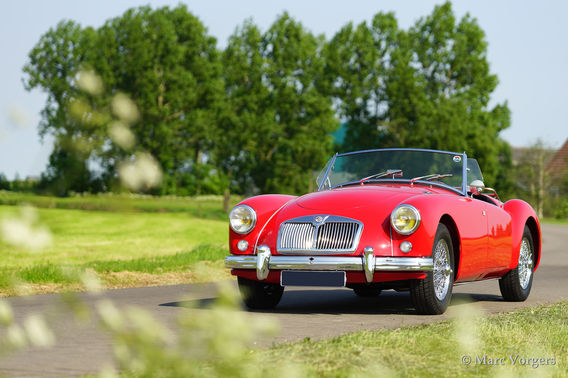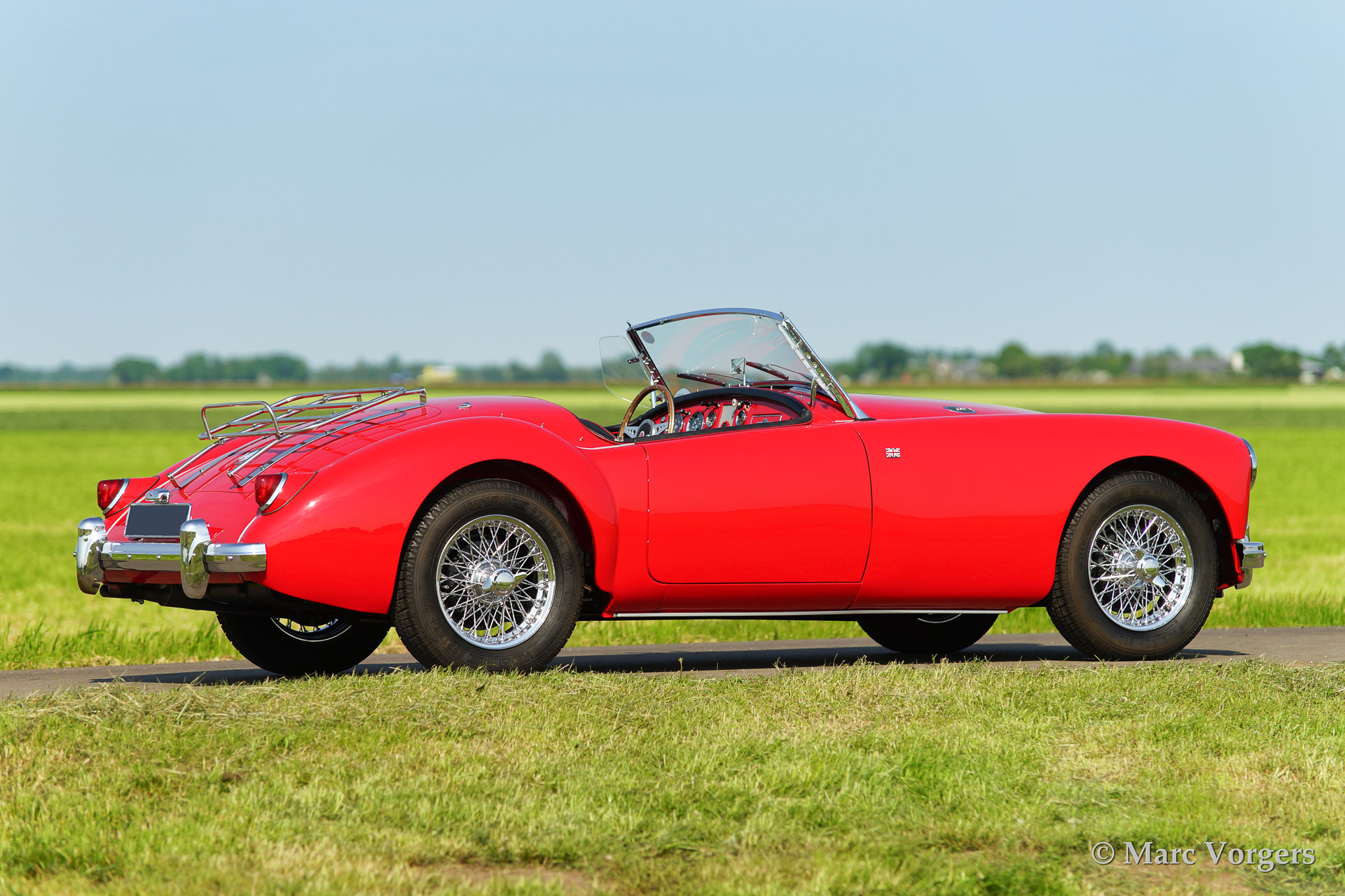 MG MGA 1500 roadster, bouwjaar 1958. Kleur rood met een zwart lederen interieur afgebiest met rode 'piping'. Zwarte mohair soft top. Deze prachtige MG MGA werd uitvoerig 'body off' gerestaureerd waarbij het chassis werd gepoedercoat. De auto is uitgerust met chroom spaakwielen, een Motolita sportstuur met houten rand en aluminium 'side screens'.