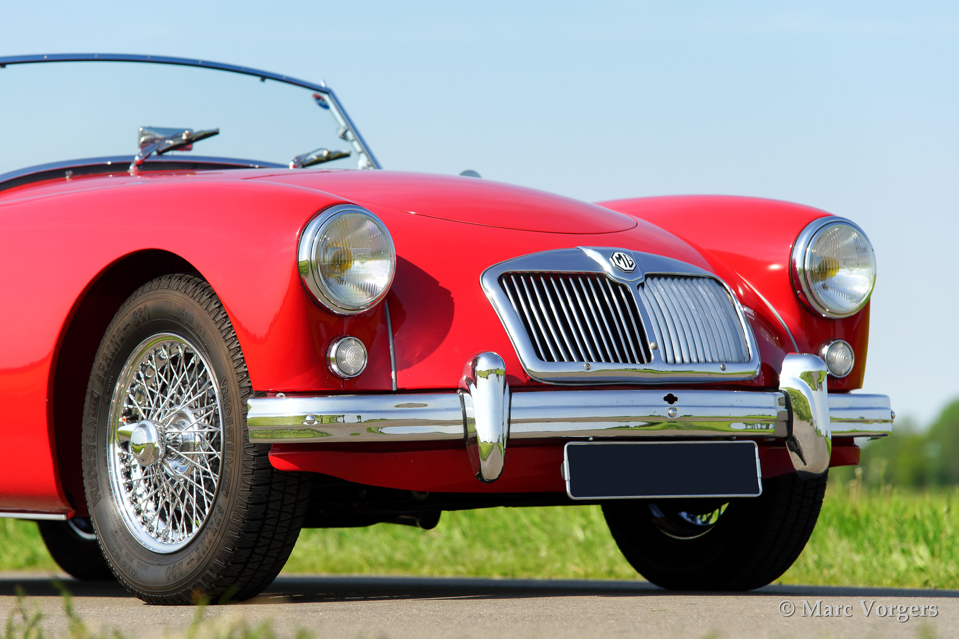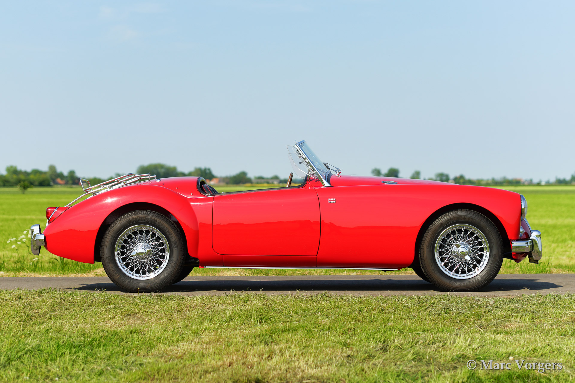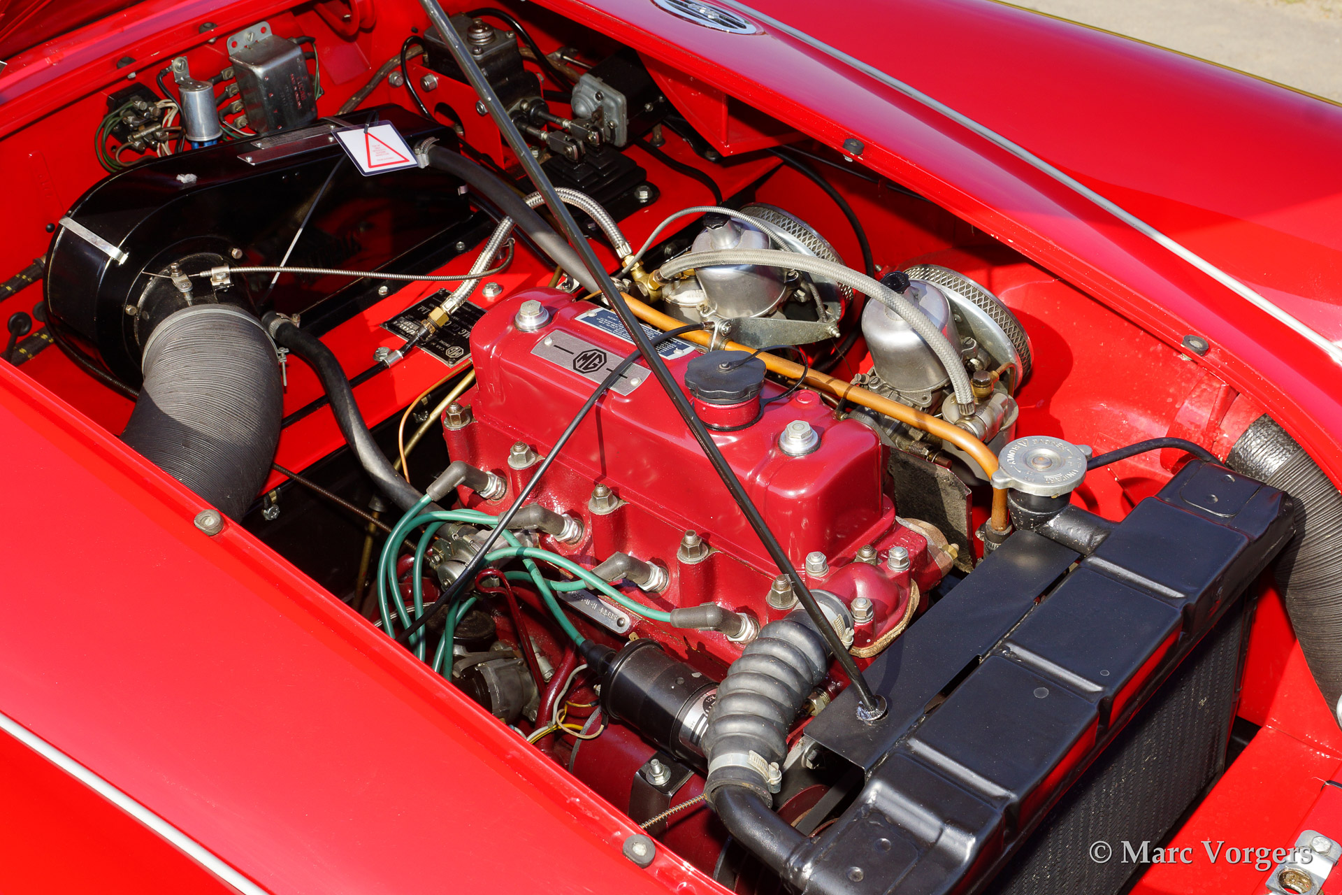 MG MGA 1500 roadster, bouwjaar 1958. Kleur rood met een zwart lederen interieur afgebiest met rode 'piping'. Zwarte mohair soft top. Deze prachtige MG MGA werd uitvoerig 'body off' gerestaureerd waarbij het chassis werd gepoedercoat. De auto is uitgerust met chroom spaakwielen, een Motolita sportstuur met houten rand en aluminium 'side screens'.