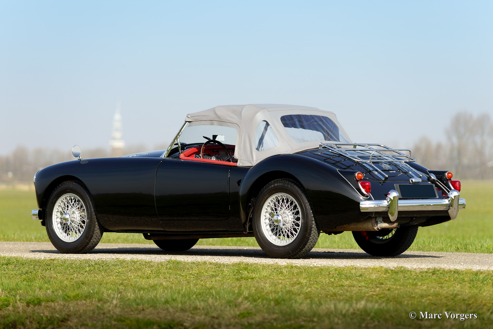 MG MGA 1600 roadster, bouwjaar 1960. Kleur zwart met een rood lederen interieur en zwart tapijt. Grijze vinyl soft top. Deze prachtige MG MGA 1600 roadster werd uitvoerig gerestaureerd, de auto verkeert in sublieme topstaat! Een Heritage certificaat met de fabrieksspecificaties is aanwezig. De auto is uitgerust met gelakte spaakwielen, een chroom kofferrek en Michelin banden.