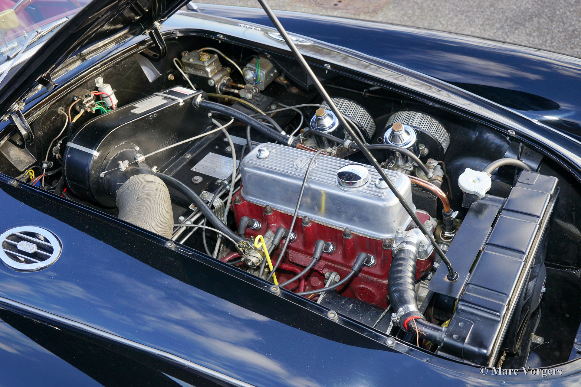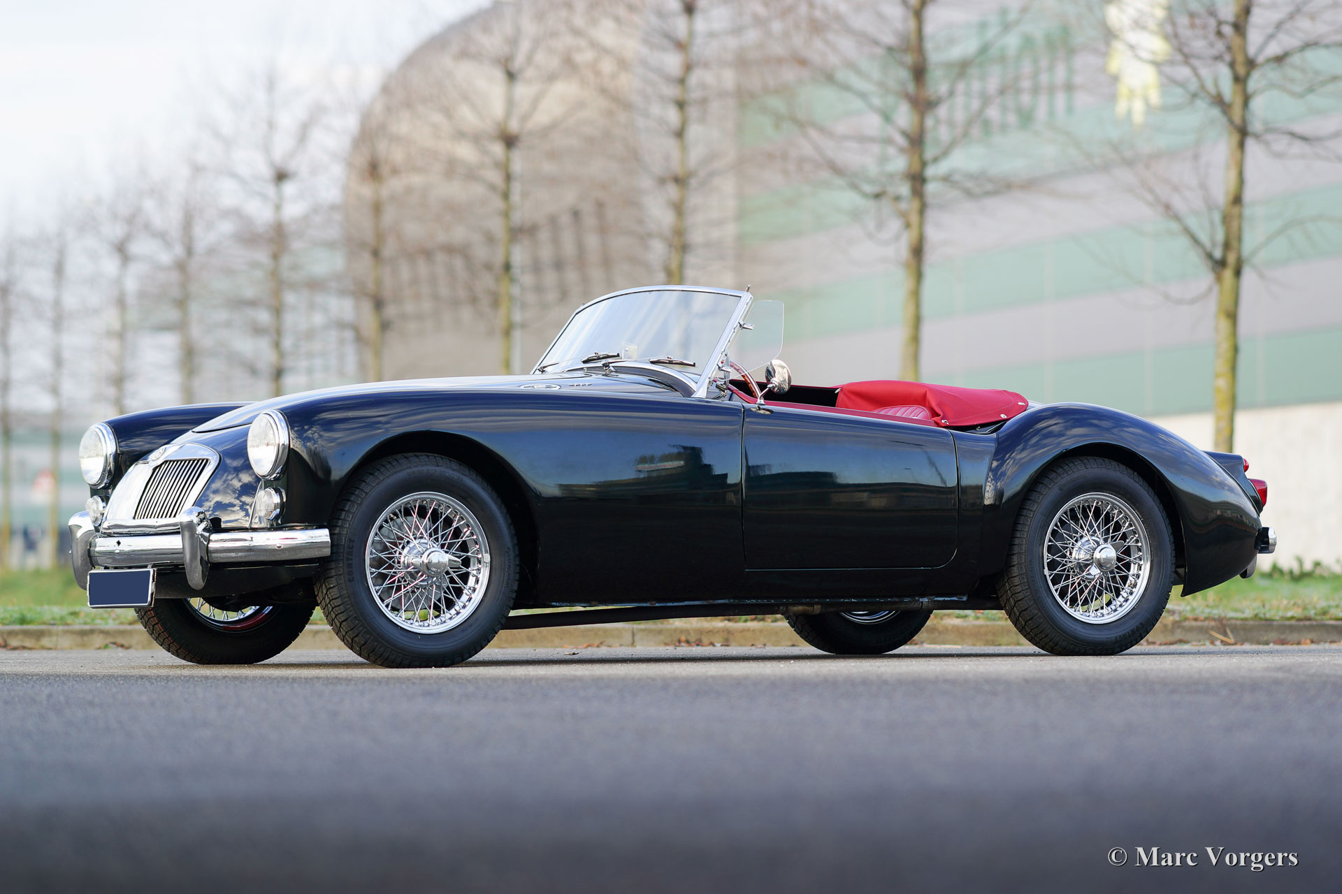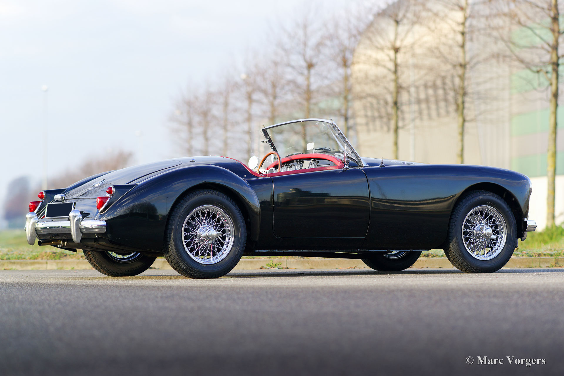 MG MGA 1600 roadster, bouwjaar 1960. Kleur zwart met roodlederen bekleding en zwarte vloerbedekking. Zwarte soft-top en een rode mohair tonneau cover. Deze prachtige MGA 1600 verkeert in excellente staat en de auto rijdt uitstekend. De MGA is zeer goed onderhouden en de onderhoudshistorie is bekend en gedocumenteerd. De auto is voorzien van een MotoLita stuur met houten rand, wind ‘deflectors’ aan het voorruitframe, Kenlow elektrische koelventilator en een RVS uitlaat. Recent zijn er nieuwe chroom spaakwielen gemonteerd en nieuwe banden. De bumpers en de soft-top zijn ook vernieuwd.