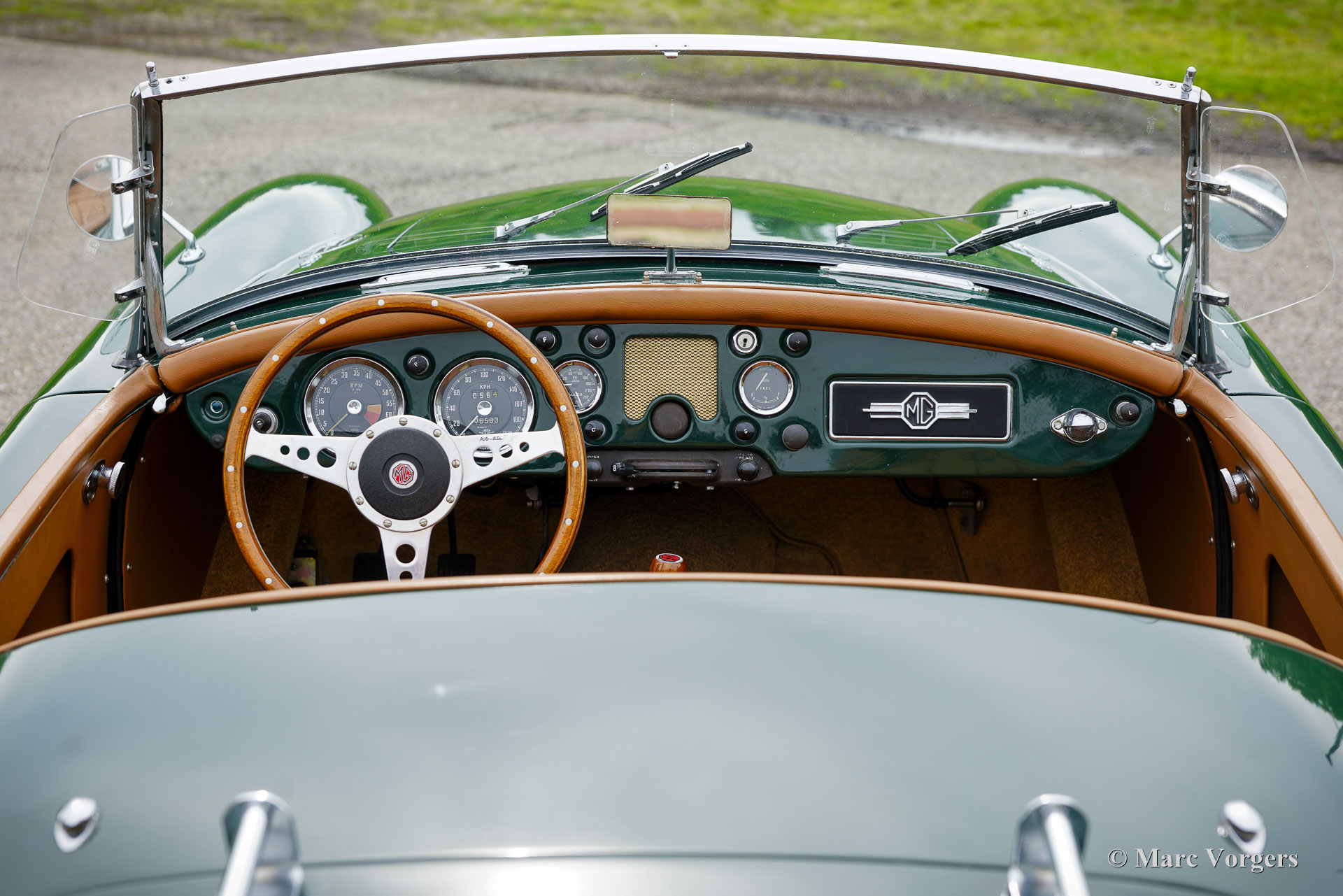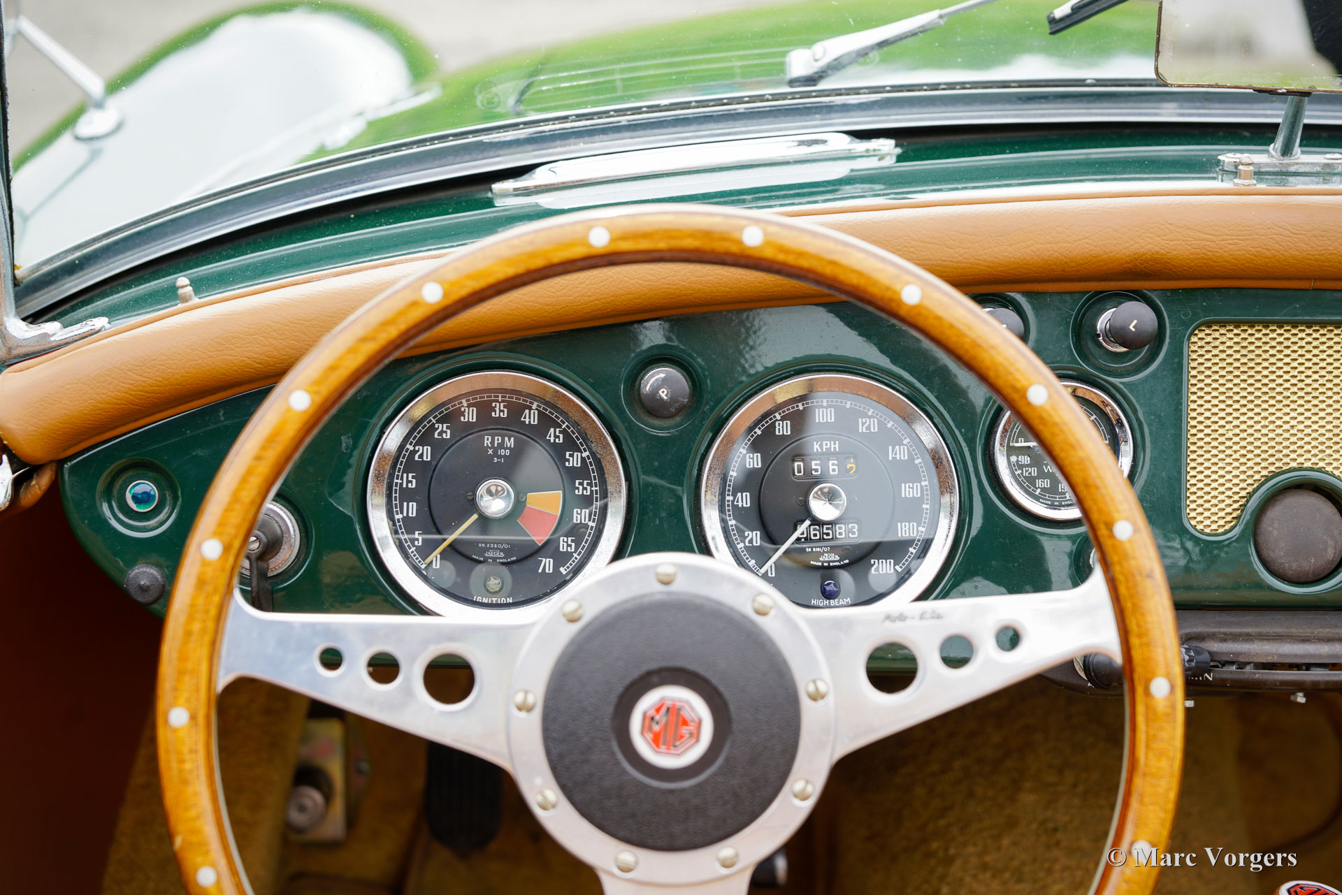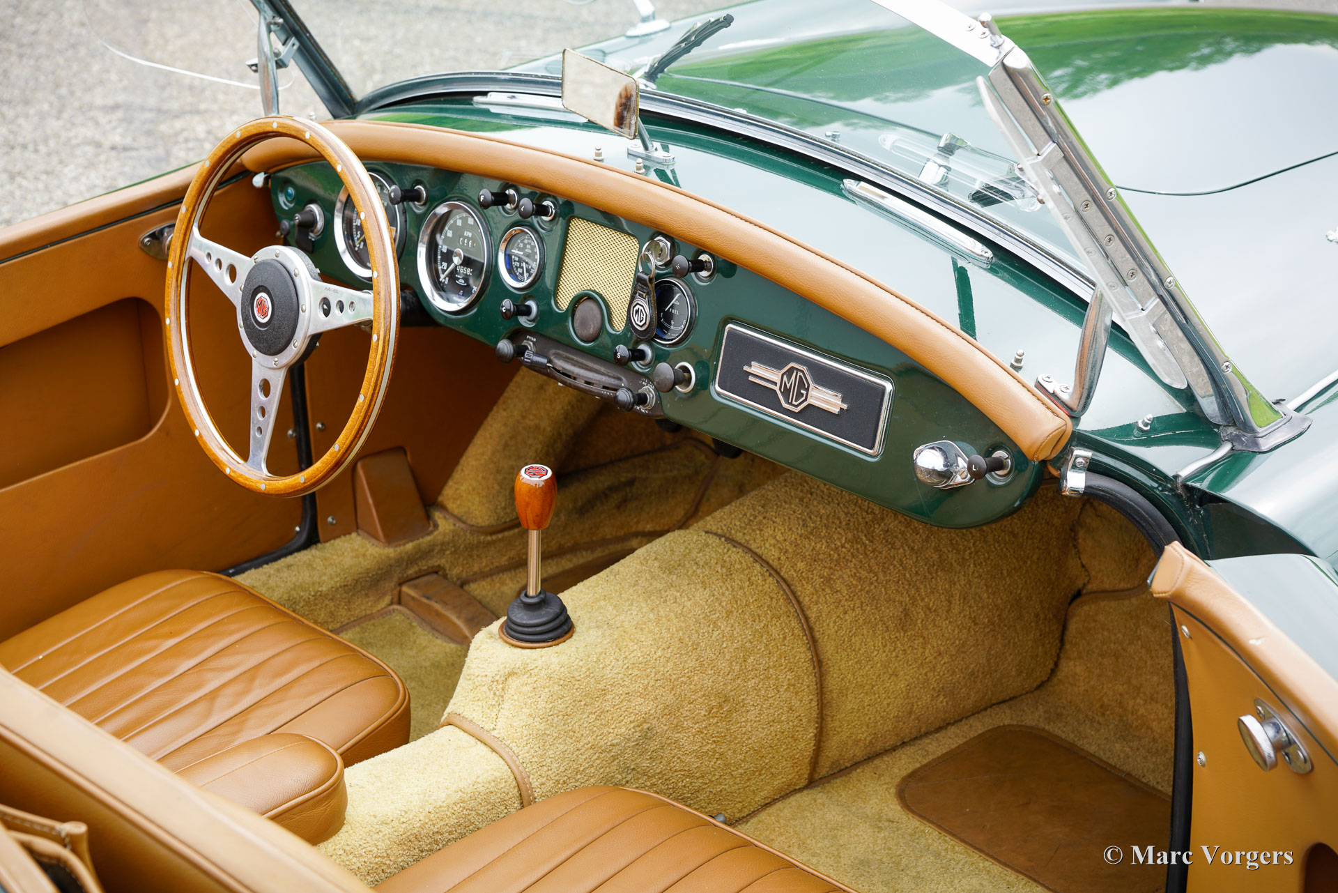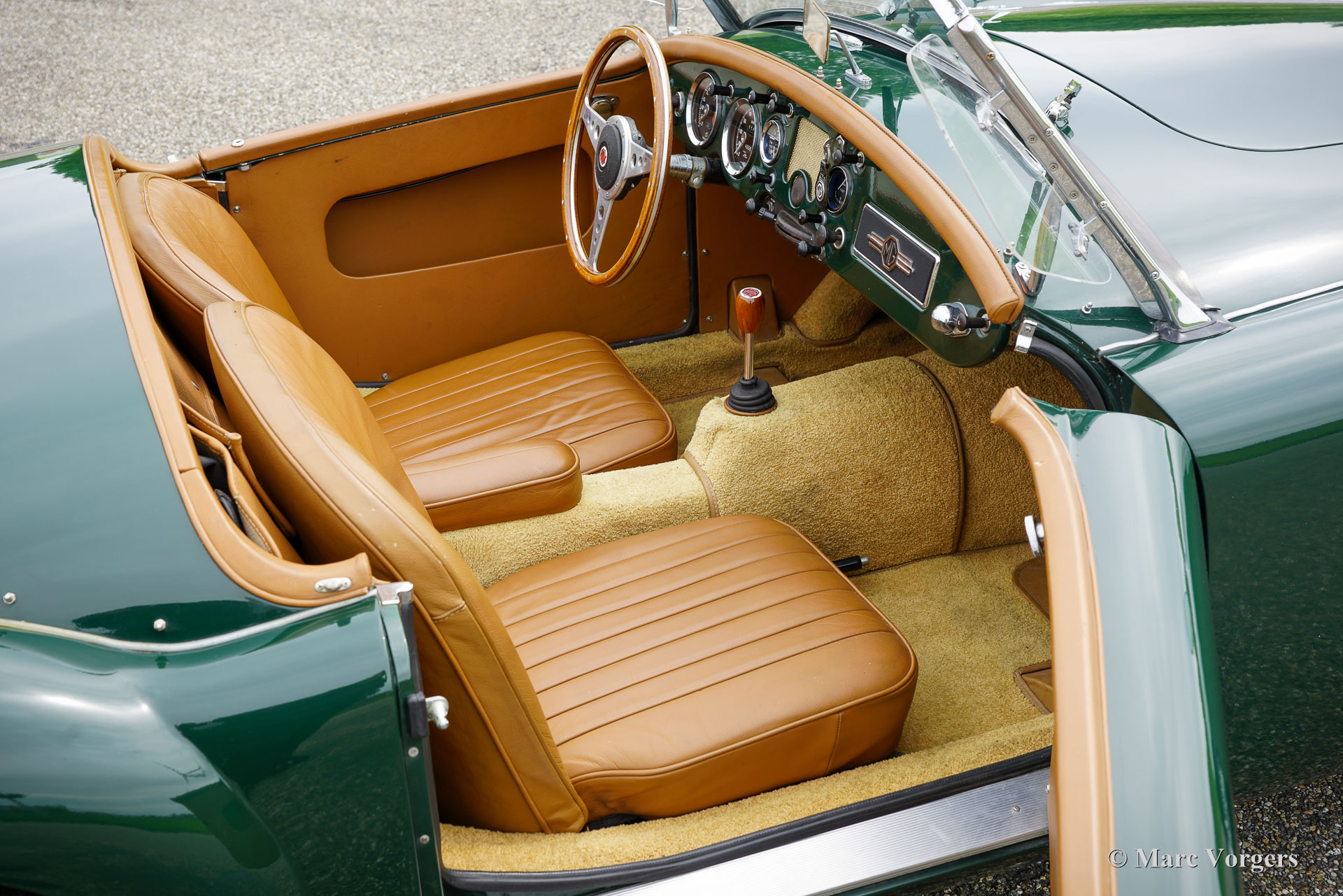 MG MGA 1600 roadster, jaar 1960. Kleur donkergroen (British Racing Green) gecombineerd met een lichtbruin interieur met leren stoelen en beige tapijt. De auto is voorzien van een zwart canvas soft-top. De MGA is een van de mooiste open “roadsters” uit de jaren vijftig en zestig van de vorige eeuw. De elegante, Italiaans ogende vormgeving is geïnspireerd op de lijnen van de MG TD Le Mans-auto ontworpen door Sid Evener. Deze prachtige MGA 1600 verkeert in een zeer goede staat. De auto is voorzien van verchroomde spaakwielen, een sportstuur met houten rand, “wind wings” op het voorruitframe, opbergruimte achter de stoelen voor de insteek-zijruiten en een verchroomd kofferrek. Verder is deze MGA voorzien van een kilometertellerstand in km/u en schijfremmen op de voorwielen. Dit is een geweldige open Britse sportwagen waar u samen met partner of vriend(in) met volle teugen kunt genieten op prachtige landschapswegen in Europa. Creëer uw eigen ‘roadmovie’ met deze MG!
