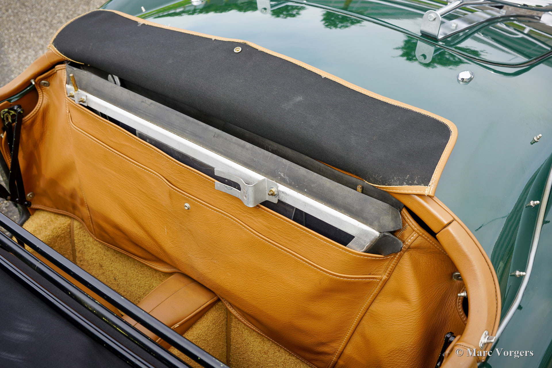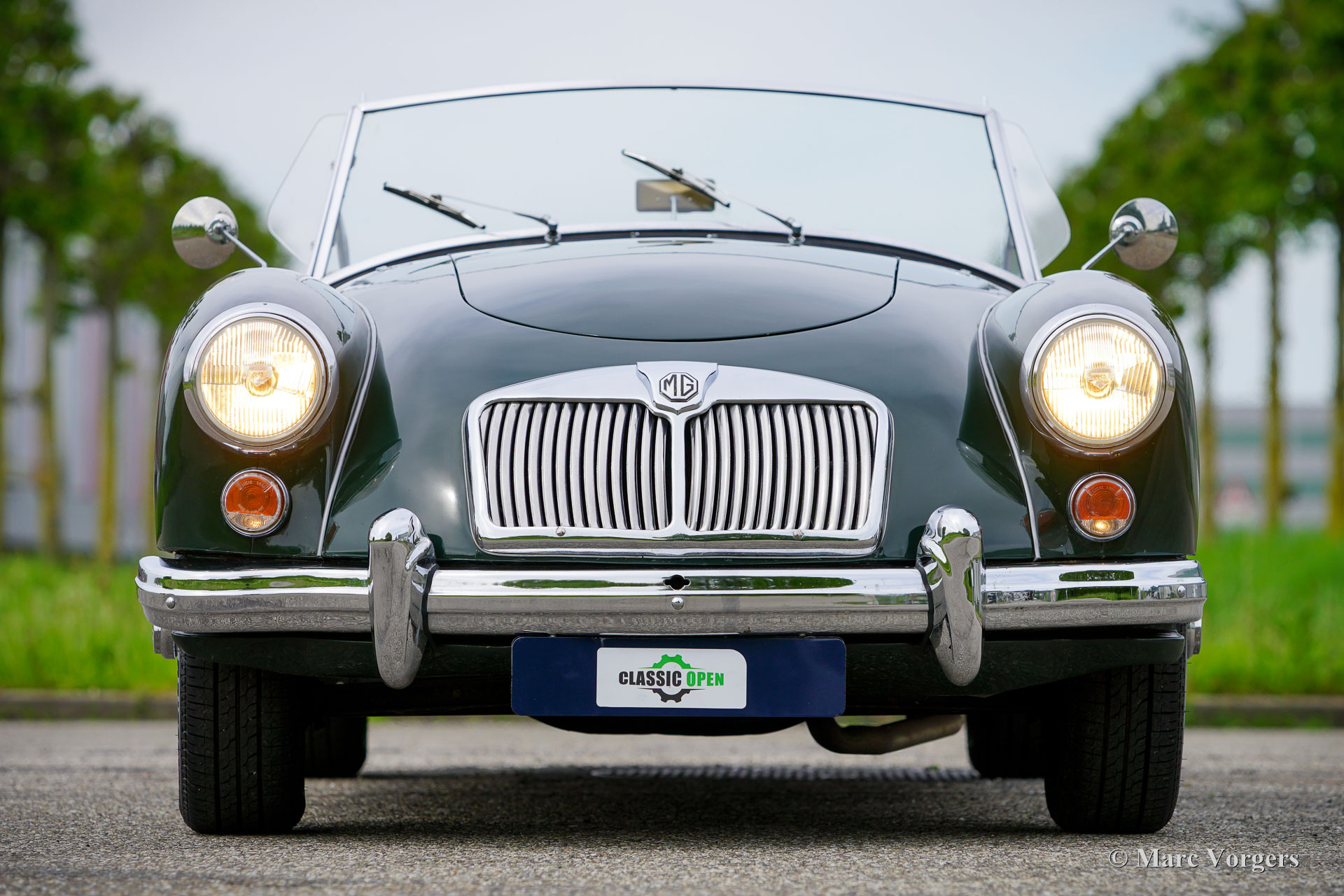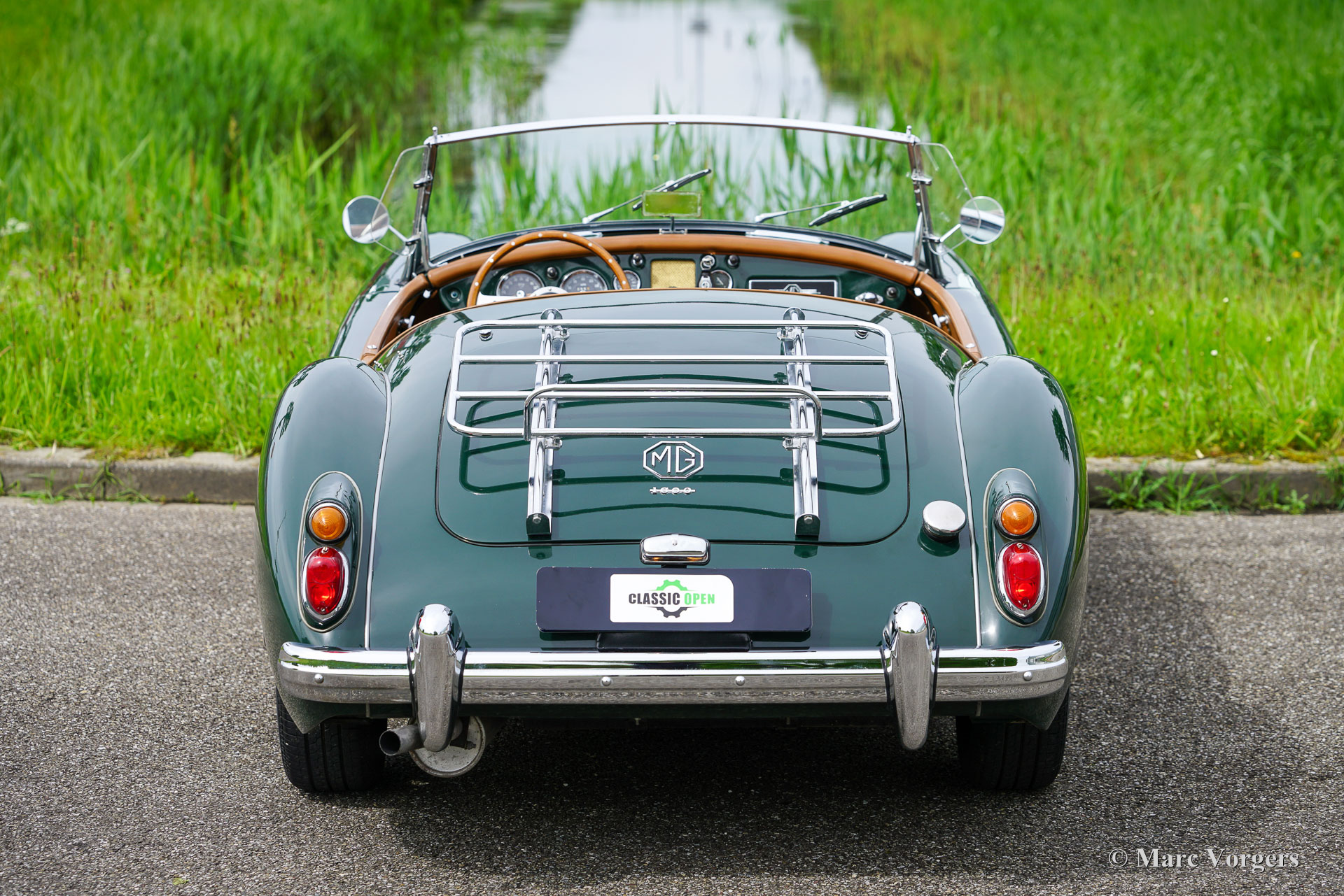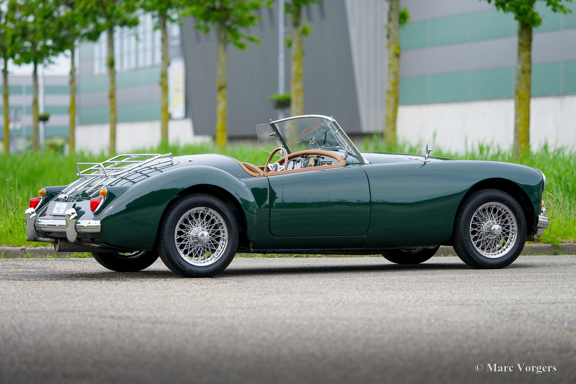 MG MGA 1600 roadster, jaar 1960. Kleur donkergroen (British Racing Green) gecombineerd met een lichtbruin interieur met leren stoelen en beige tapijt. De auto is voorzien van een zwart canvas soft-top. De MGA is een van de mooiste open “roadsters” uit de jaren vijftig en zestig van de vorige eeuw. De elegante, Italiaans ogende vormgeving is geïnspireerd op de lijnen van de MG TD Le Mans-auto ontworpen door Sid Evener. Deze prachtige MGA 1600 verkeert in een zeer goede staat. De auto is voorzien van verchroomde spaakwielen, een sportstuur met houten rand, “wind wings” op het voorruitframe, opbergruimte achter de stoelen voor de insteek-zijruiten en een verchroomd kofferrek. Verder is deze MGA voorzien van een kilometertellerstand in km/u en schijfremmen op de voorwielen. Dit is een geweldige open Britse sportwagen waar u samen met partner of vriend(in) met volle teugen kunt genieten op prachtige landschapswegen in Europa. Creëer uw eigen ‘roadmovie’ met deze MG!