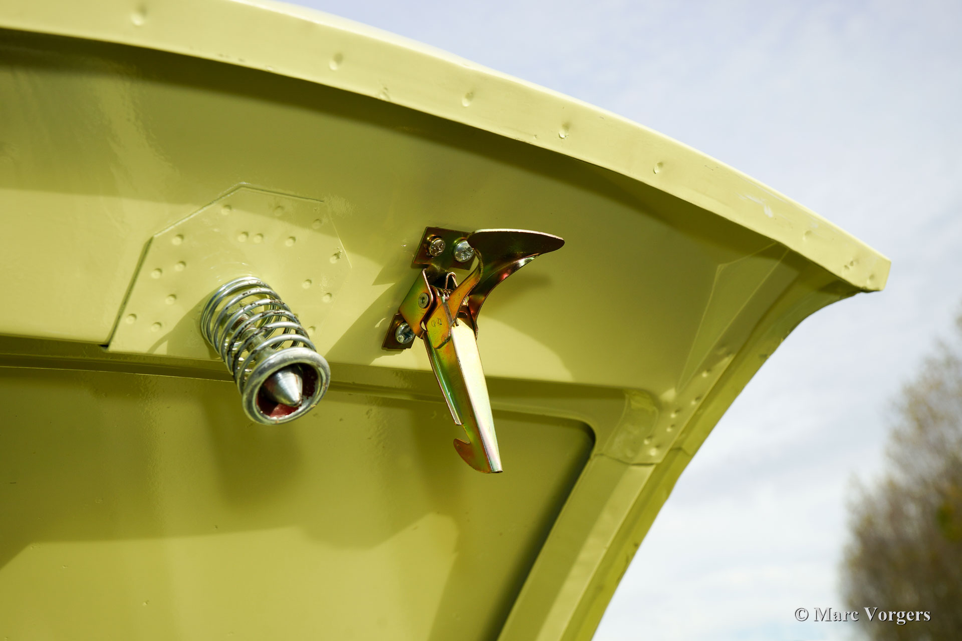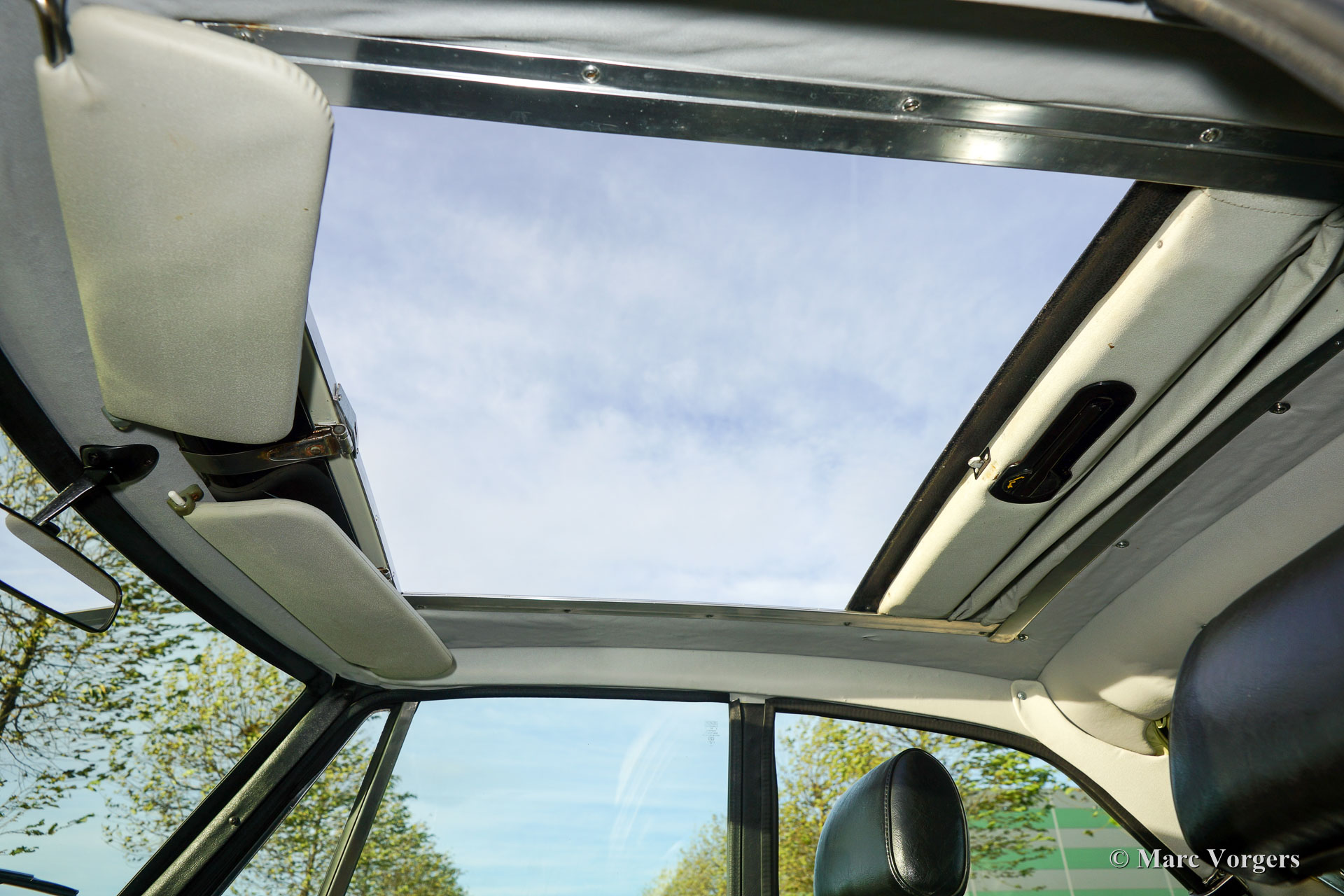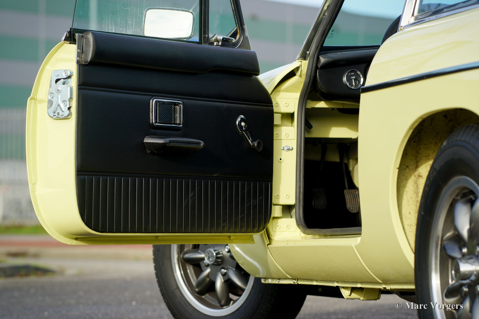 MG MGB GT V8, jaar 1973. Kleur pastelgeel (Primrose Yellow) met een zwartleren interieur en zwart tapijt. Deze prachtige en krachtige MGB GT V8 is vijf jaar geleden uitvoerig gerestaureerd en daarbij omgebouwd van rechtse besturing naar Europese linkse besturing. De restauratie vond plaats naar originele fabriek specificaties. Deze originele MGB GT V8 is uitgerust met groen getinte ruiten, overdrive, rembekrachtiger en een oliekoeler. Extra opties: leren bekleding, aluminium motorkap met louvres, zwart vinyl vouwdak, antraciet gespoten MiniLite wielen, een met leer bekleed Moto-Lita sportstuur, twee chroom buitenspiegels en een afsluitbare tankdop. De MG MGB GT V8 is een zeer begeerlijke Engelse klassieker, een soort lichtvoetige en compacte Aston Martin! De combinatie van een compacte GT met een 150 pk krachtige Rover V8 van 3.5 liter is een garantie voor ultiem klassiek rijplezier. Het vouwdak geeft een prima ‘open top’ beleving en het motorgeluid is werkelijk verslavend!