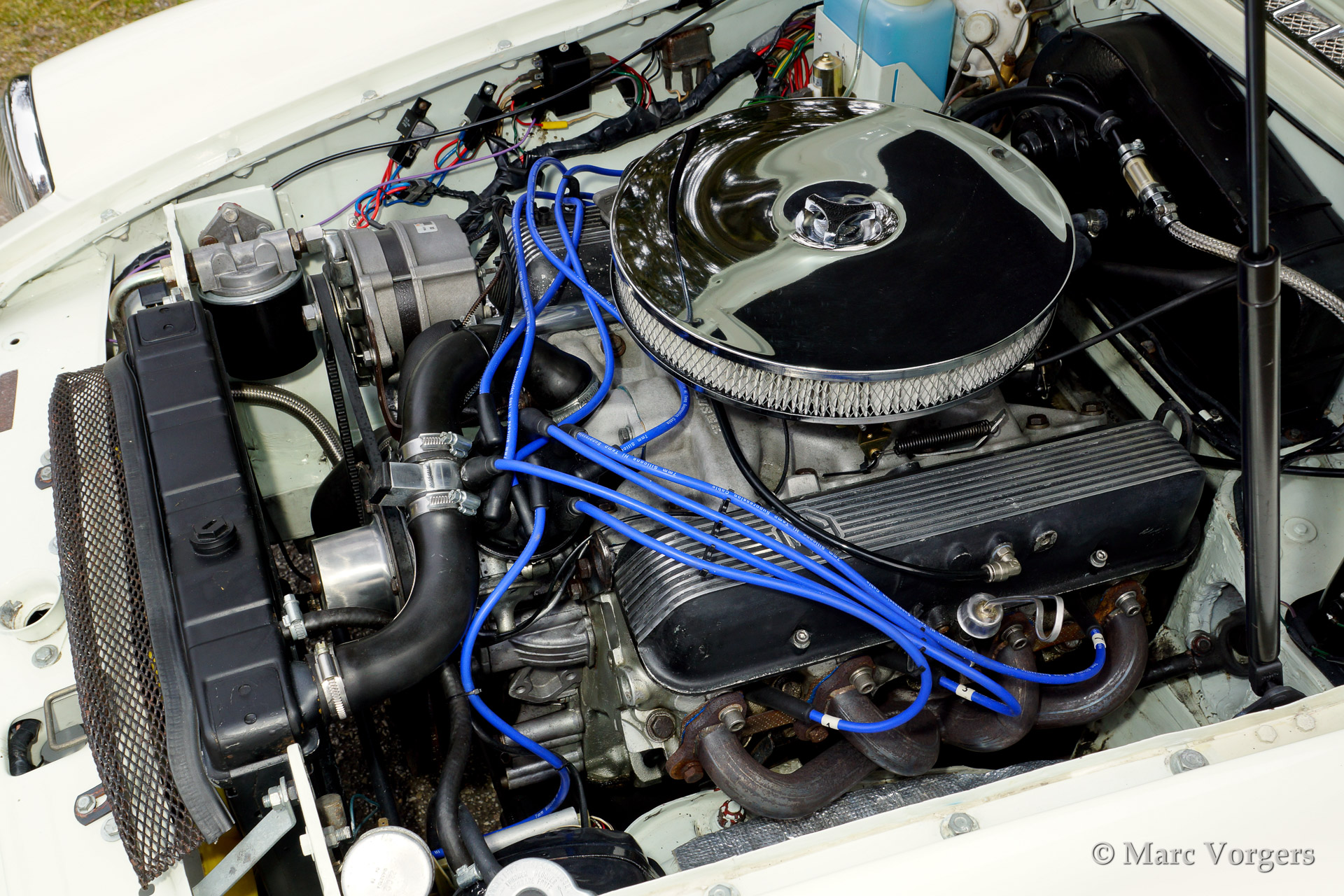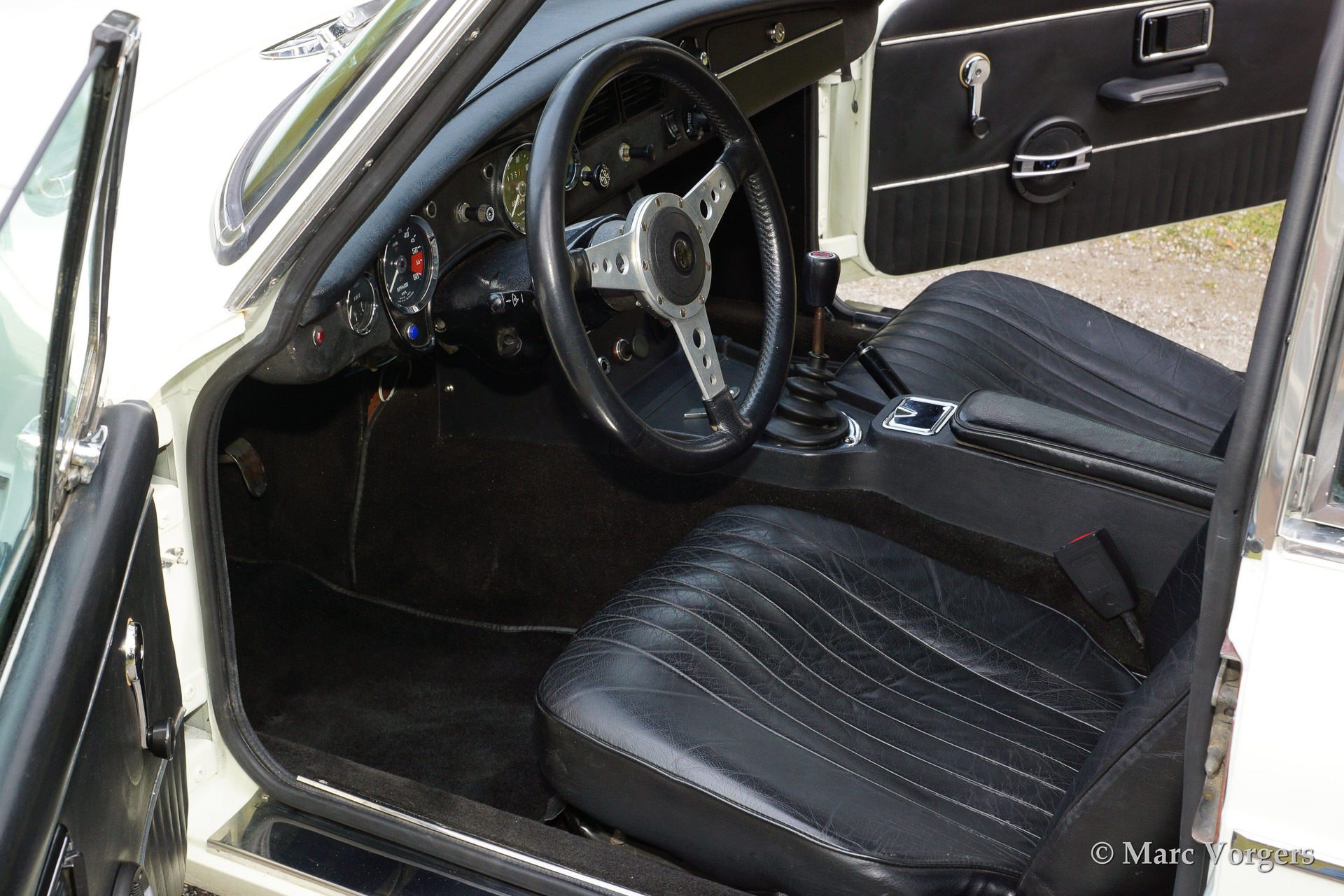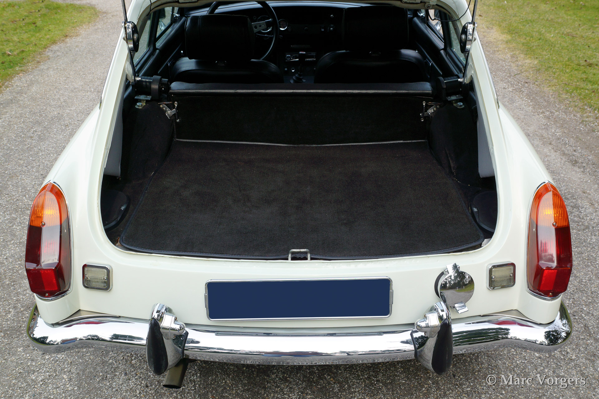 MG MGB GT V8, bouwjaar 1975. Kleur 'Old English White' met een zwart lederen interieur. De auto is voorzien van een Webasto schuif/vouwdak, 'Minilite' stijl lichtmetalen wielen en een MotoLita sportstuur met lederen rand. De motor is voorzien van een Offenhauser 360 inlaatspruitstuk, een 'four-barrel' Edelbrock carburateur, een sport luchtfilter en een 'free flow' uitlaatsysteem. Vermogen op de rollenbank: 170 DIN pk. aan de krukas.