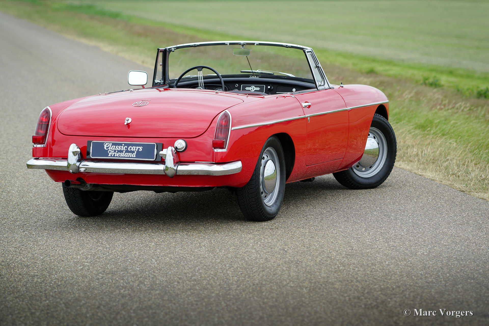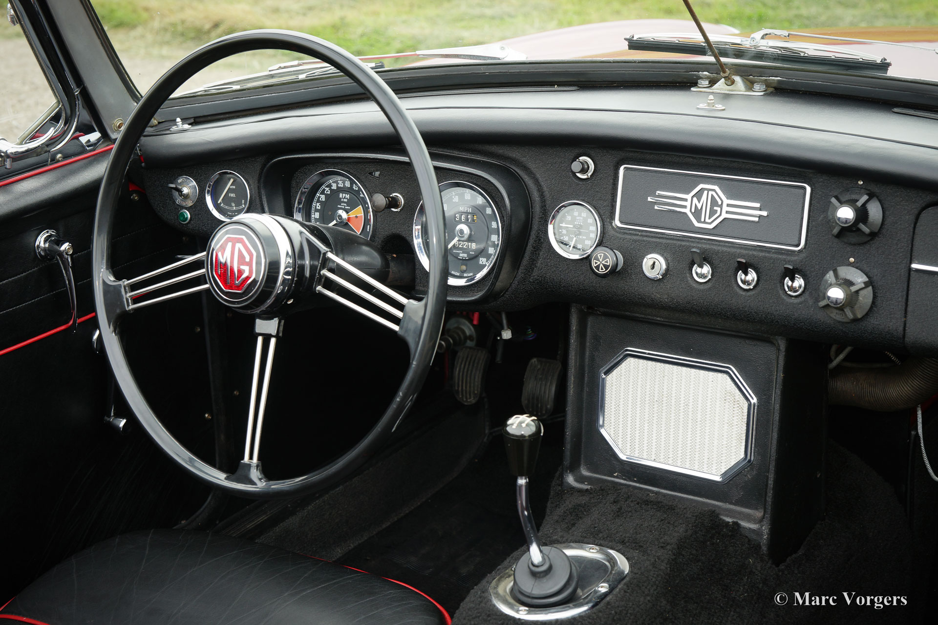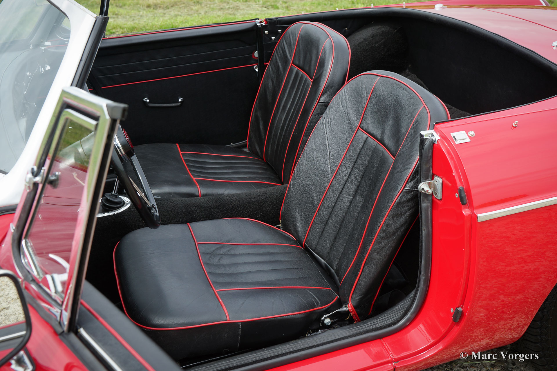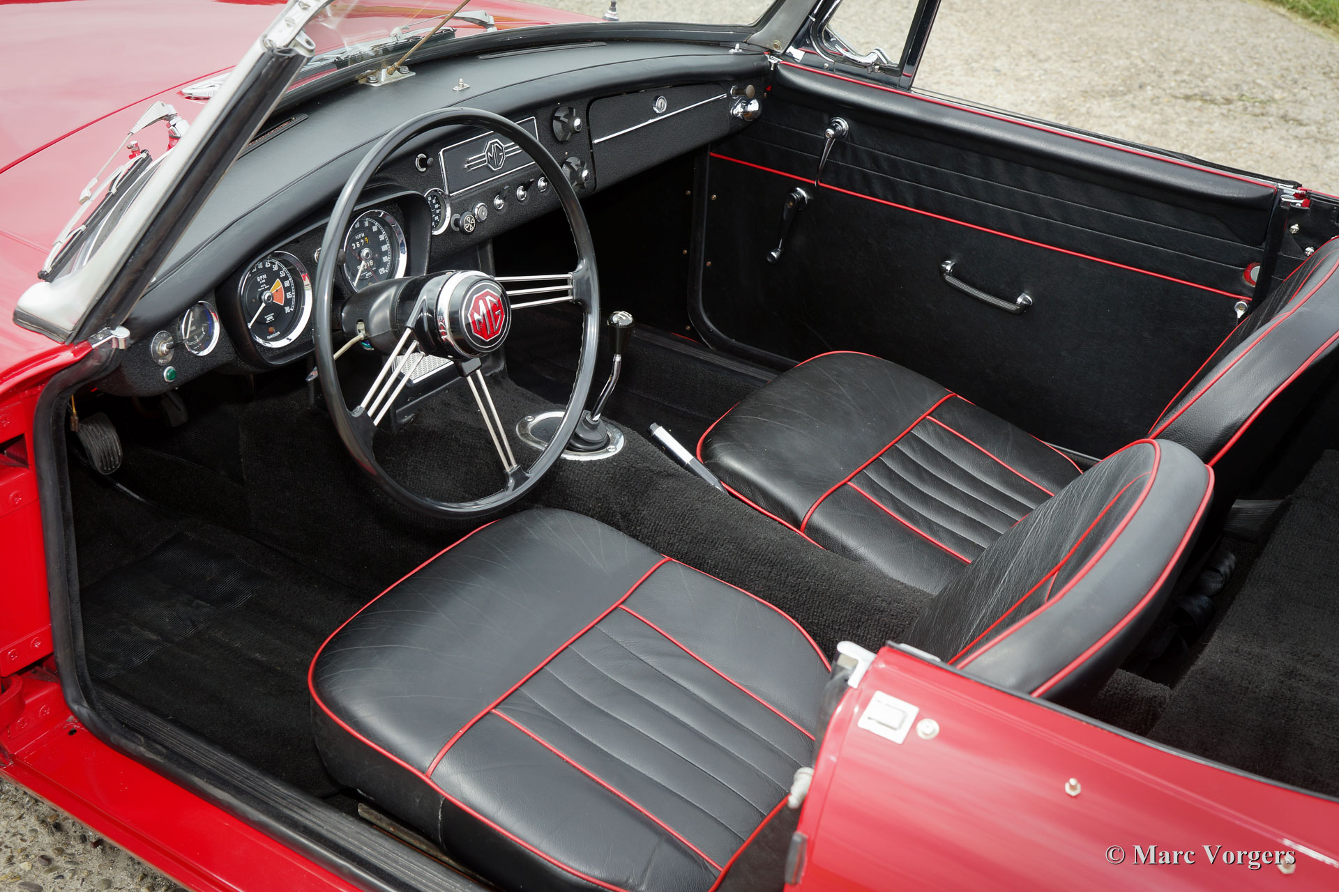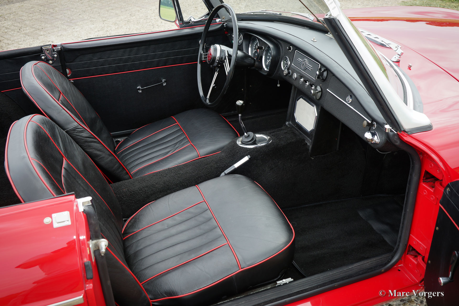 MG MGB roadster, jaar 1964. Het betreft een vroeg en zeldzaam ‘lepeldeur’ exemplaar met de bijzondere trekdeurgrepen! Kleur rood met een zwartleren interieur afgewerkt met rode biezen. Zwart tapijt, zwarte soft-top en hood-cover. Deze bijzonder fraaie MGB roadster is in het verleden uitvoerig en ‘body-off’ gerestaureerd, een uitgebreide fotoreportage van de restauratie is aanwezig. Deze MGB roadster verkeert in sublieme topstaat; concours. De auto toont alle originele details waaronder de stalen ‘disc-wheels’ met chroom wieldoppen, het fraaie originele stuur, de originele pookknop, de originele luchtfilters en het originele boordgereedschap. Indien gewenst kan de auto worden omgebouwd naar spaakwielen. Deze MGB roadster toont mooie carrosseriepassingen. De auto is voorzien van een vierversnellingsbak met overdrive en massaschakelaar. Dit is een perfect rijdende, super originele en zeldzame ‘lepeldeur’ MGB in topstaat!