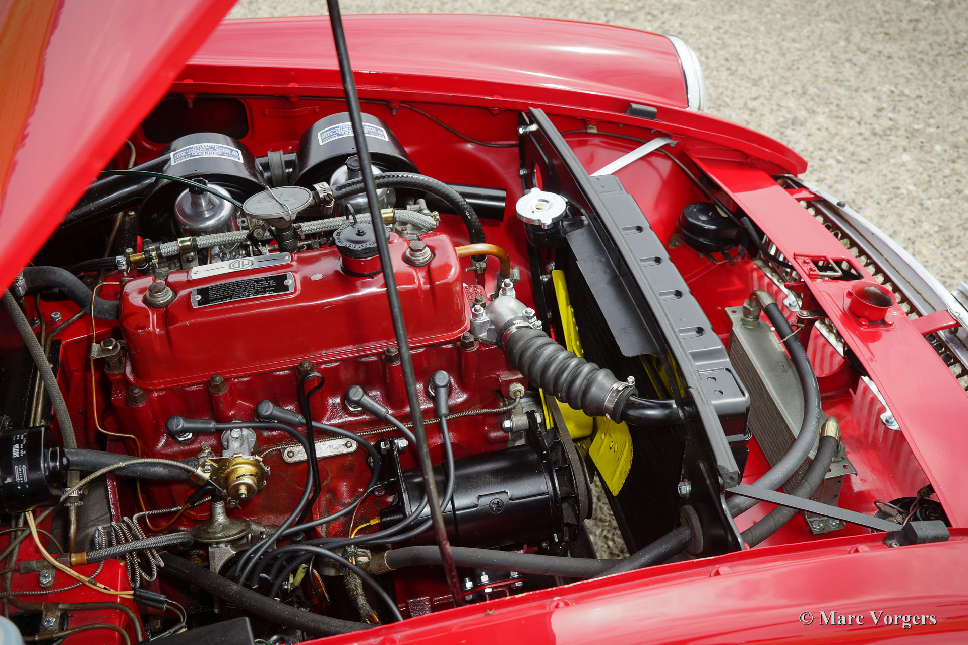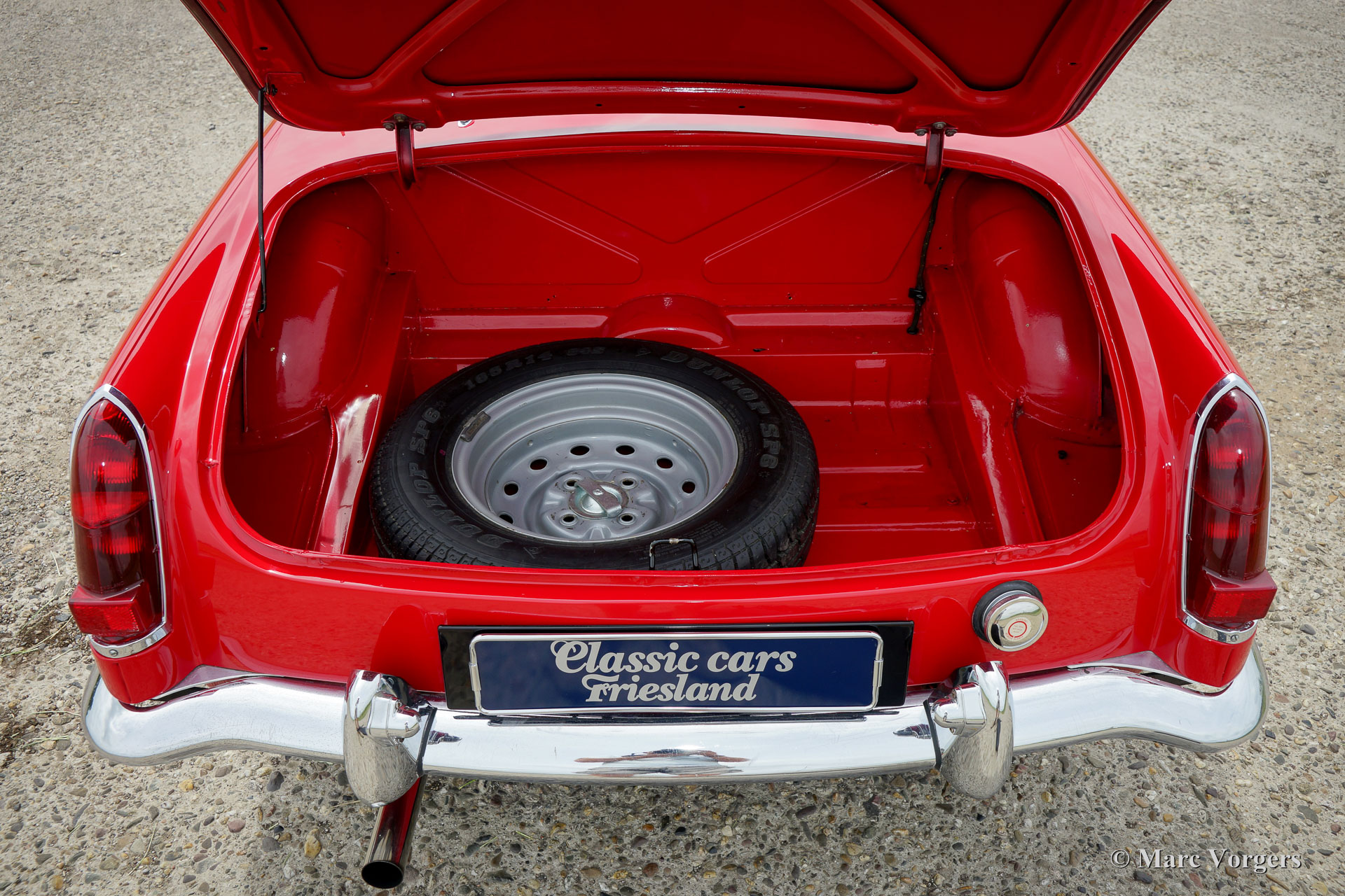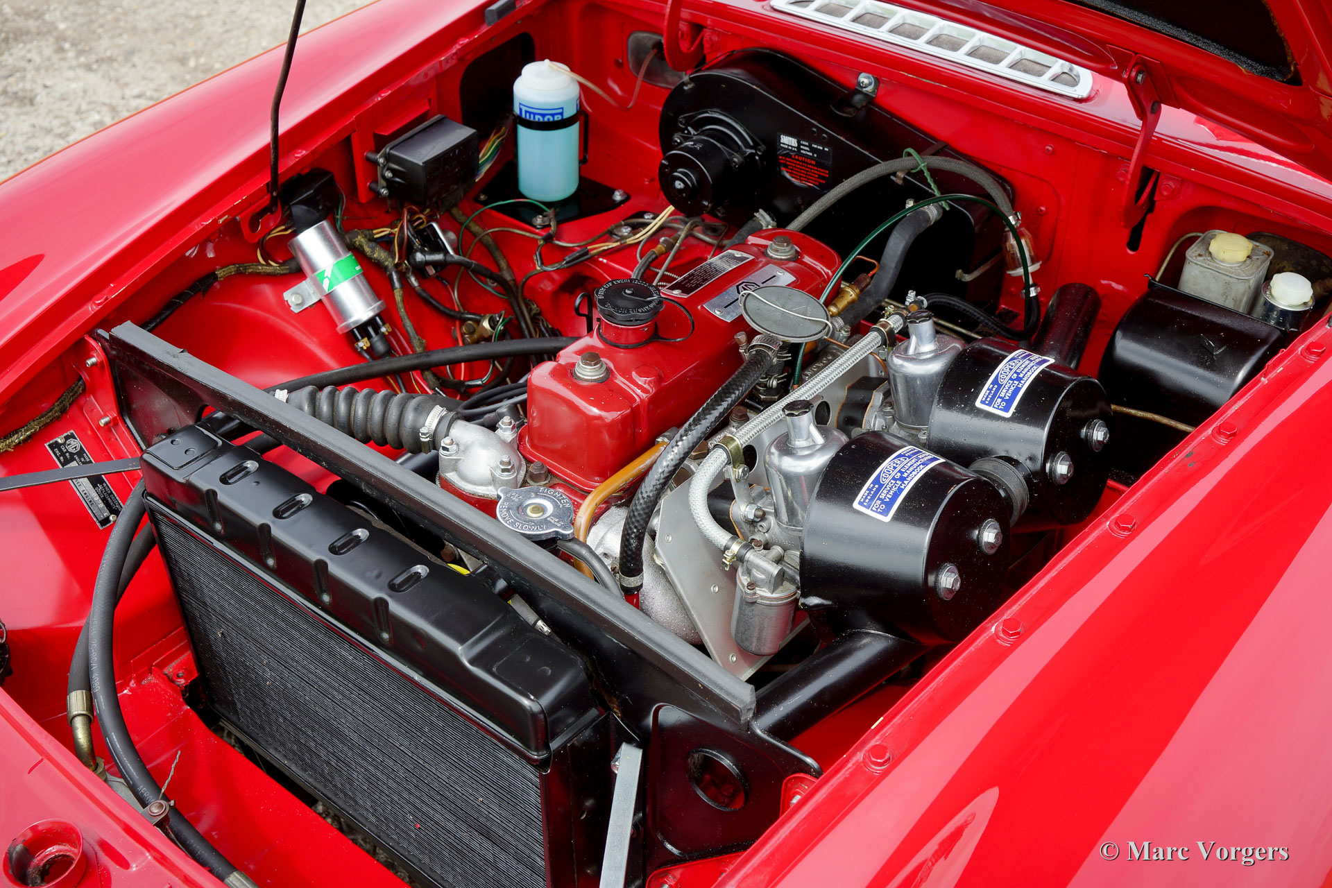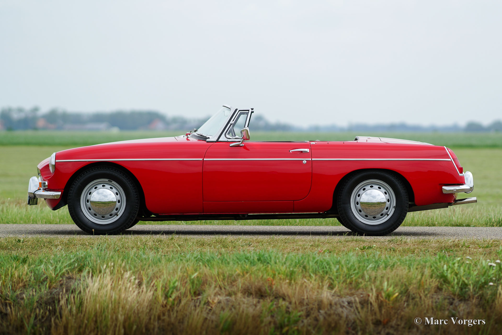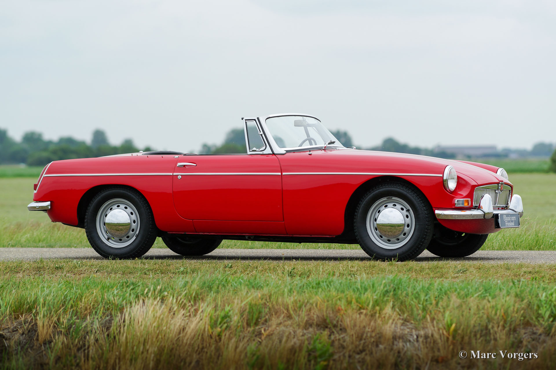 MG MGB roadster, jaar 1964. Het betreft een vroeg en zeldzaam ‘lepeldeur’ exemplaar met de bijzondere trekdeurgrepen! Kleur rood met een zwartleren interieur afgewerkt met rode biezen. Zwart tapijt, zwarte soft-top en hood-cover. Deze bijzonder fraaie MGB roadster is in het verleden uitvoerig en ‘body-off’ gerestaureerd, een uitgebreide fotoreportage van de restauratie is aanwezig. Deze MGB roadster verkeert in sublieme topstaat; concours. De auto toont alle originele details waaronder de stalen ‘disc-wheels’ met chroom wieldoppen, het fraaie originele stuur, de originele pookknop, de originele luchtfilters en het originele boordgereedschap. Indien gewenst kan de auto worden omgebouwd naar spaakwielen. Deze MGB roadster toont mooie carrosseriepassingen. De auto is voorzien van een vierversnellingsbak met overdrive en massaschakelaar. Dit is een perfect rijdende, super originele en zeldzame ‘lepeldeur’ MGB in topstaat!