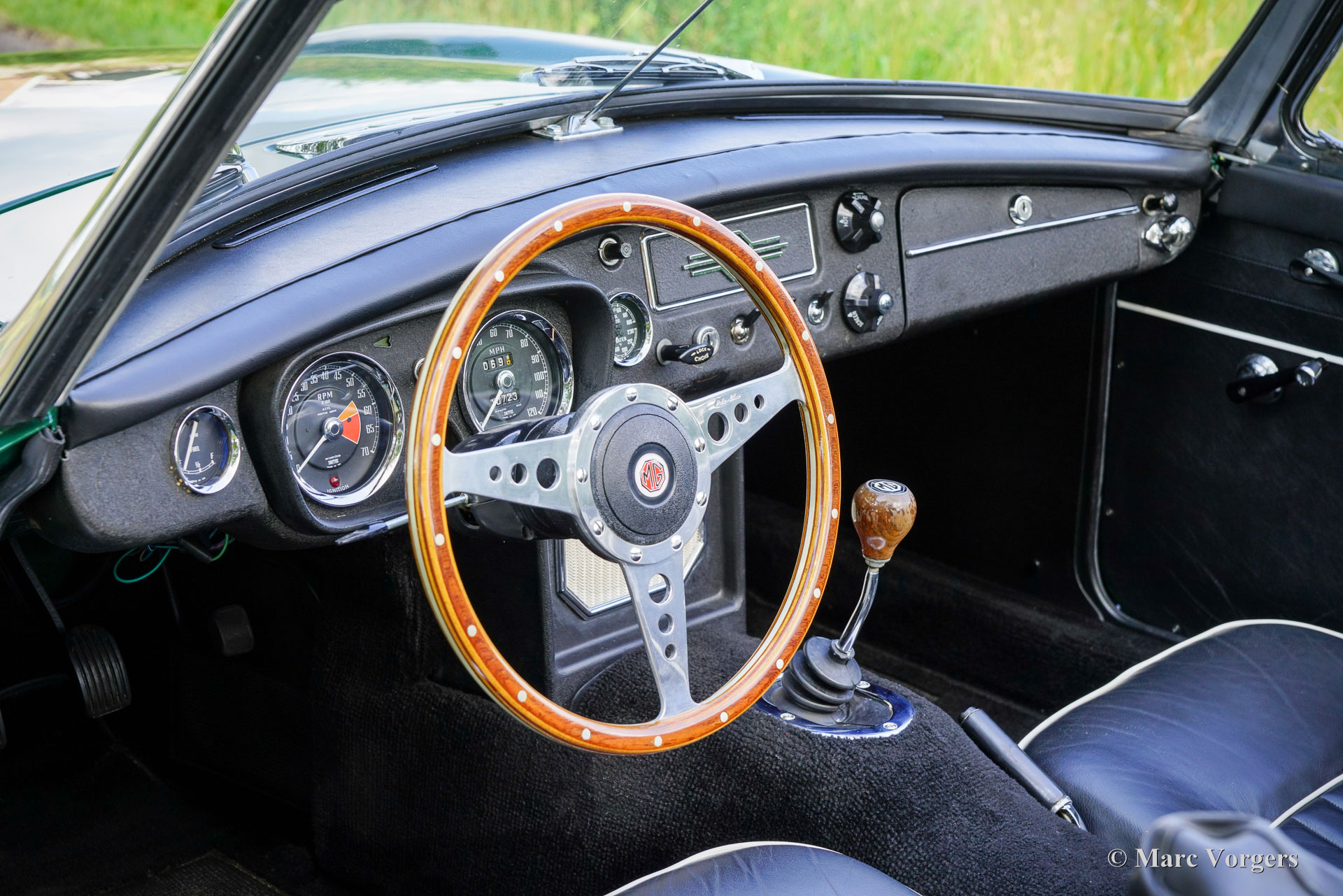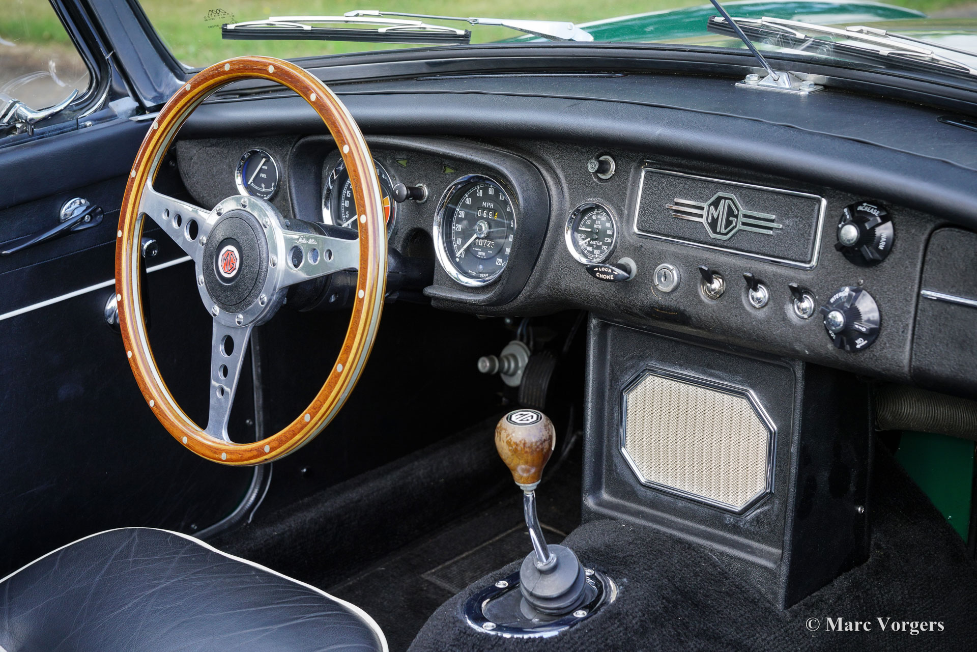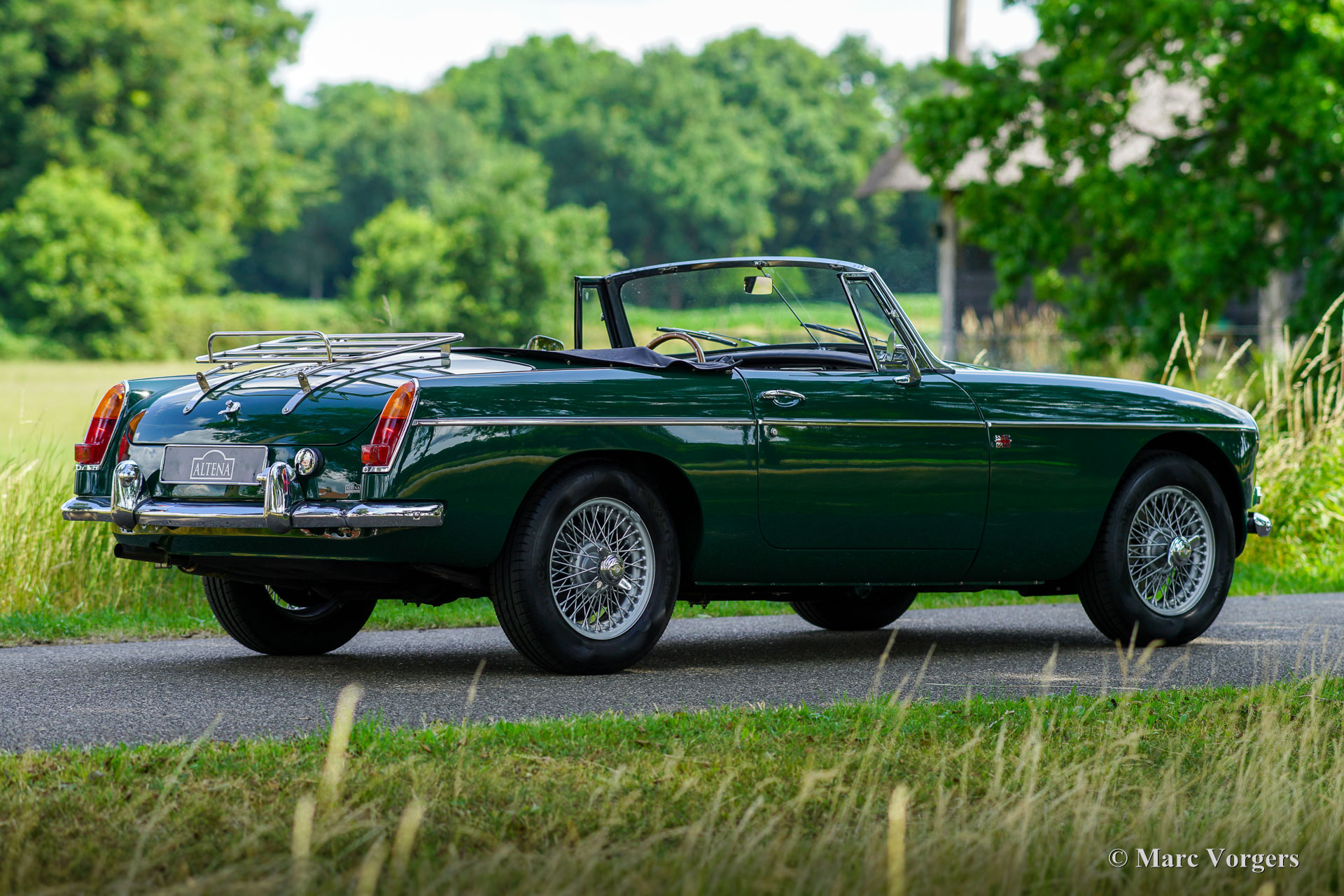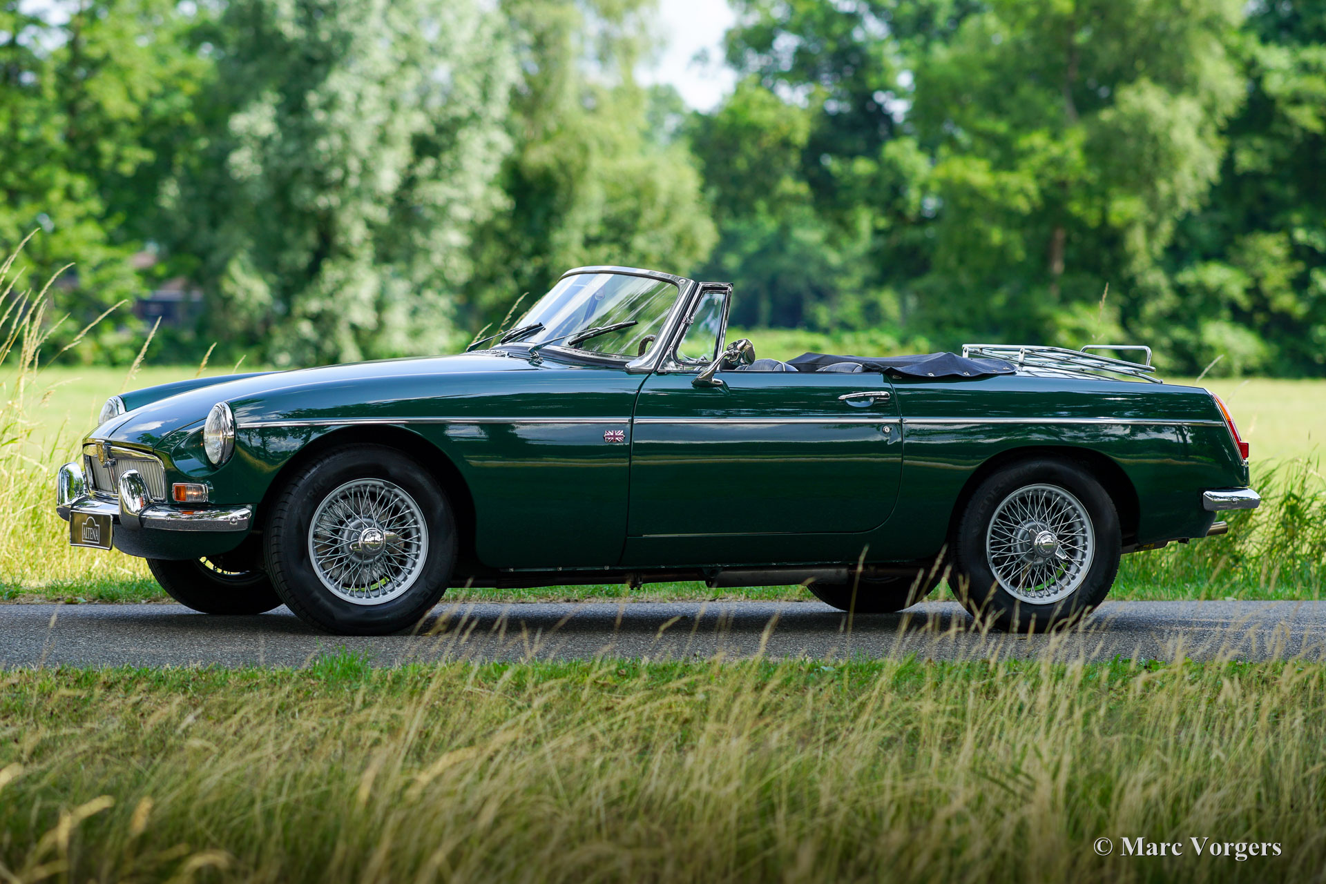 MG MGB Roadster, jaar 1965. Kleur British Racing Green gecombineerd met een zwartlederen interieur afgewerkt met witte biezen en zwart tapijt. Zwarte soft-top en hood-cover. Deze prachtige MGB roadster is nieuw verkocht in de VS, de auto is in 1996 naar Nederland verscheept. Na aankomst in Nederland is de auto naar het hoogst mogelijke niveau van perfectie gerestaureerd door Brooklands Classic Cars in Veenendaal. Een plaatje onder de motorkap bevestigt dit. Deze firma stond onder andere bekend om hun topklasse Jaguar XK-restauraties. De kwaliteit van de restauratie is in één oogopslag duidelijk... De passing van de plaatwerkdelen, de lak, het chroom, de afwerking tot in het kleinste detail... perfectie! Niet alleen de optiek is subliem, je voelt ook dat de auto met uiterste zorg is gebouwd. Deze MGB roadster verkeert in sublieme staat en rijdt perfect! Sinds de restauratie heeft de auto slechts 10.000 kilometer gereden en de auto heeft in de afgelopen 27 jaar slechts twee zorgvuldige eigenaren gekend. Deze schitterende MGB roadster is uitgerust met: Oliekoeler, S.U.-carburateurs, K&N Sport luchtfilters, zilver gelakte spaakwielen geschoeid met Vredestein 175/70 14 inch banden, een rvs-bagagerek, een rvs-uitlaatsysteem en een prachtig MotoLita sportstuur met houten rand. Deze stijlvolle MGB Roadster is een vroeg model met het begeerlijke metalen dashboard afgewerkt met zwarte krimplak. De MGB roadster is de meest praktische klassieke Britse roadster, een heerlijke metgezel voor zomerse avondritten en (vakantie) roadtrips! Dit is een topexemplaar!