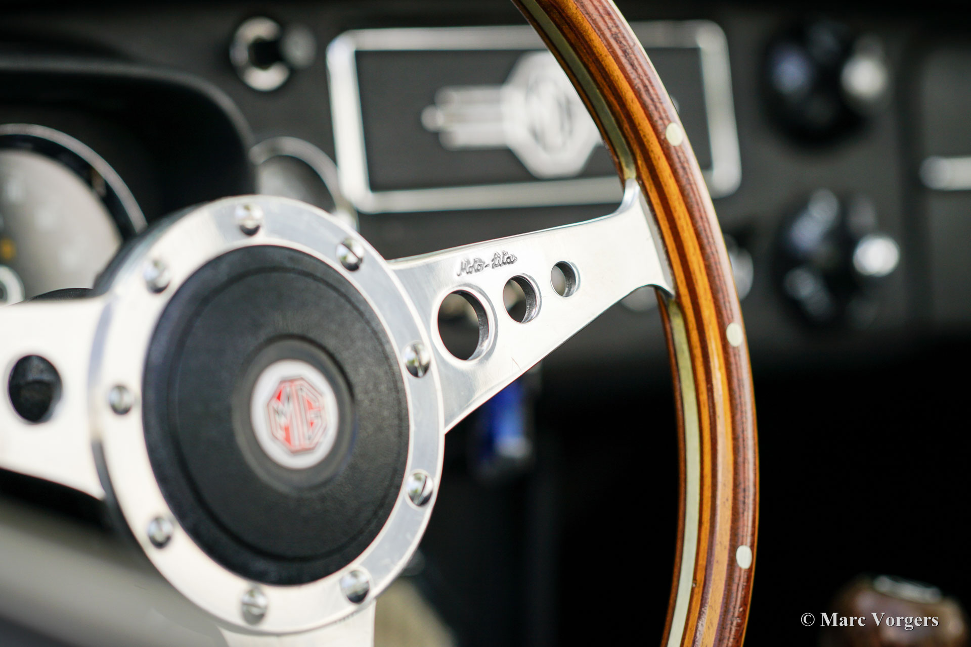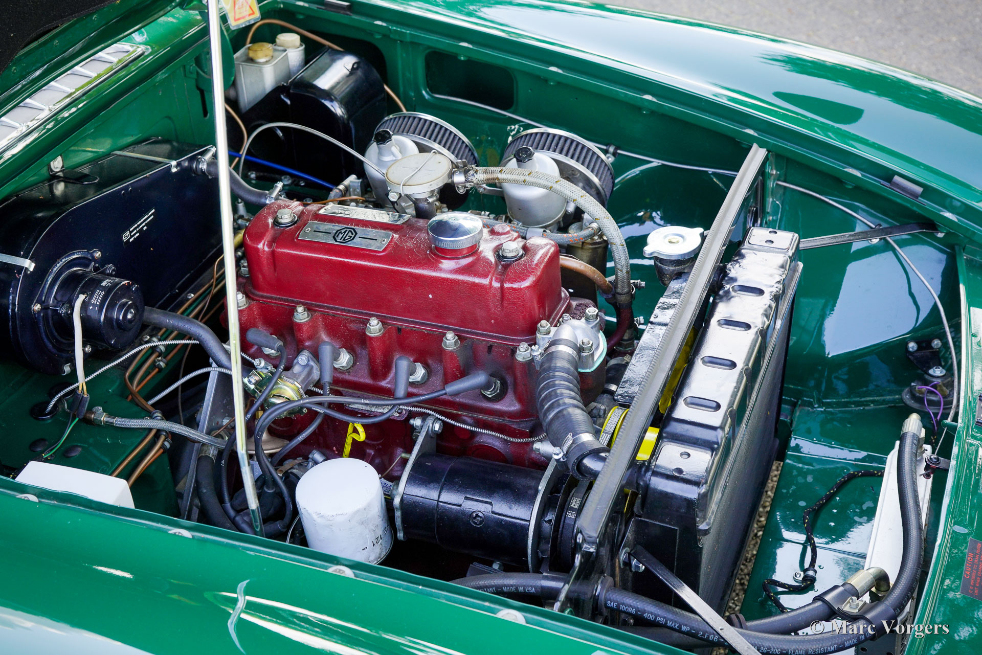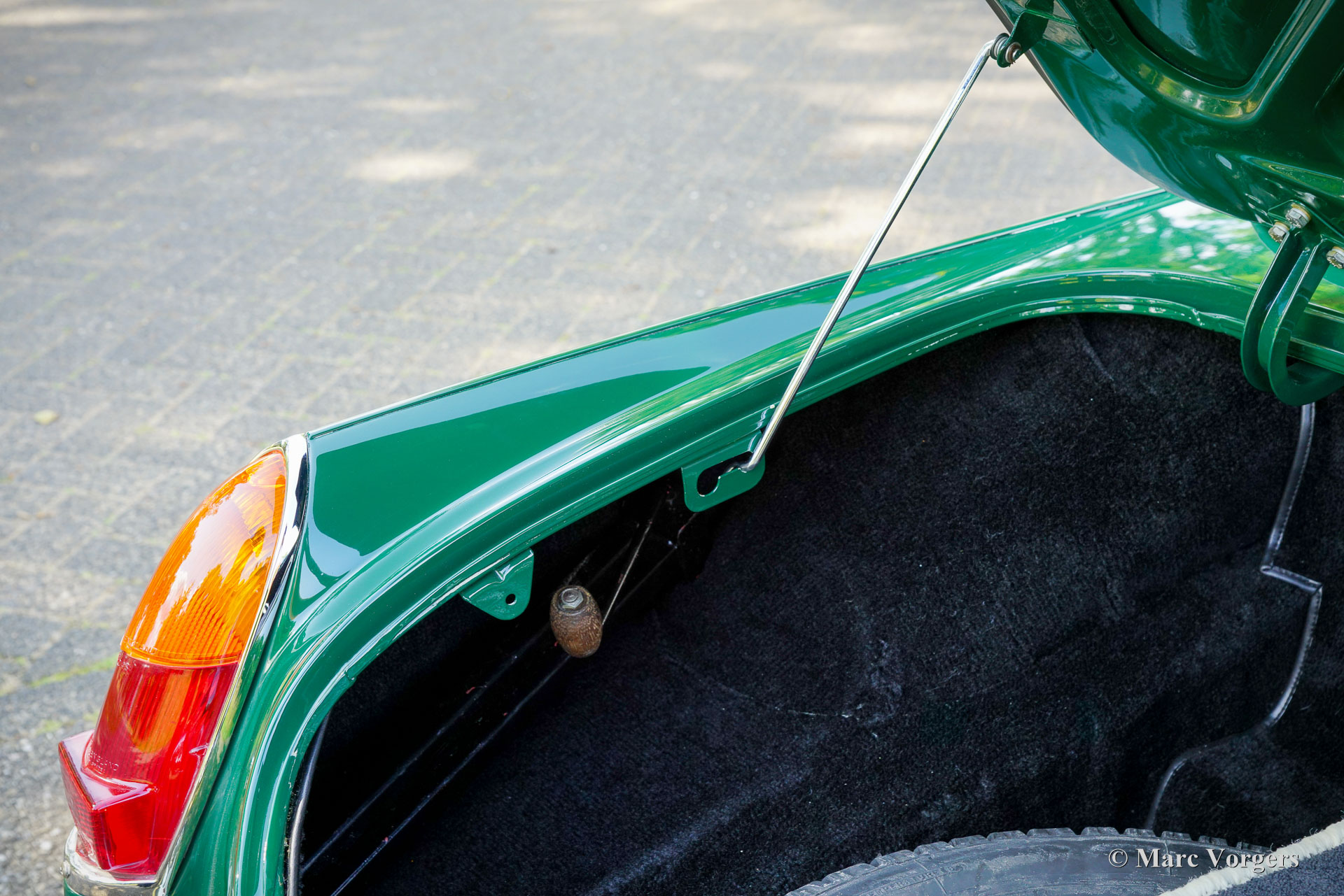 MG MGB Roadster, jaar 1965. Kleur British Racing Green gecombineerd met een zwartlederen interieur afgewerkt met witte biezen en zwart tapijt. Zwarte soft-top en hood-cover. Deze prachtige MGB roadster is nieuw verkocht in de VS, de auto is in 1996 naar Nederland verscheept. Na aankomst in Nederland is de auto naar het hoogst mogelijke niveau van perfectie gerestaureerd door Brooklands Classic Cars in Veenendaal. Een plaatje onder de motorkap bevestigt dit. Deze firma stond onder andere bekend om hun topklasse Jaguar XK-restauraties. De kwaliteit van de restauratie is in één oogopslag duidelijk... De passing van de plaatwerkdelen, de lak, het chroom, de afwerking tot in het kleinste detail... perfectie! Niet alleen de optiek is subliem, je voelt ook dat de auto met uiterste zorg is gebouwd. Deze MGB roadster verkeert in sublieme staat en rijdt perfect! Sinds de restauratie heeft de auto slechts 10.000 kilometer gereden en de auto heeft in de afgelopen 27 jaar slechts twee zorgvuldige eigenaren gekend. Deze schitterende MGB roadster is uitgerust met: Oliekoeler, S.U.-carburateurs, K&N Sport luchtfilters, zilver gelakte spaakwielen geschoeid met Vredestein 175/70 14 inch banden, een rvs-bagagerek, een rvs-uitlaatsysteem en een prachtig MotoLita sportstuur met houten rand. Deze stijlvolle MGB Roadster is een vroeg model met het begeerlijke metalen dashboard afgewerkt met zwarte krimplak. De MGB roadster is de meest praktische klassieke Britse roadster, een heerlijke metgezel voor zomerse avondritten en (vakantie) roadtrips! Dit is een topexemplaar!