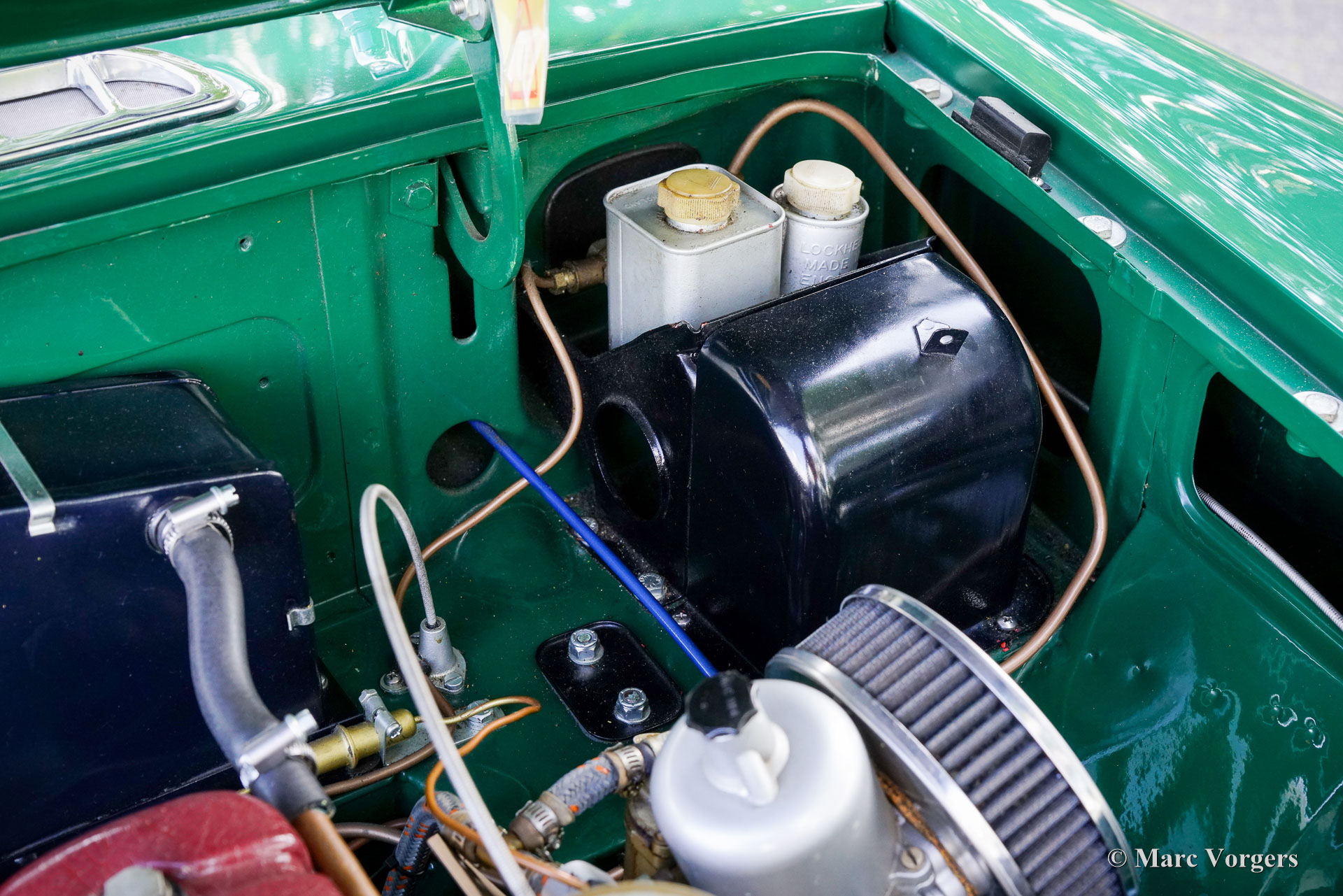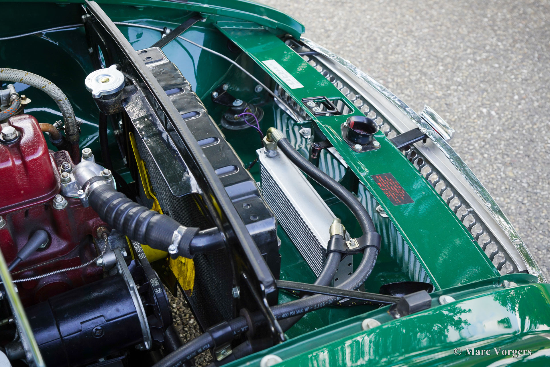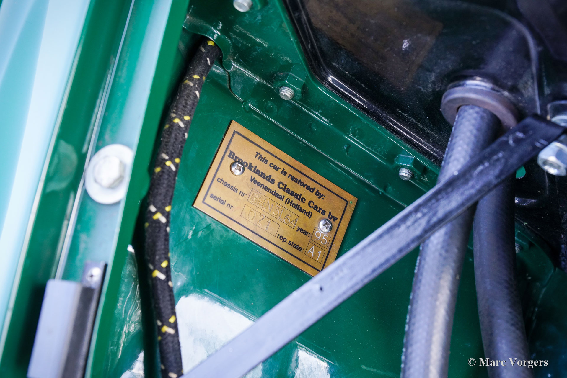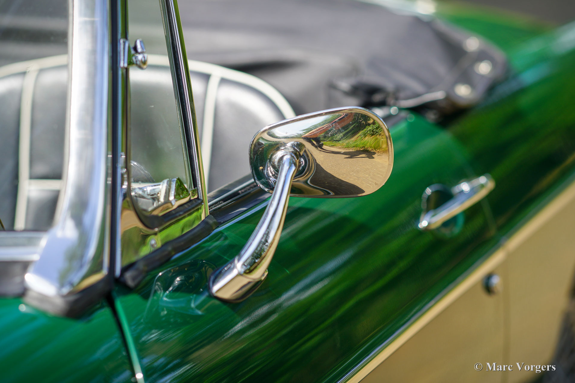 MG MGB Roadster, jaar 1965. Kleur British Racing Green gecombineerd met een zwartlederen interieur afgewerkt met witte biezen en zwart tapijt. Zwarte soft-top en hood-cover. Deze prachtige MGB roadster is nieuw verkocht in de VS, de auto is in 1996 naar Nederland verscheept. Na aankomst in Nederland is de auto naar het hoogst mogelijke niveau van perfectie gerestaureerd door Brooklands Classic Cars in Veenendaal. Een plaatje onder de motorkap bevestigt dit. Deze firma stond onder andere bekend om hun topklasse Jaguar XK-restauraties. De kwaliteit van de restauratie is in één oogopslag duidelijk... De passing van de plaatwerkdelen, de lak, het chroom, de afwerking tot in het kleinste detail... perfectie! Niet alleen de optiek is subliem, je voelt ook dat de auto met uiterste zorg is gebouwd. Deze MGB roadster verkeert in sublieme staat en rijdt perfect! Sinds de restauratie heeft de auto slechts 10.000 kilometer gereden en de auto heeft in de afgelopen 27 jaar slechts twee zorgvuldige eigenaren gekend. Deze schitterende MGB roadster is uitgerust met: Oliekoeler, S.U.-carburateurs, K&N Sport luchtfilters, zilver gelakte spaakwielen geschoeid met Vredestein 175/70 14 inch banden, een rvs-bagagerek, een rvs-uitlaatsysteem en een prachtig MotoLita sportstuur met houten rand. Deze stijlvolle MGB Roadster is een vroeg model met het begeerlijke metalen dashboard afgewerkt met zwarte krimplak. De MGB roadster is de meest praktische klassieke Britse roadster, een heerlijke metgezel voor zomerse avondritten en (vakantie) roadtrips! Dit is een topexemplaar!